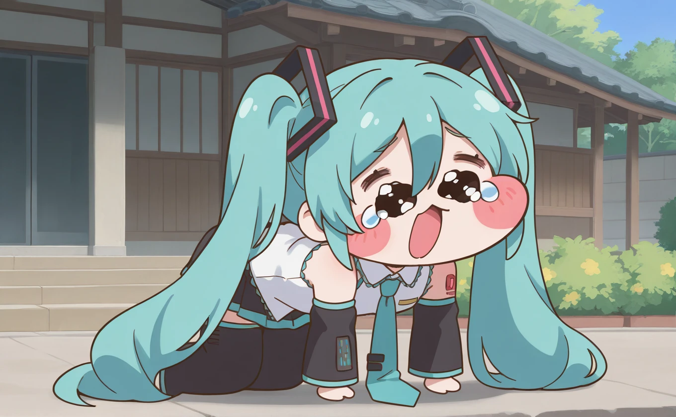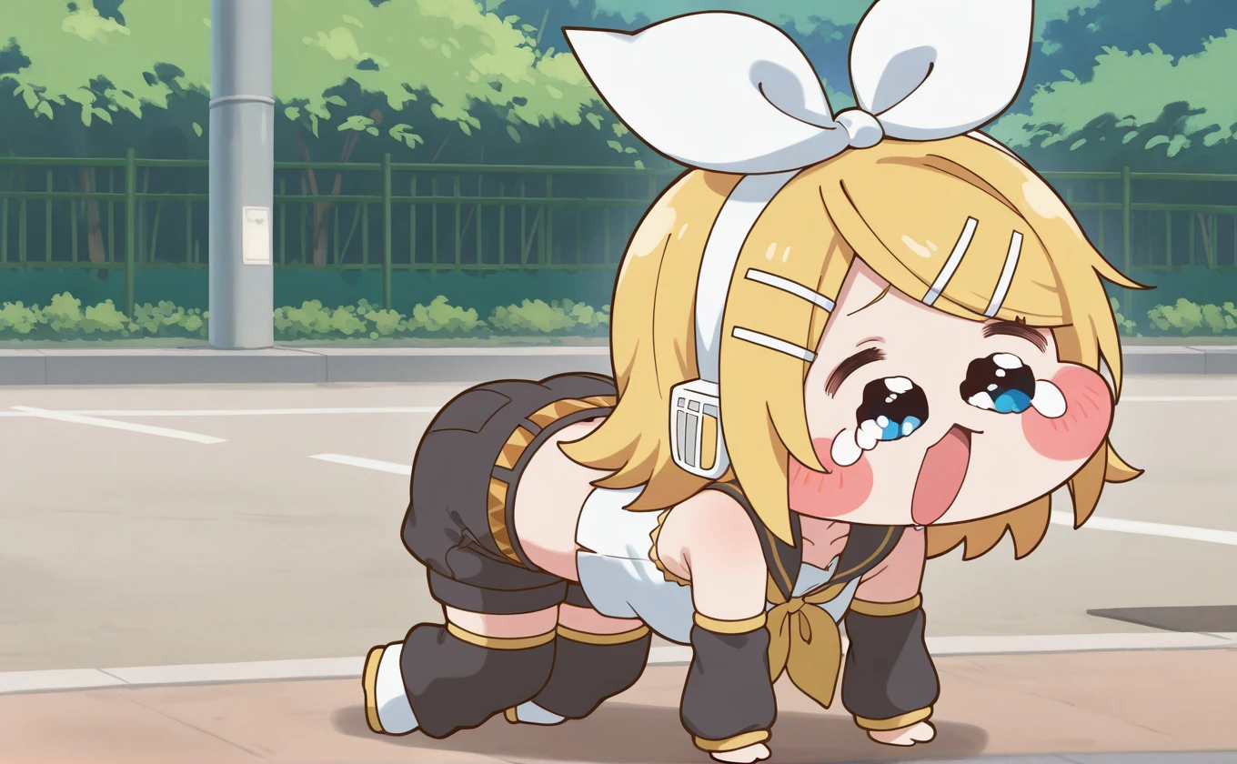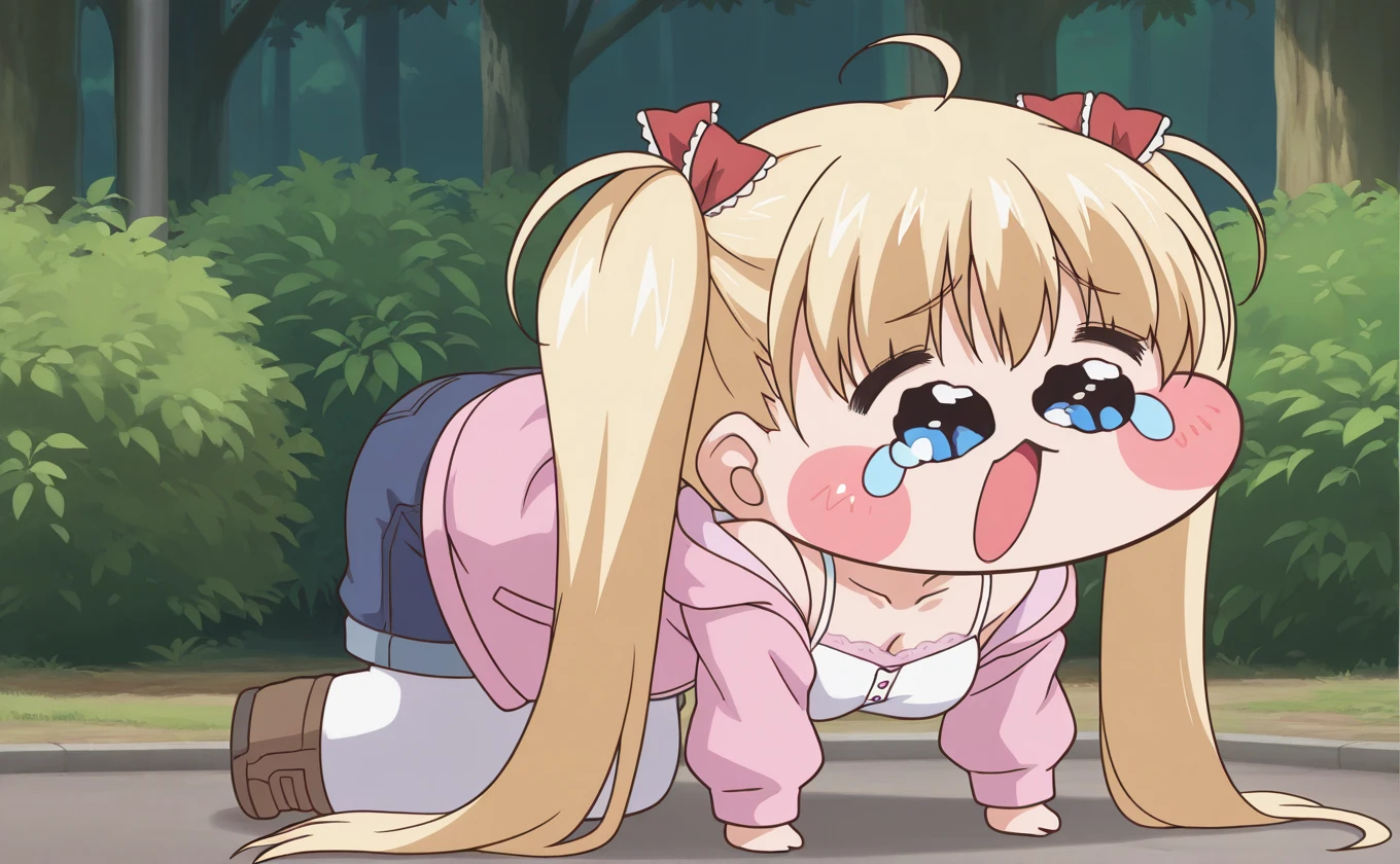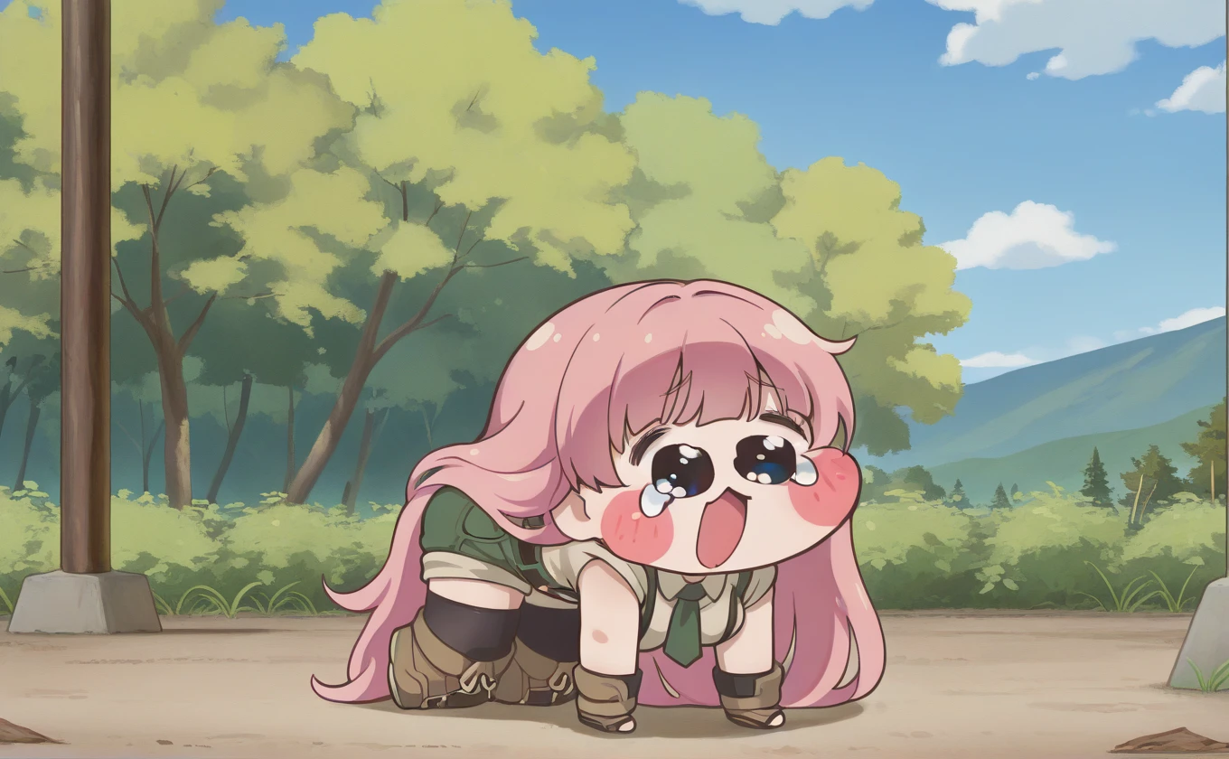 Speakiposting [meme],(chibi:1.5),full body,all fours,blush stickers,tears,open mouth这是嘟嘟脸恶作剧 [斯皮奇 求饶]画风。