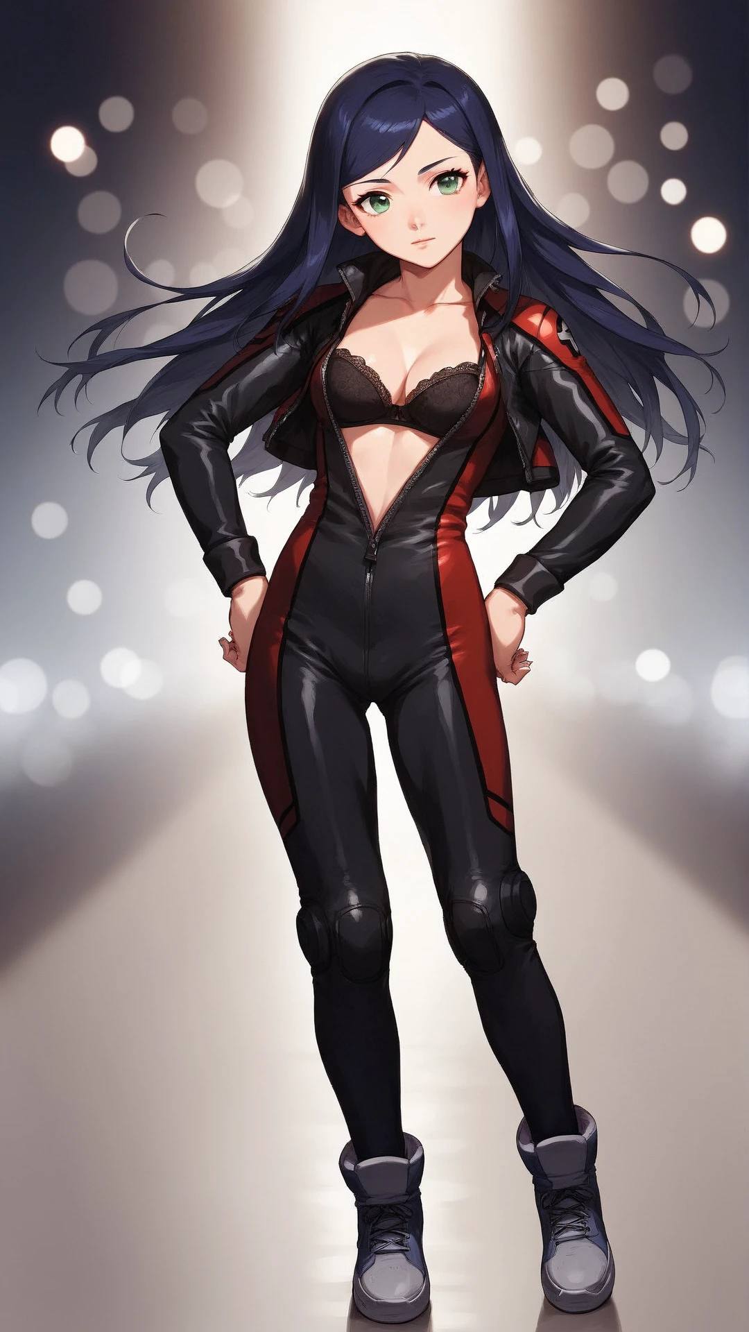 kuga_natsuki, an anime girl, 1girl, solo, long hair, underwear, green eyes, open clothes, bra, bodysuit, lingerie, biker clothes, bikesuit