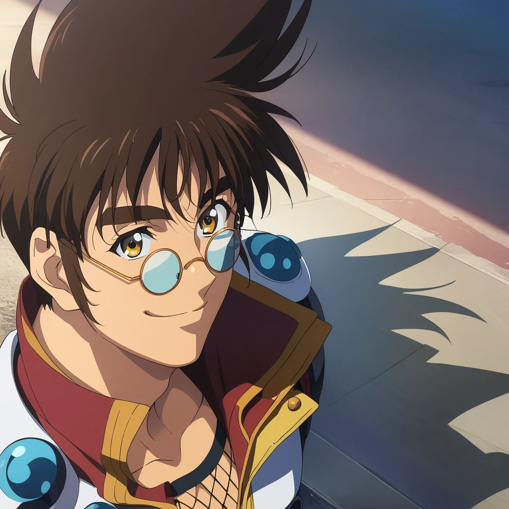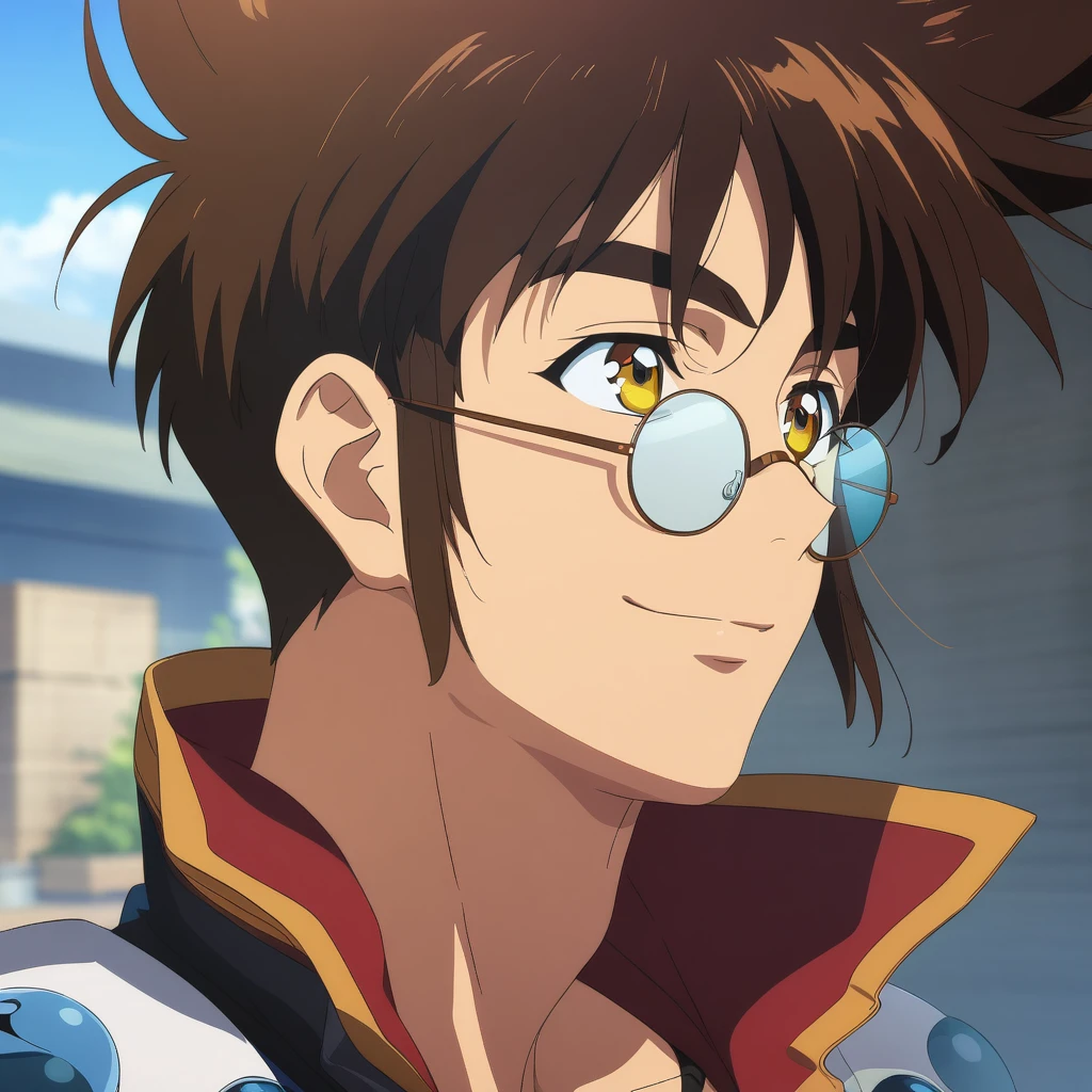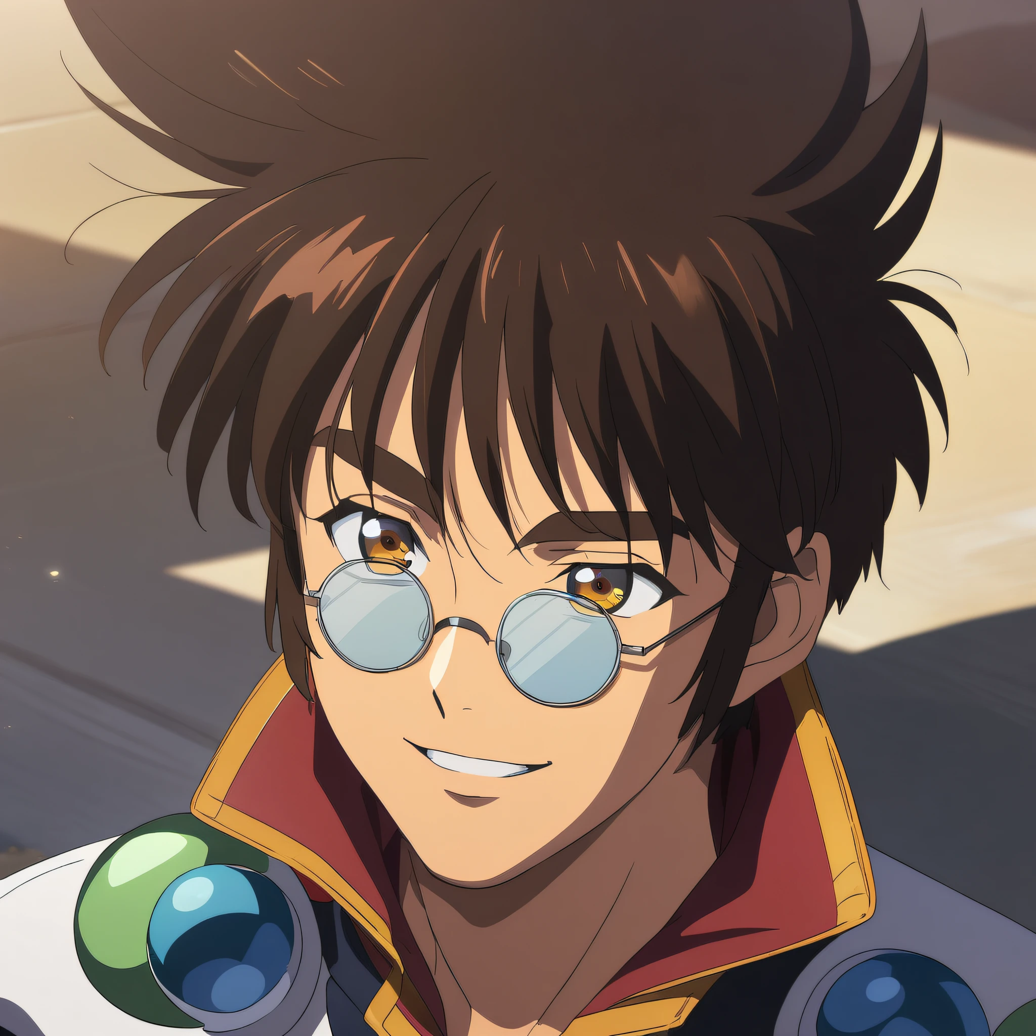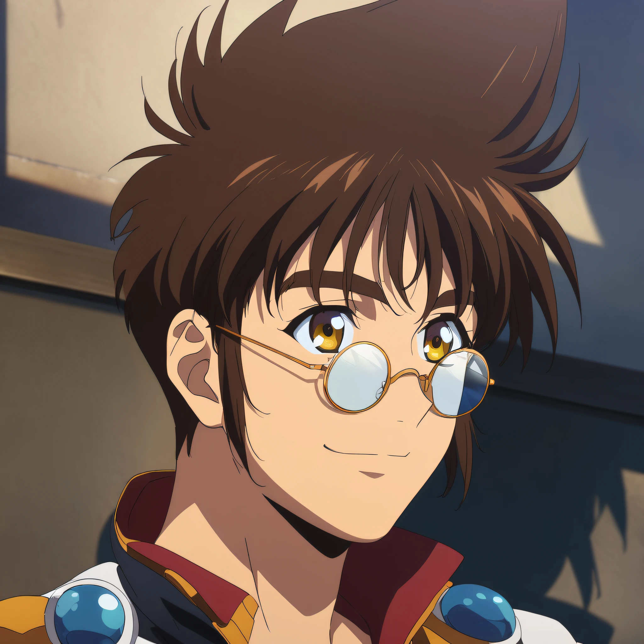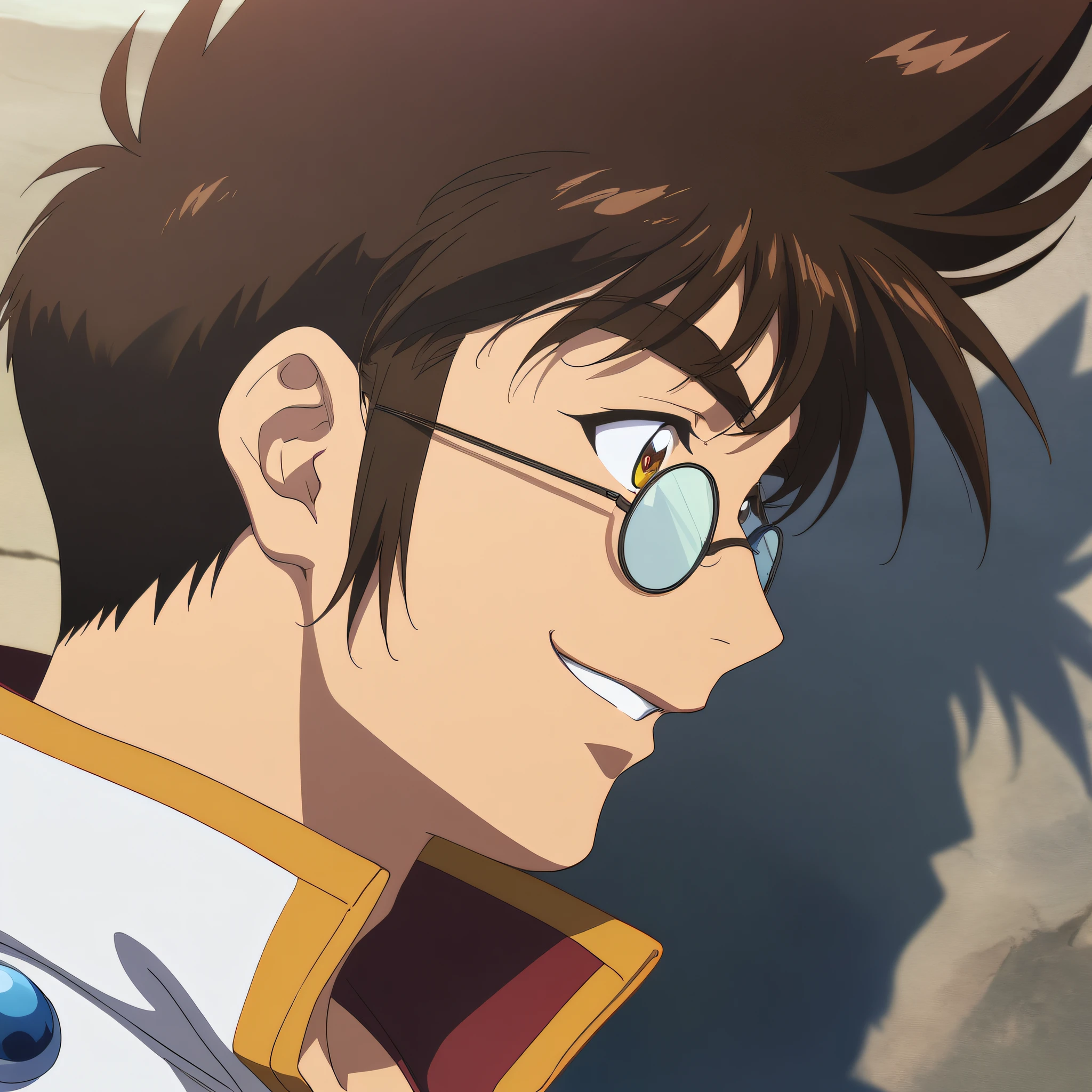 Combined booru style. Activation tag is "nekki_basara, 1boy, solo, brown hair, yellow eyes, glasses, white shirt, black jacket, white jeans, "