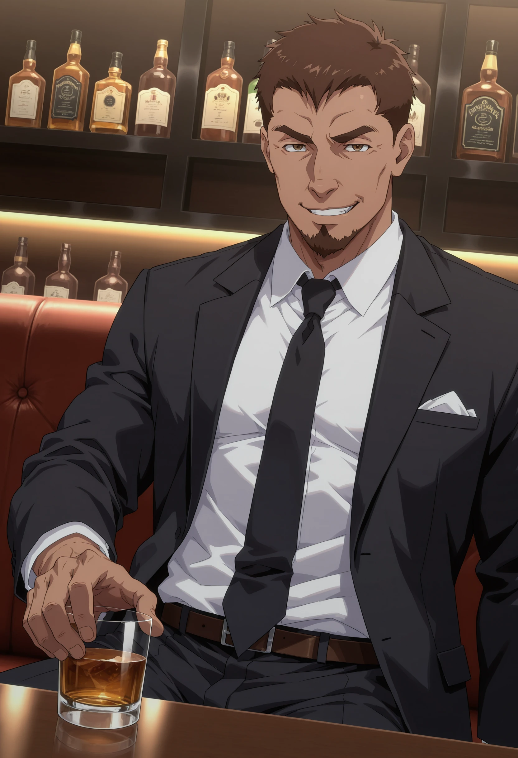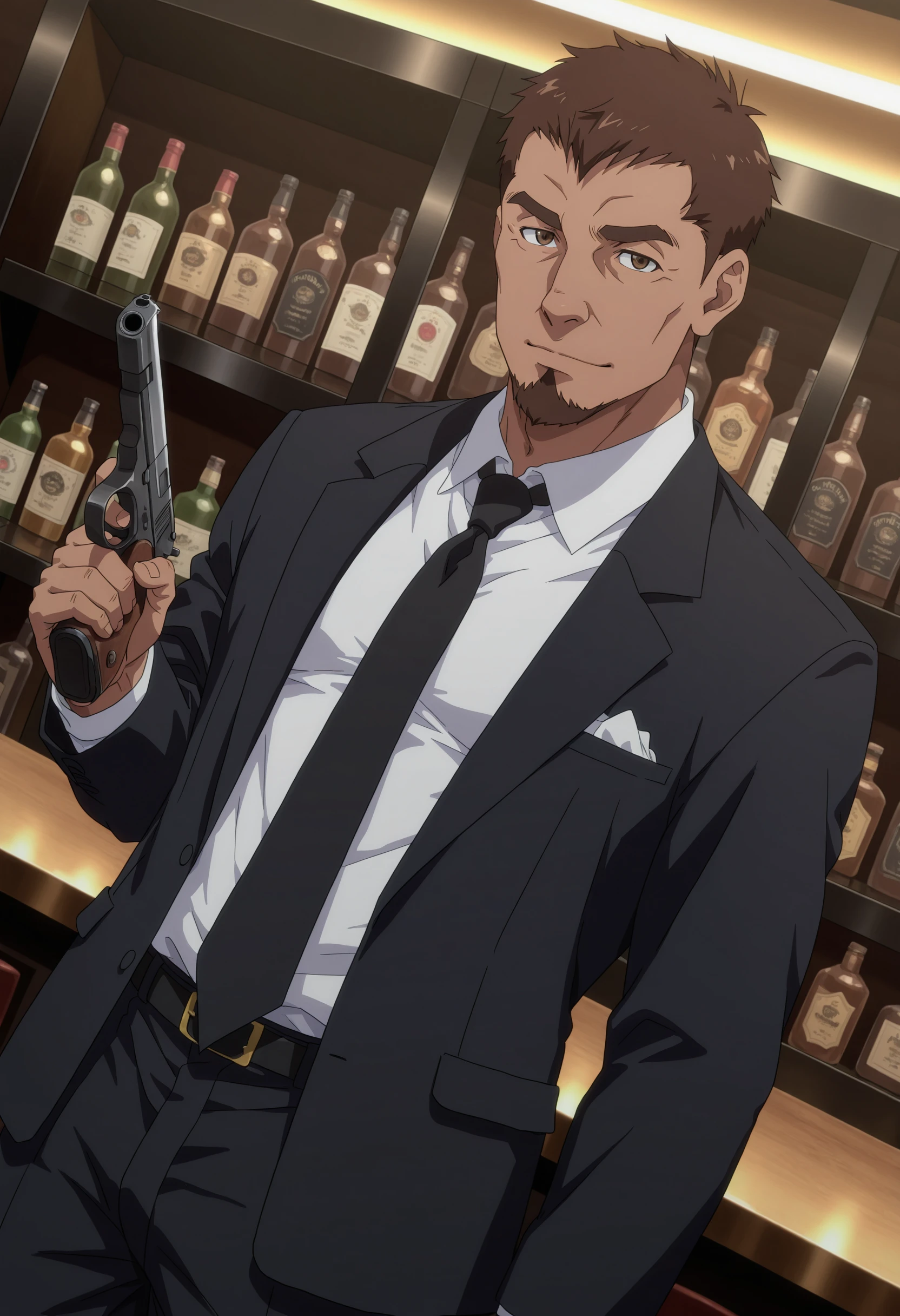short brown hair, brown eyes, goatee, black suit, black pants, white shirt, black necktie,