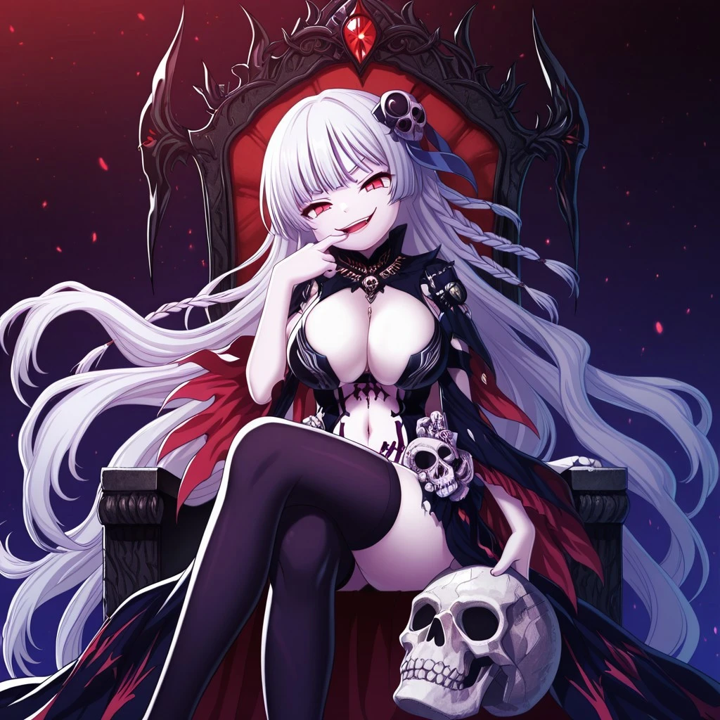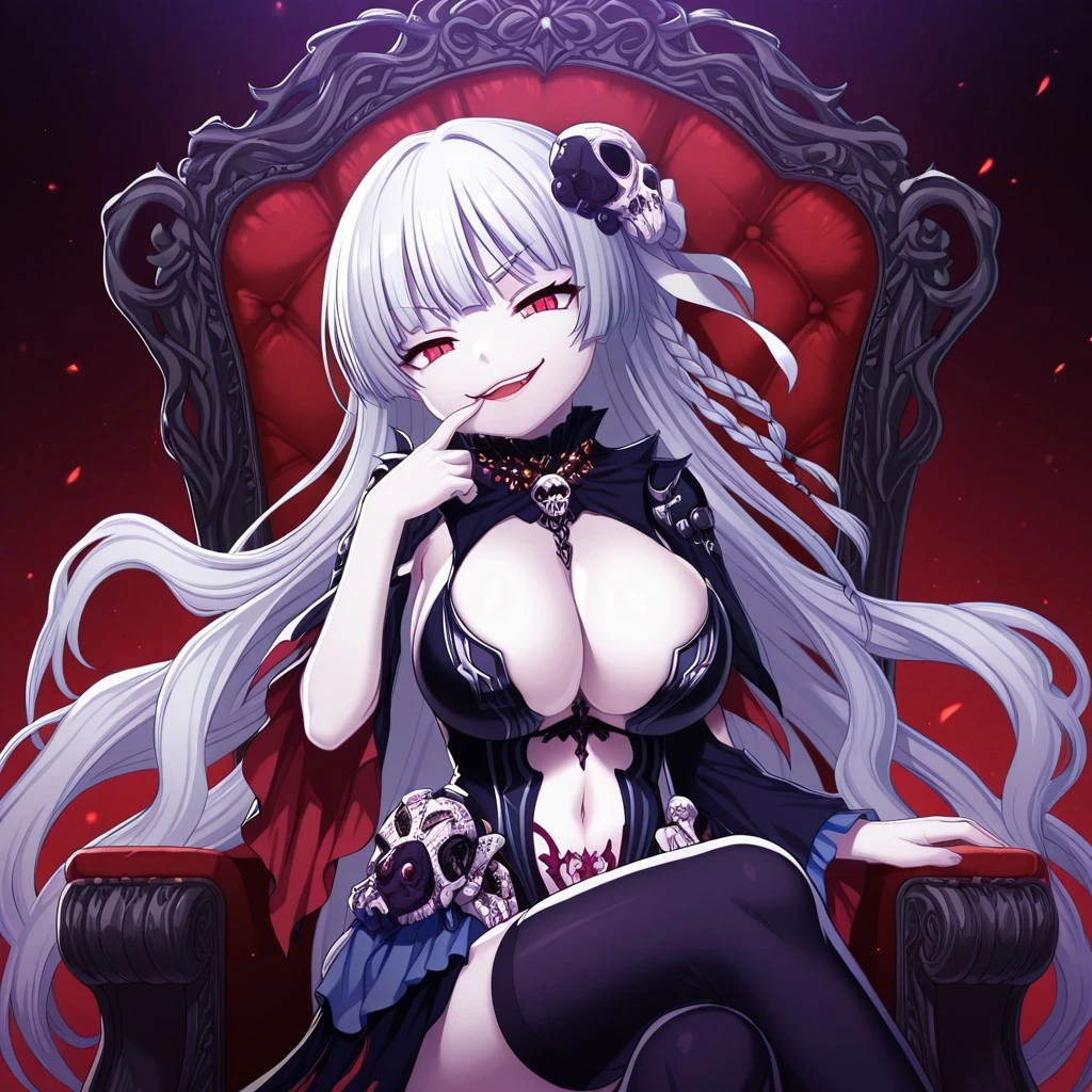 Outfit 3: 1girl, mature women, long hair, white hair, twin braids, red eyes, black sklera, black teardrop mark, huge breasts, pale skin, thorny crown, coral crown, half face veil, feather collar, pearl neglace, revealing clothes, strappy outfit, detached sleeves, brown arm straps, black thigh highs, torn thigh highs, garter straps, open skirt, wide skirt, skull ornaments, bark ornaments, black high heels,