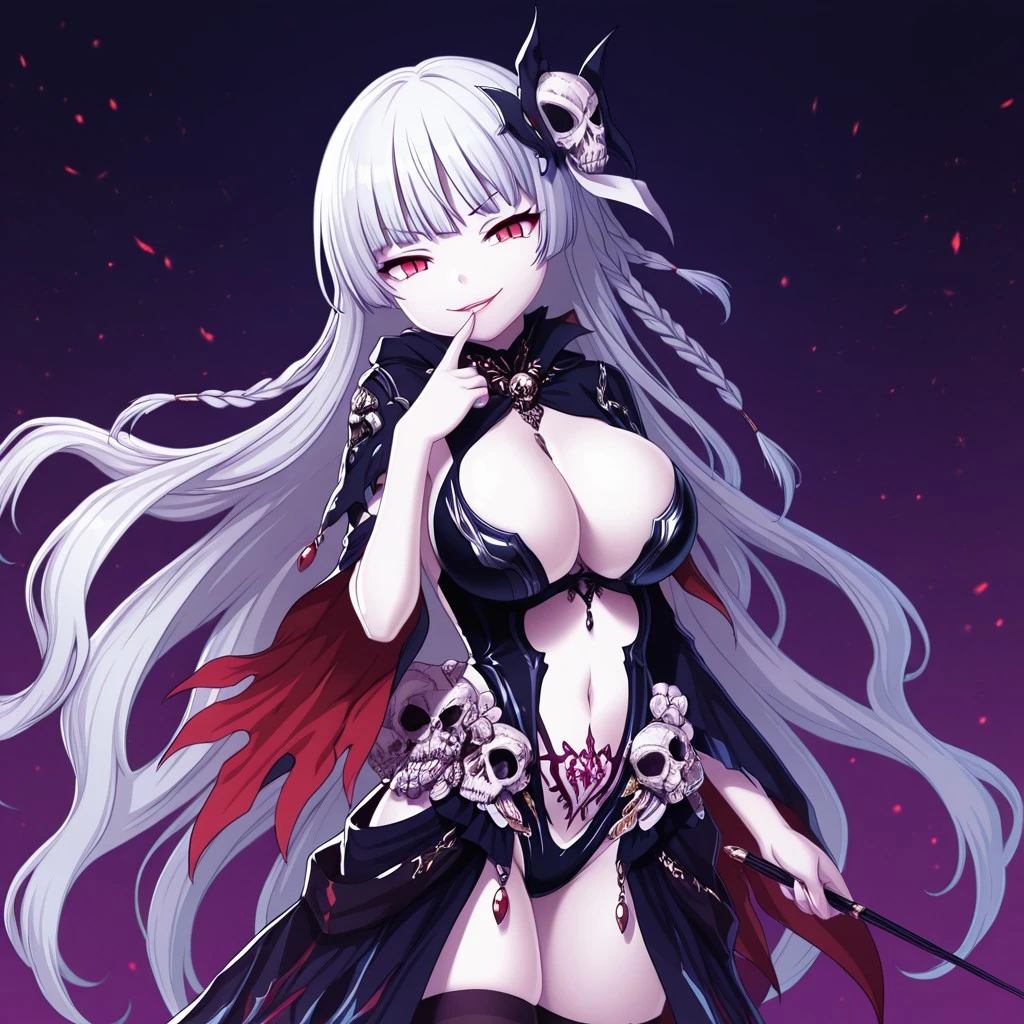 Outfit 2: 1girl, very long hair, white hair, twin braids, hair ornament, red eyes, slit pupils, large breasts, pale skin, black top, center opening, cleavage, navel, womb tattoo, black collar, skull belt, detached sleeves, flared sleeves, torn sleeves, very long waist cape, petaled waist cape, ornaments, black thigh highs,