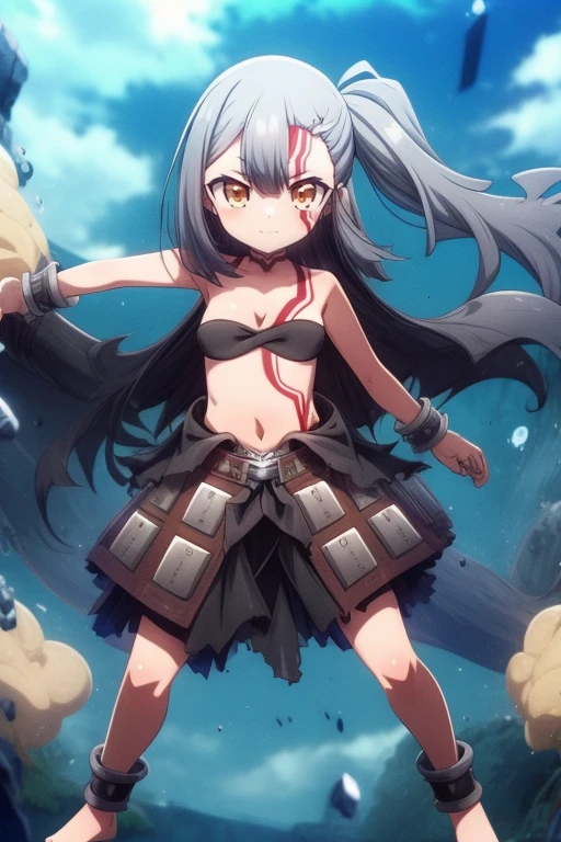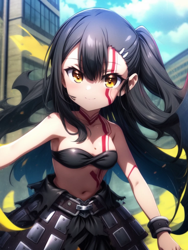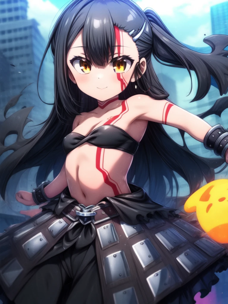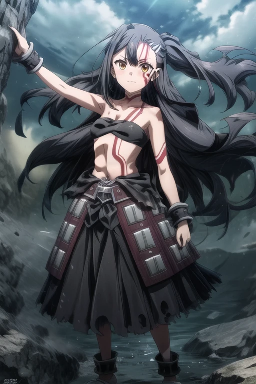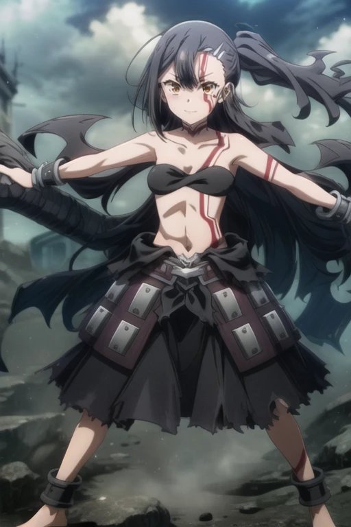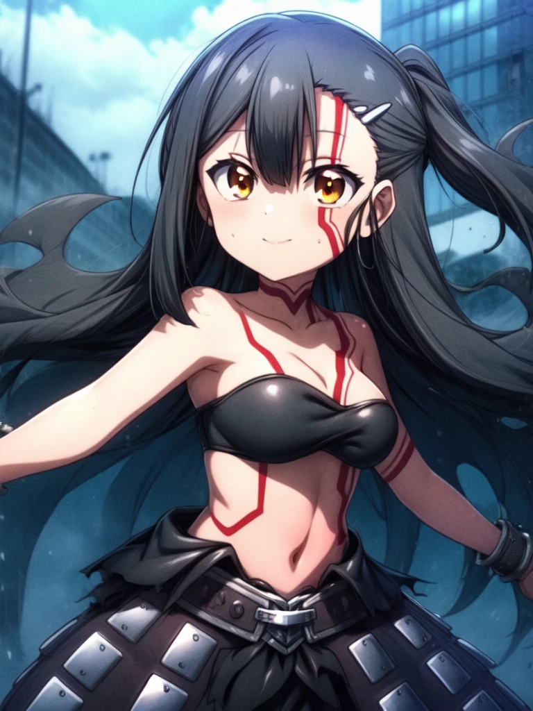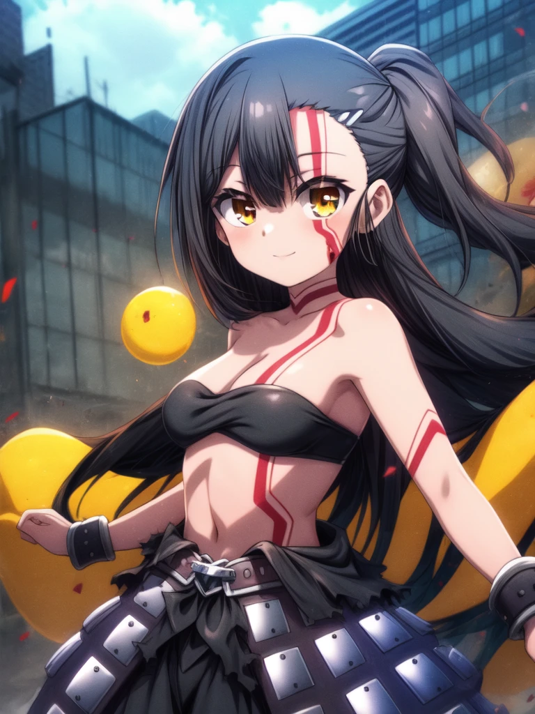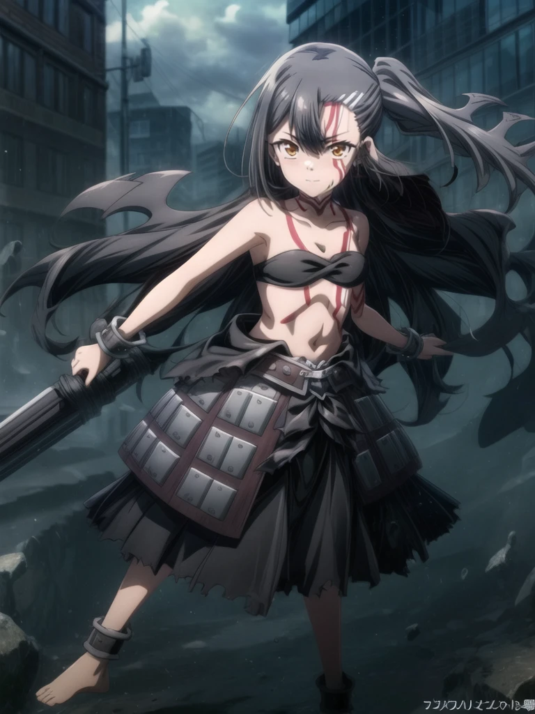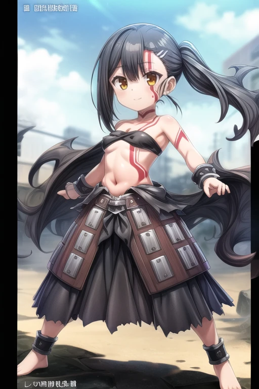 anime style,long hair,black hair,bare shoulders,hair ornament,brown eyes.bangs,tattoo,looking at viewer,small breasts,strapless,cloud,belt,outdoors,anime coloring,closed mouth,very long hair,High Waist skirt,torn clothes,midriff,cuffs,smile,black high waist skirt,yellow eyes,large breast,barefoot,blush,side ponytail,blood,shackles,hair between eyes,stomach,orange eyes,facepaint,