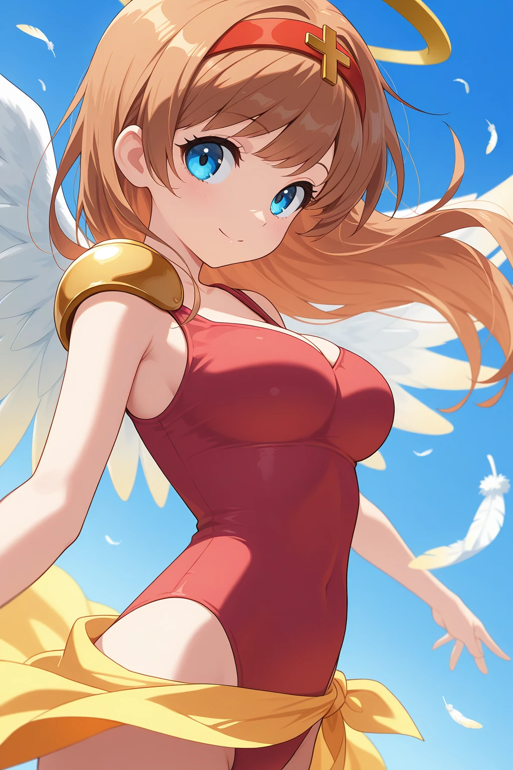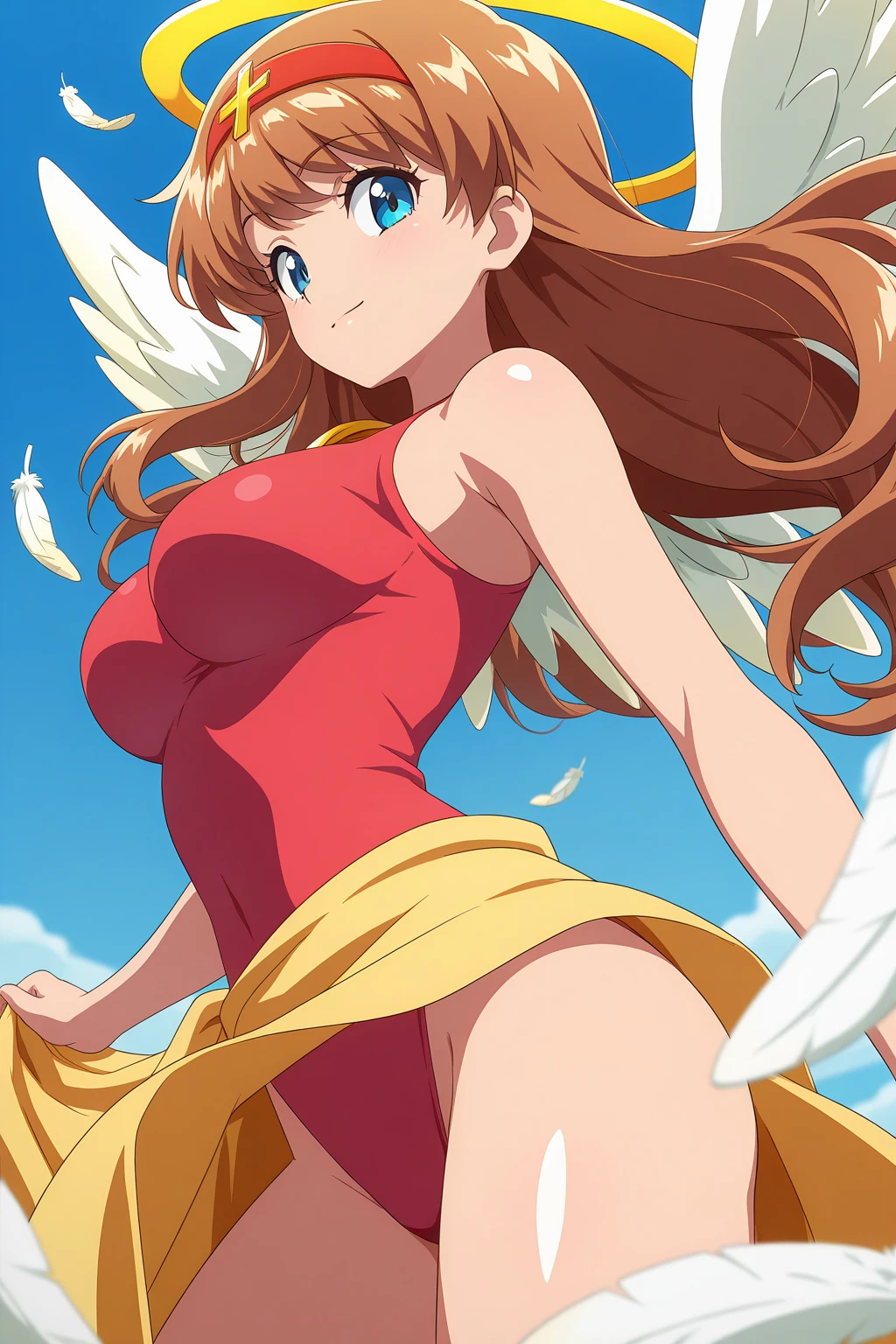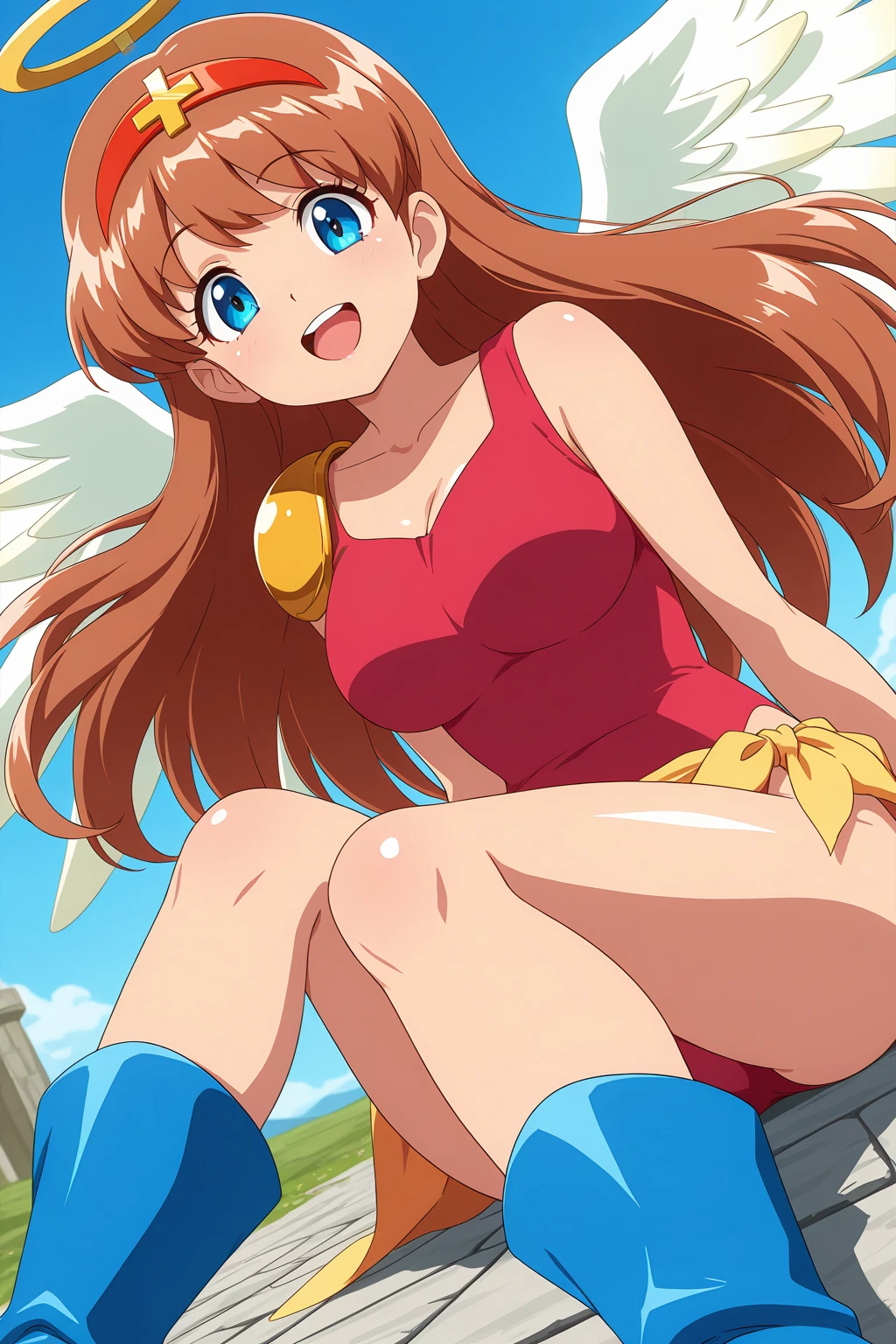JTBM, long hair, brown hair, blue eyes, eyelashes, bare shoulders, breasts, halo, red hairband, cross hair ornament, red leotard, single pauldron, yellow sarong, blue boots, angel wings