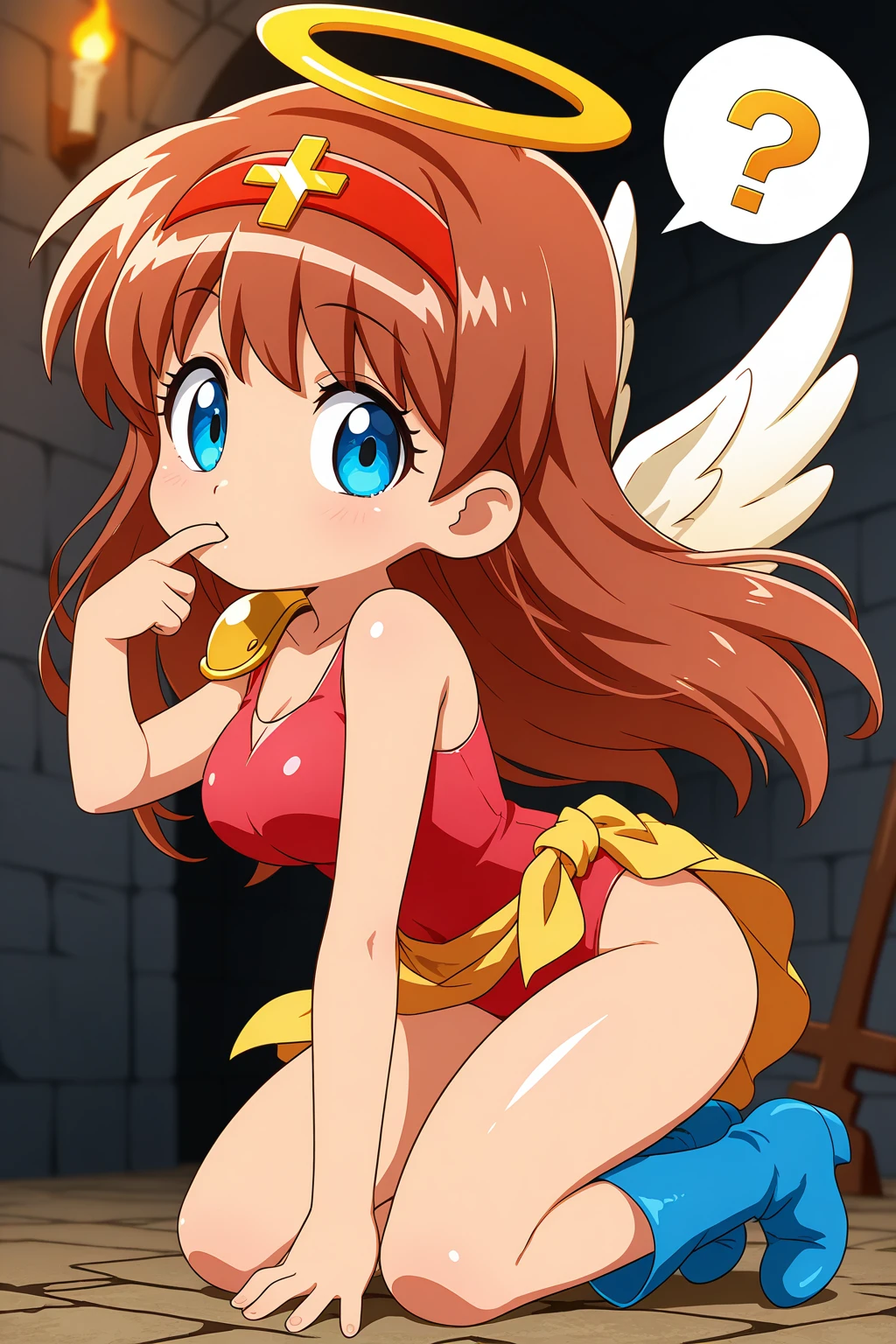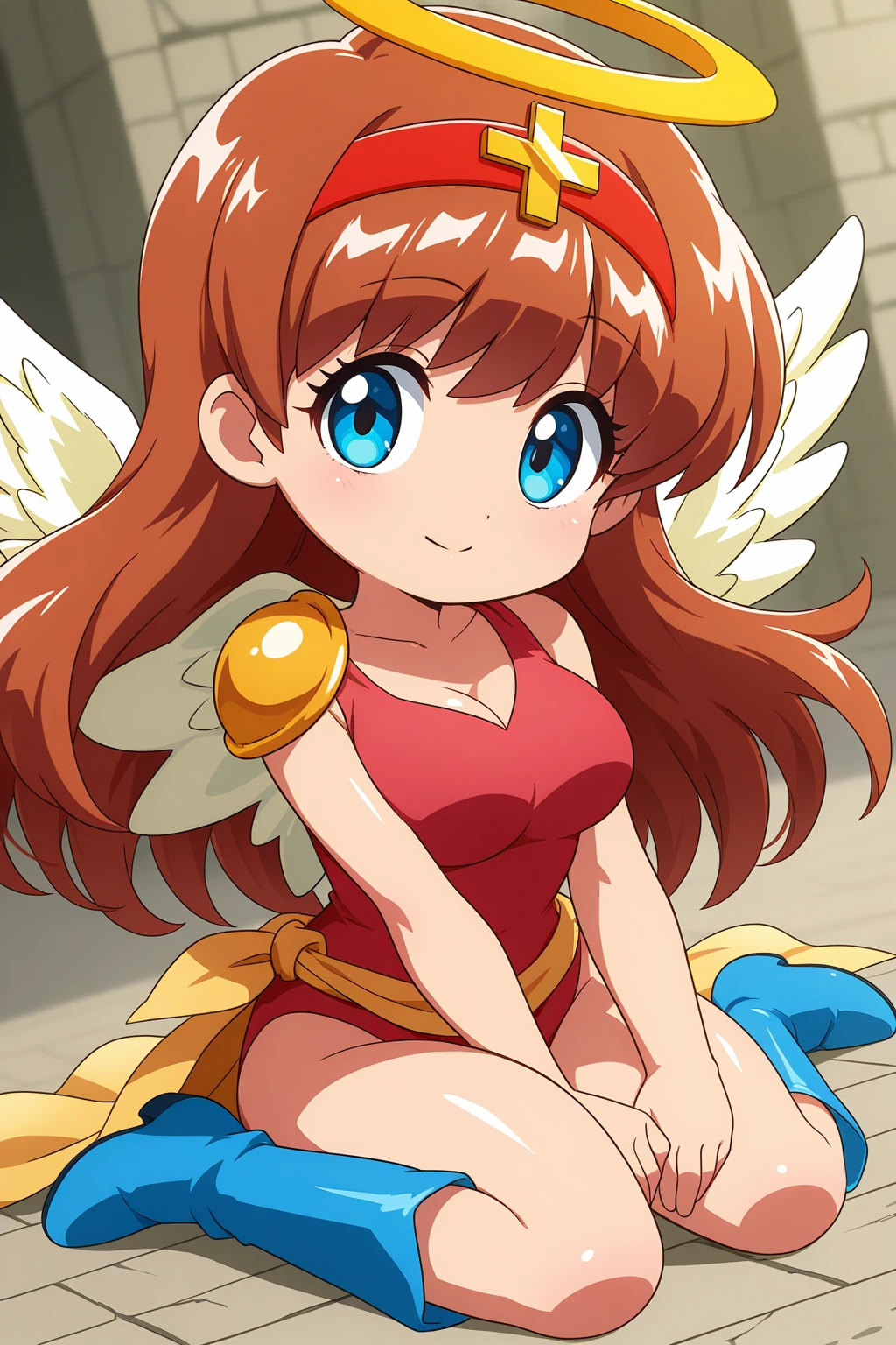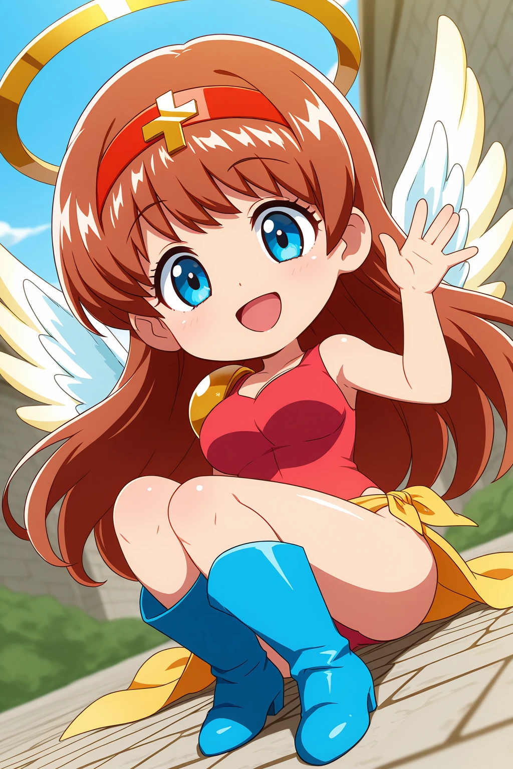 JTBM, long hair, brown hair, blue eyes, eyelashes, bare shoulders, breasts, halo, red hairband, cross hair ornament, red leotard, single pauldron, yellow sarong, blue boots, angel wings