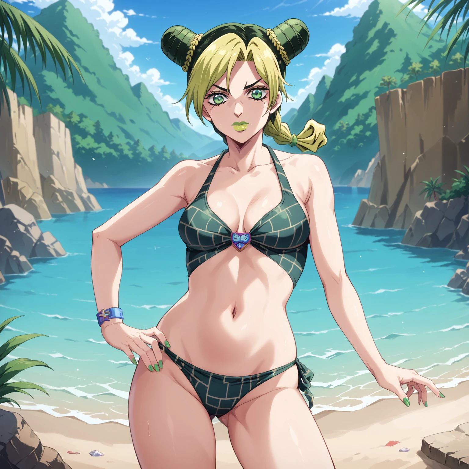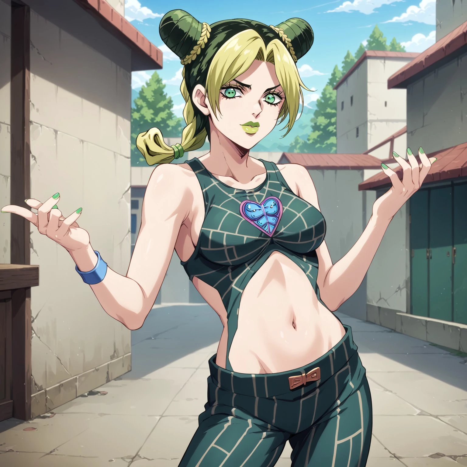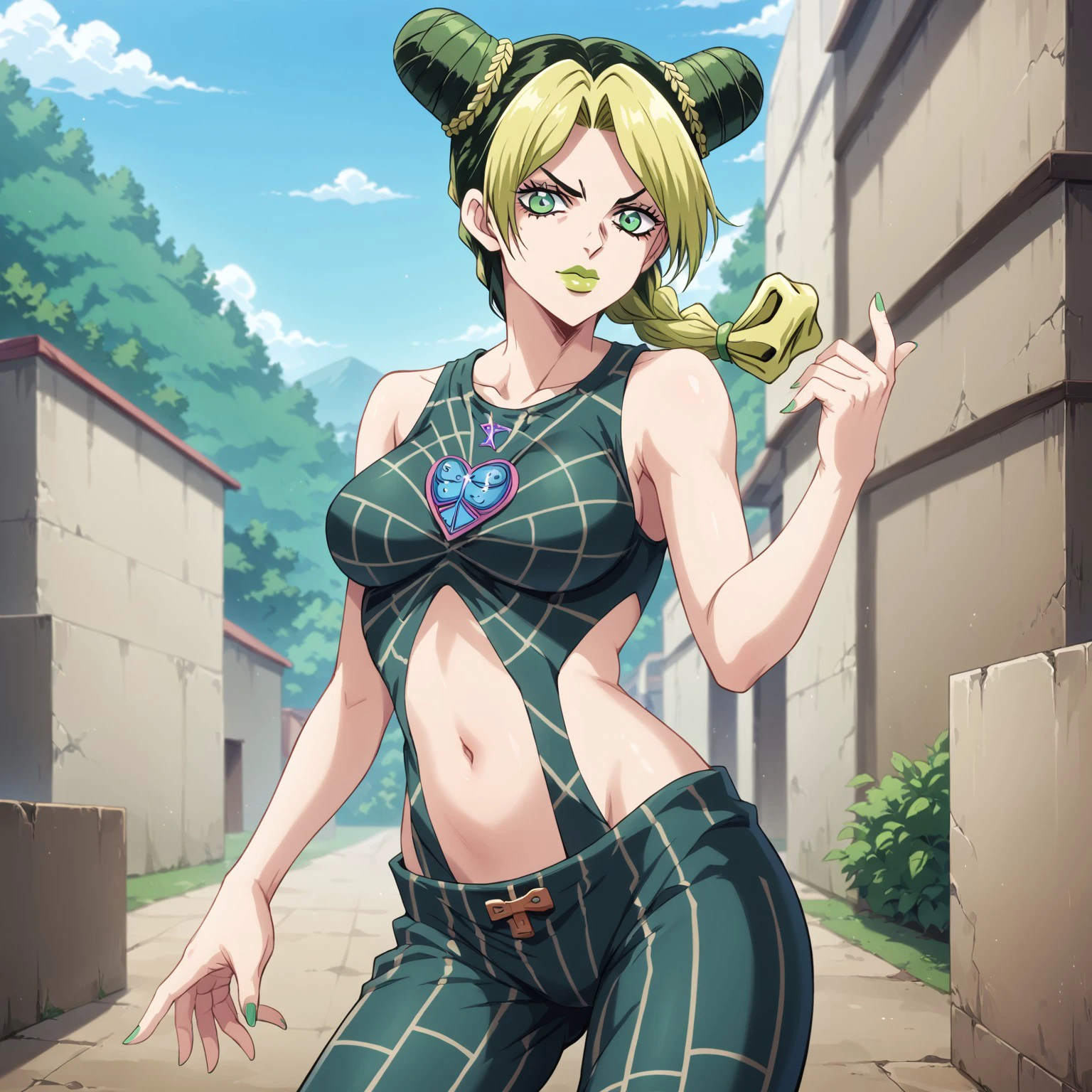 this is a model for jolyne kujo from jojo's bizarre adventure, use tags like "jolyne kujo, jojo's bizarre adventure, green eyes, two-tone hair, green hair, black hair, double bun, braided bun, braided ponytail, green lips, lipstick, make up, green nails, nail polish, spider web print, midriff" for best results,