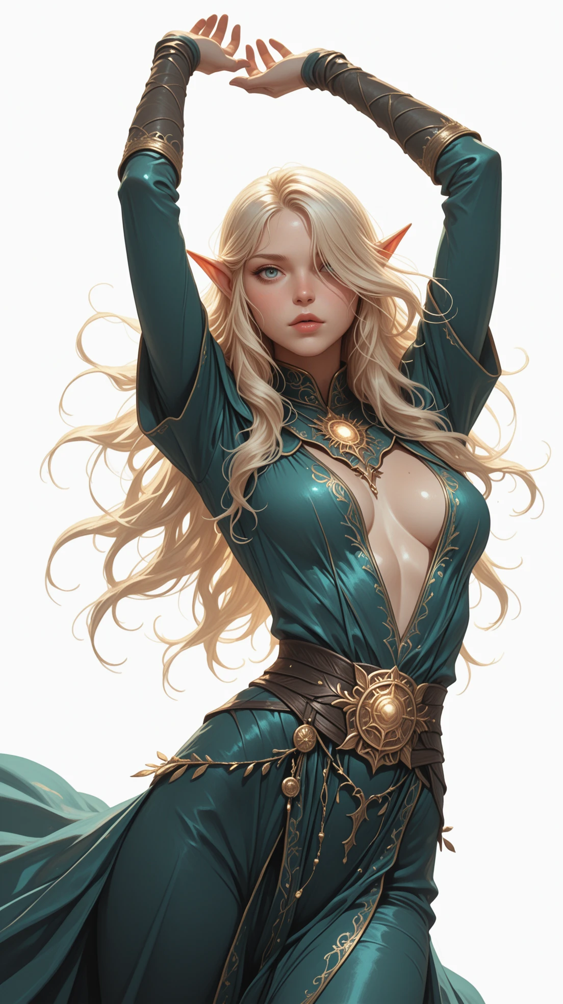 LoS-Eliris, 1girl, solo, alluring_woman, young_adult_woman, mediterranean_ethnicity, female_elf, long_wavy_blonde_hair, hair_over_one_eye, white_blonde_eyelashes, blue_bright_contrast_eyes, detailed_beautiful_eyes, bright_fair_eyes, long_pointy_elf_ears, bright_face, pale_skin, soft_complexion, smooth_hyper-detailed_skin, skin_pores, dreamy_relaxed_gaze, slender_toned_physique, flat_midriff, perfect_flat_stomach, visible_abdominal_definition, pink_blush, small_nose, glossy_lips, closed_mouth, , (hair_over_one_eye:1.5), -, teal_floor-length_dress, long_gown, gold_embroidery, sun-shaped_gold_emblem_on_, deep_neckline, long_teal_fabric_arm_warmers_with_golden_stripes,