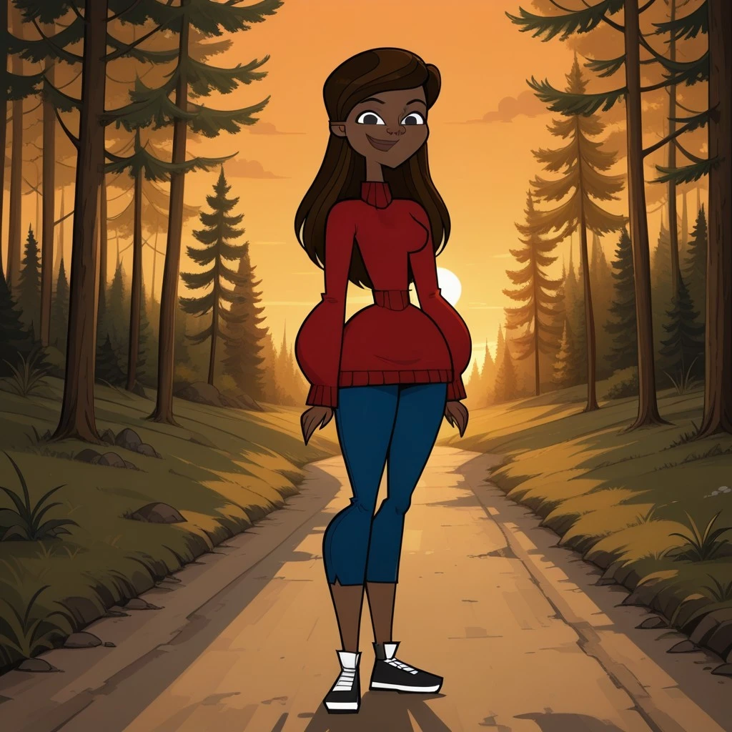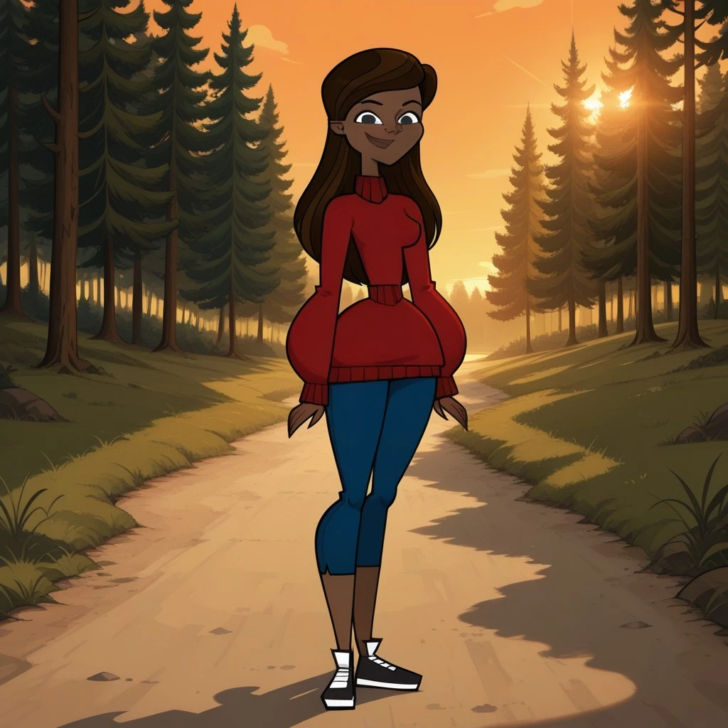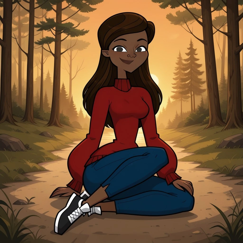 GabbyDC, 1girl, dark skin, dark-skinned female, brown hair, black eyes, red sweater, turtleneck, blue pants, sneakers