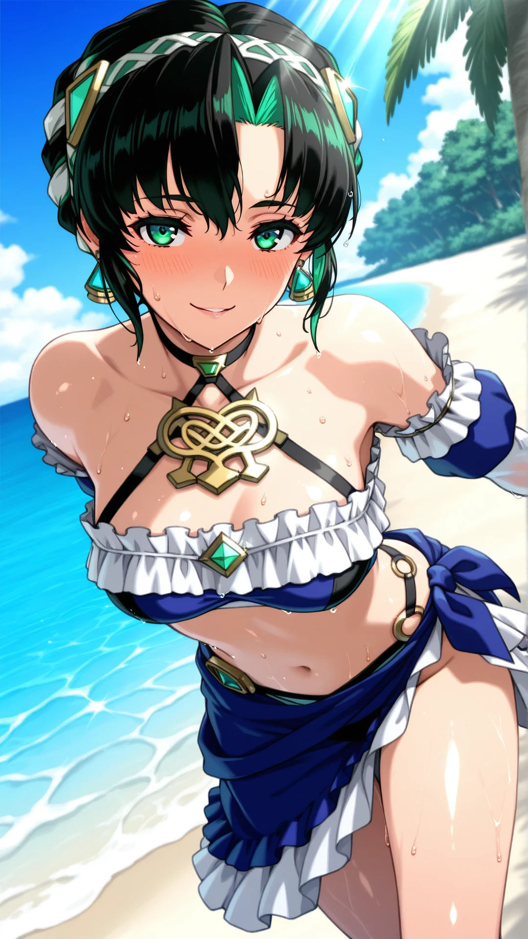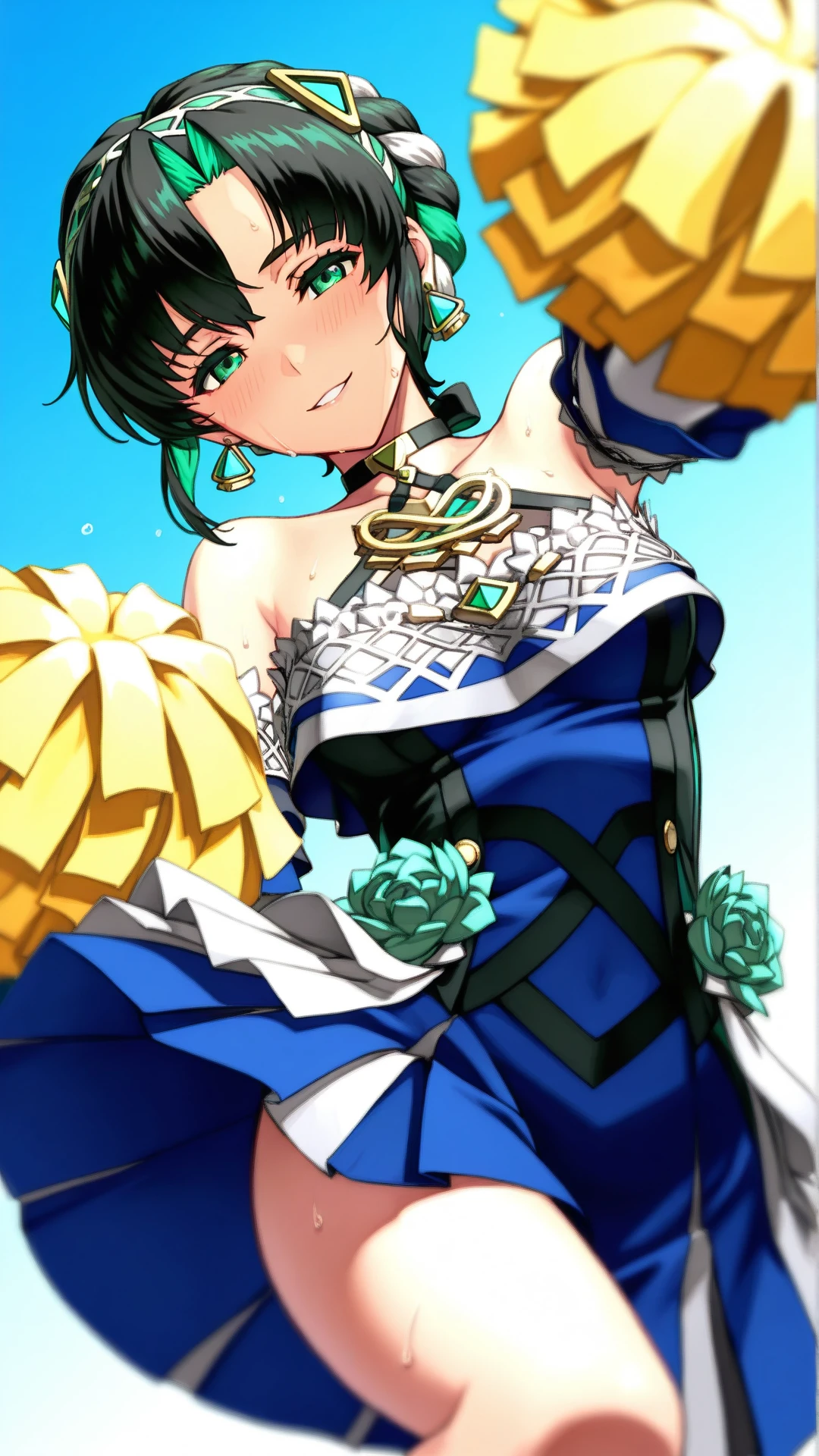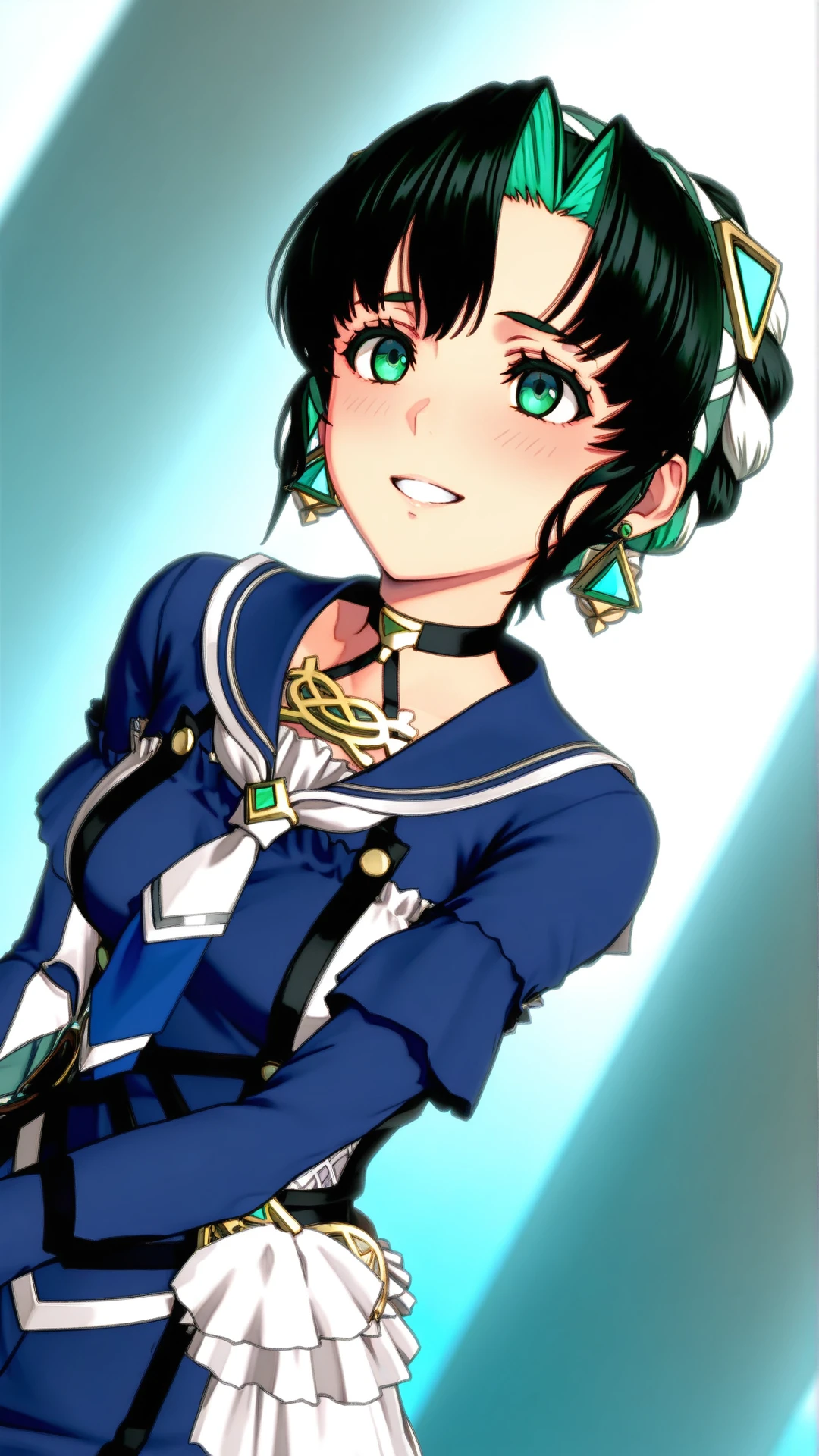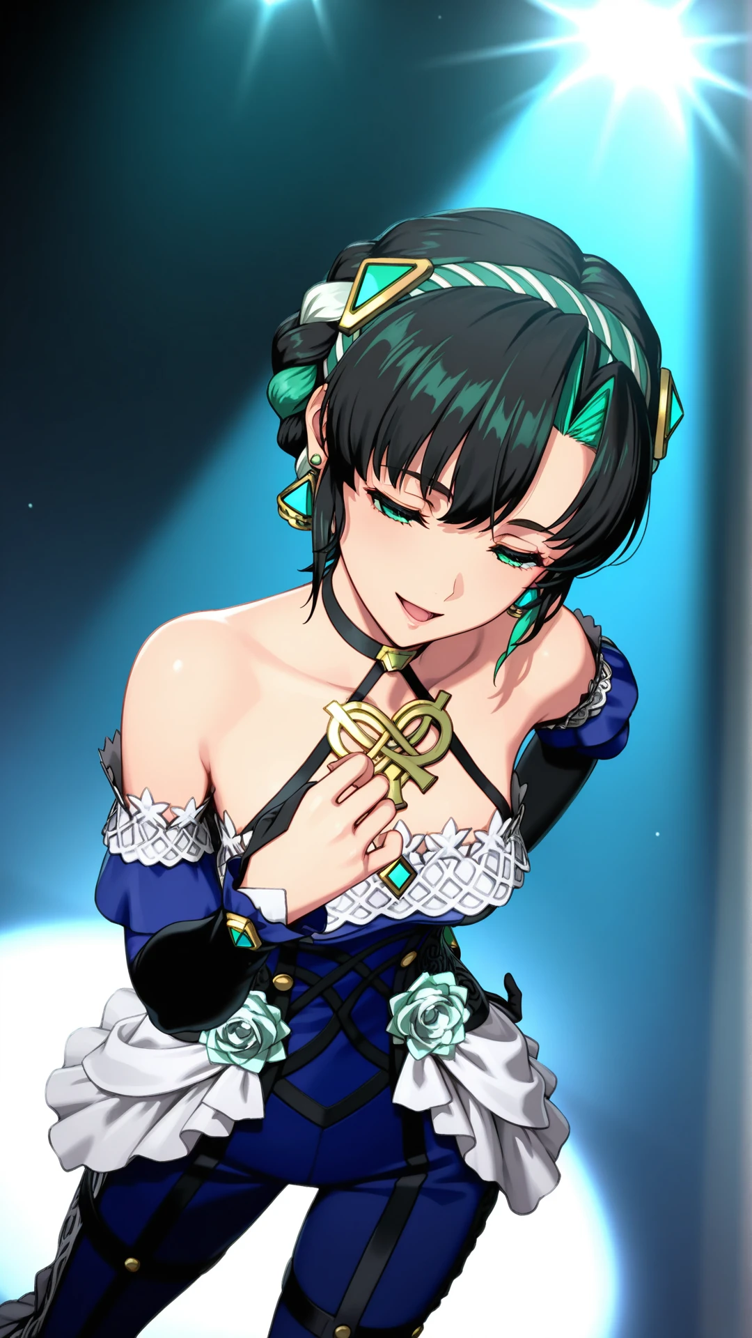 diva_no5\(saga_eb\),black hair, green eyes, short hair, green hair, multicolored hair, two-tone hair, makeup, eyeshadow, hair ornament, jewelry, earrings,