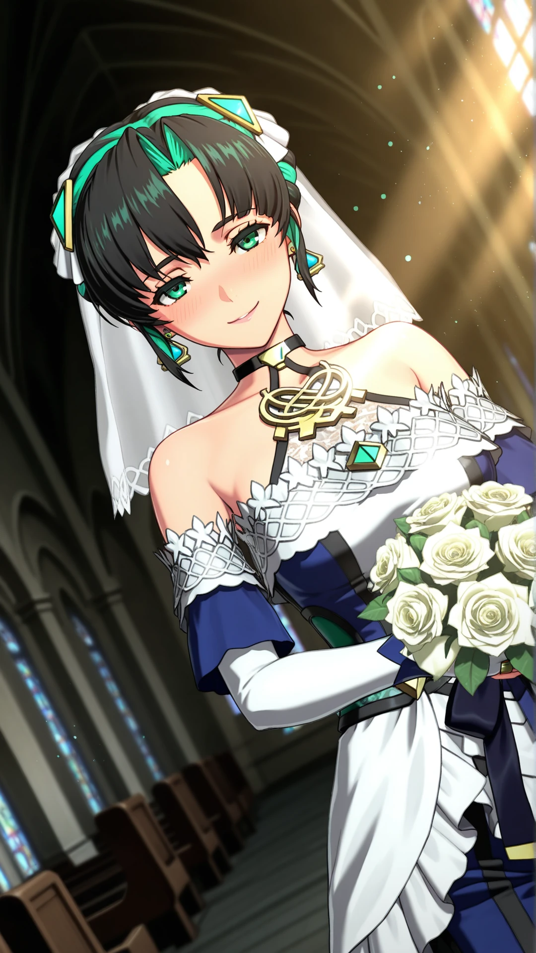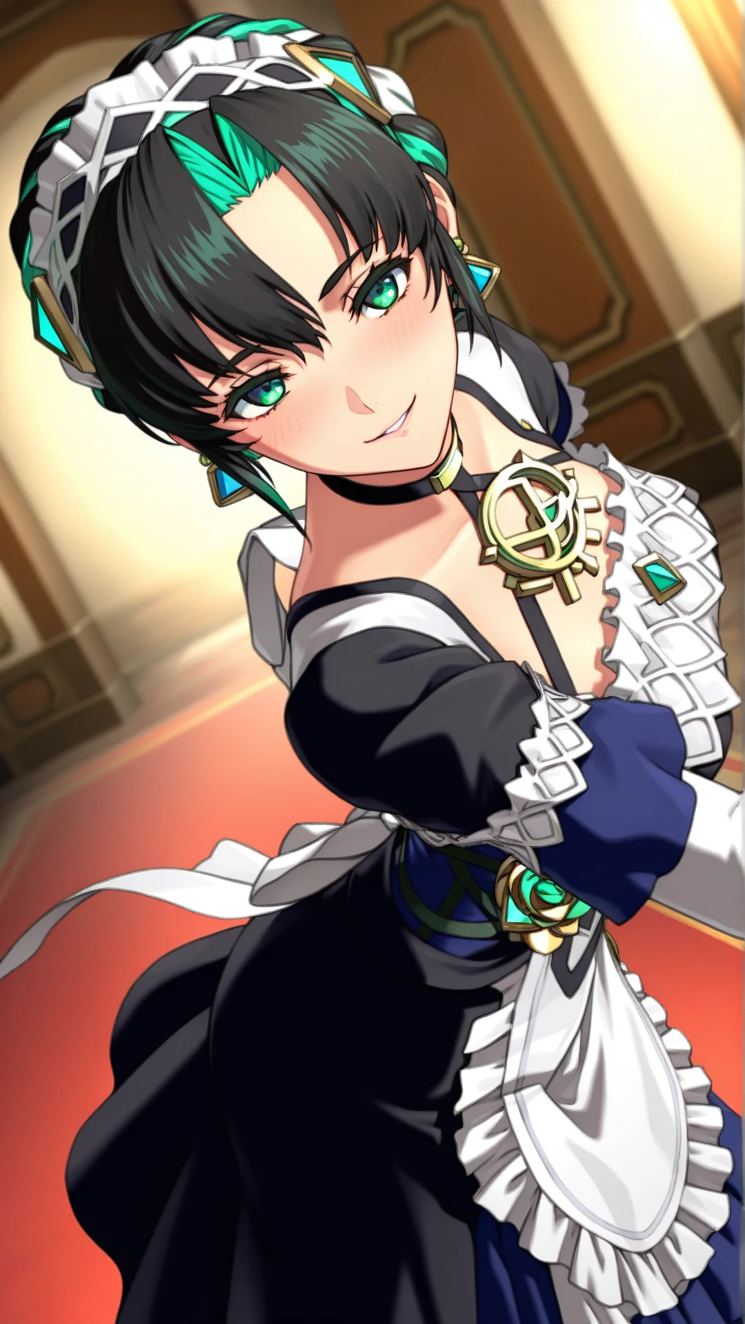 Appearance:,black hair, green eyes, short hair, green hair, multicolored hair, two-tone hair, makeup, eyeshadow,hair ornament, jewelry, earrings,