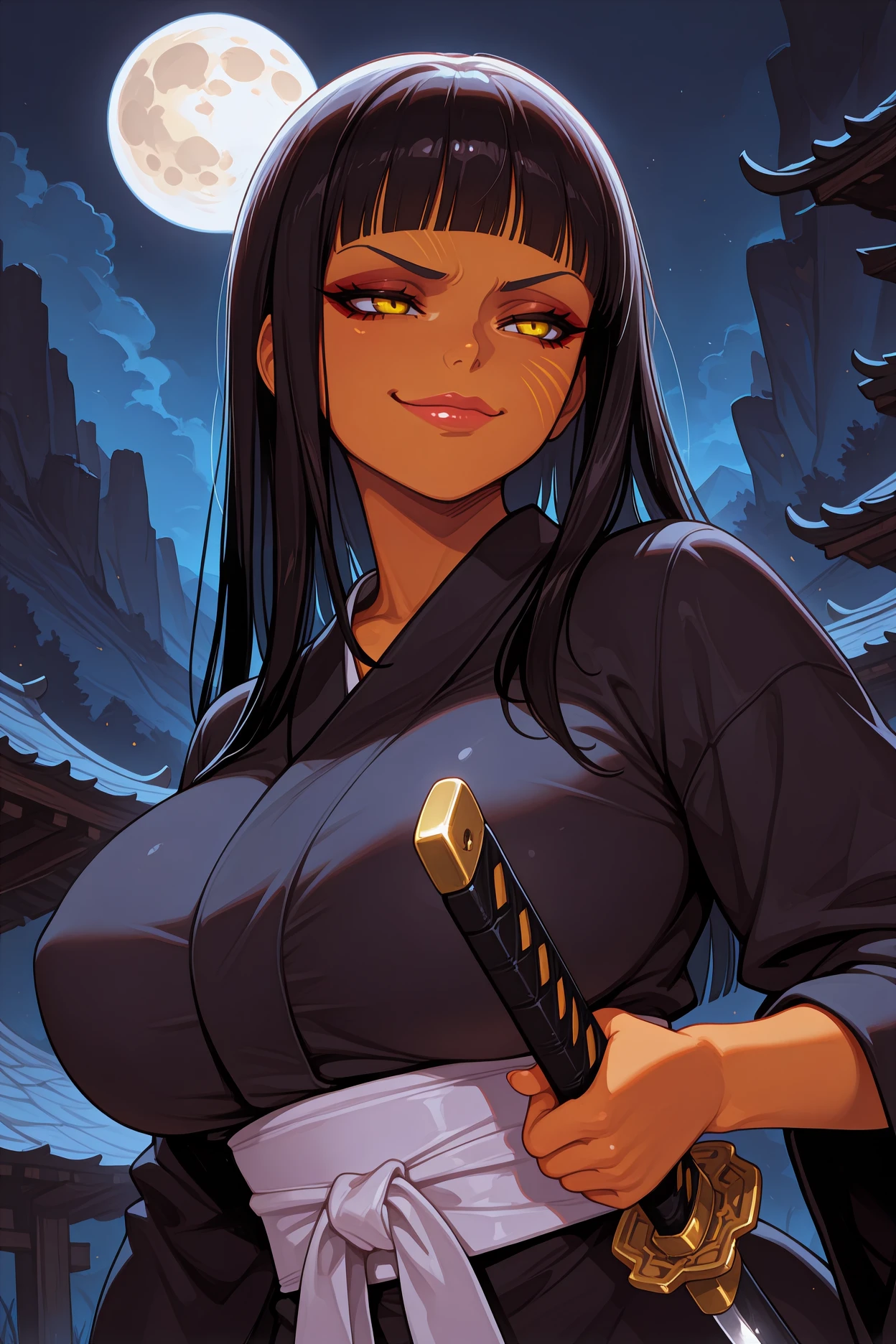 Trigger word is "loqos" and "dark-skinned female, black hair, long hair, blunt bangs, straight hair, yellow eyes, lips, facial mark, mole on breast" is required.