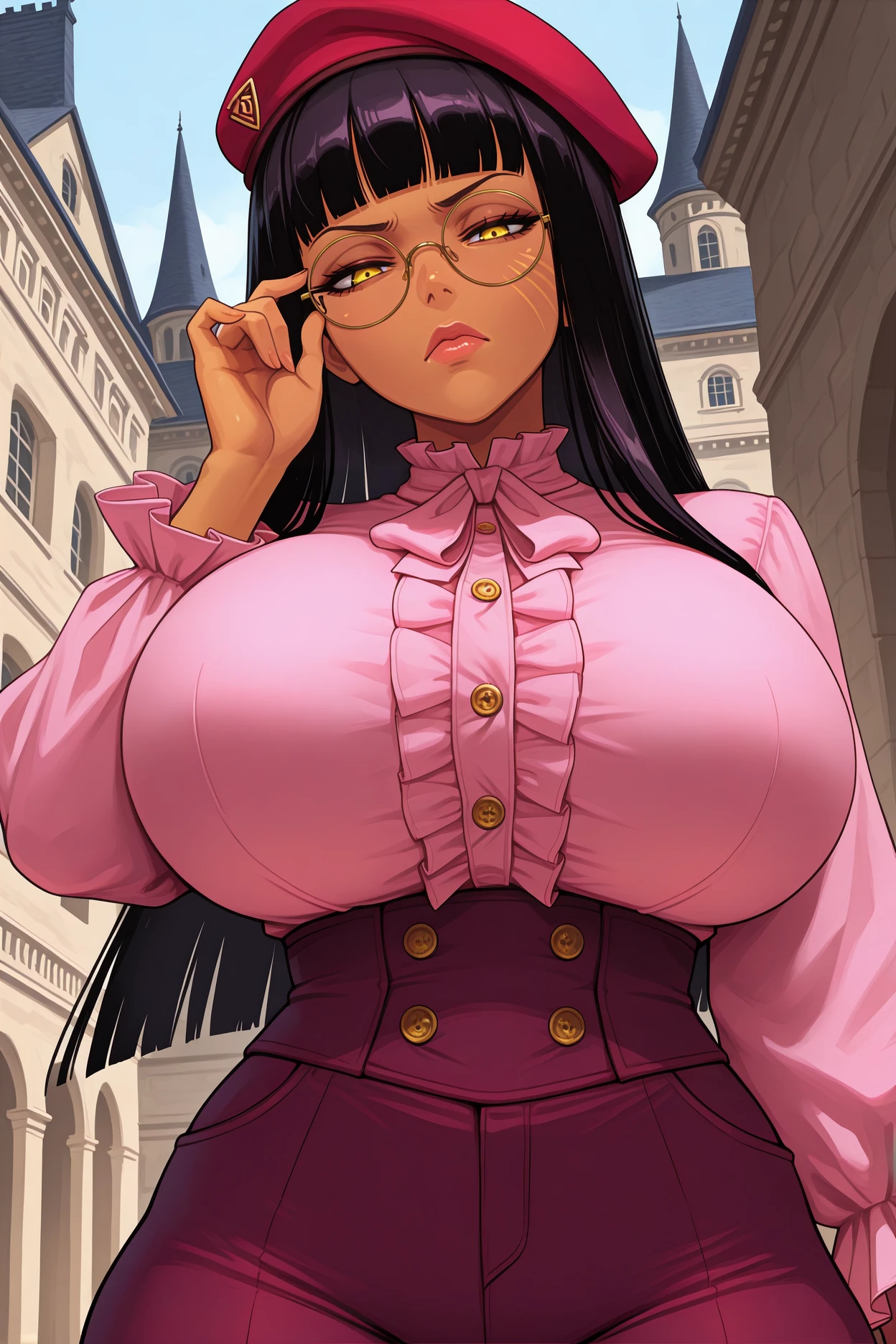 loqos, dark-skinned female, black hair, long hair, blunt bangs, straight hair, yellow eyes, lips, facial mark, mole on , huge breasts