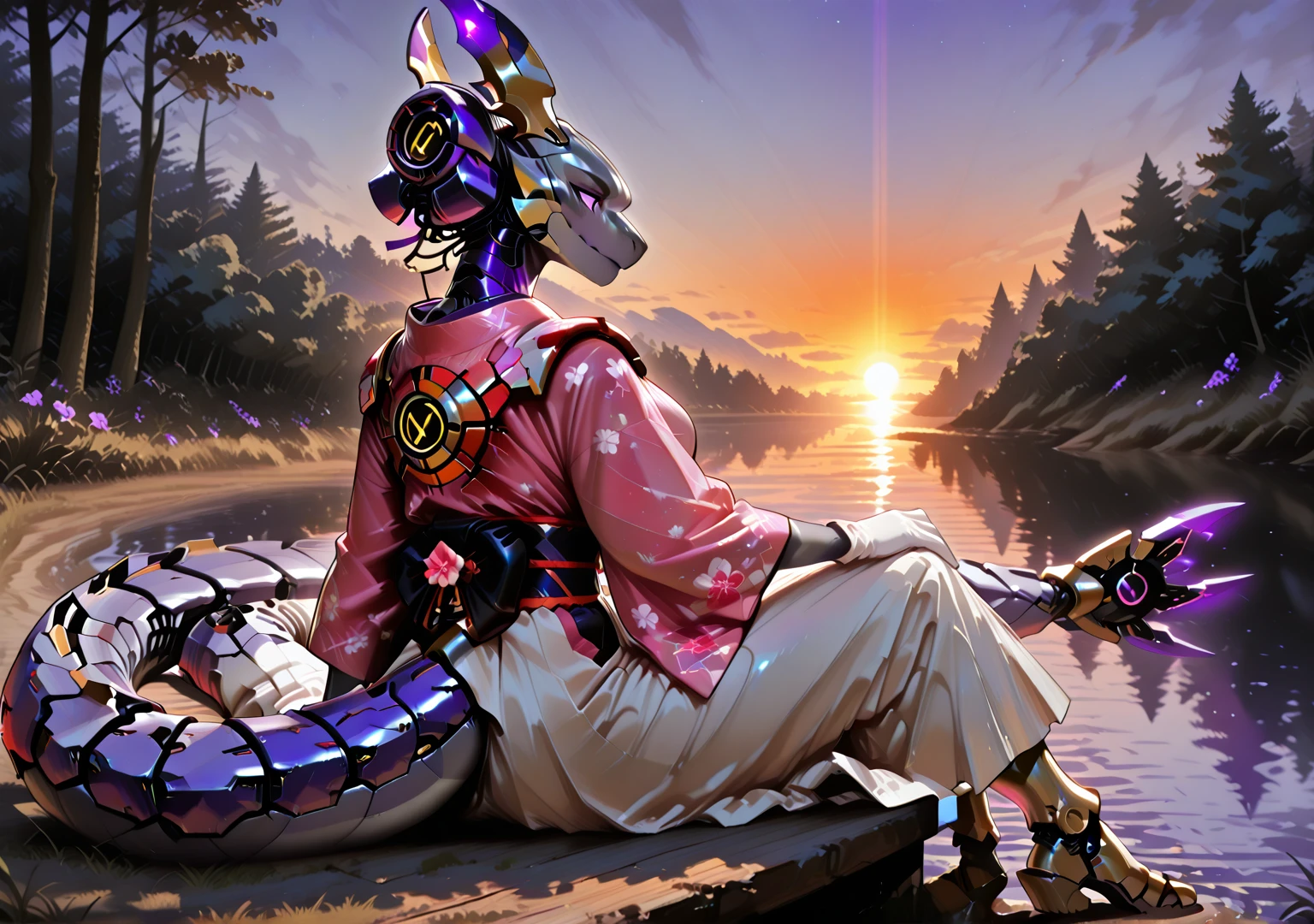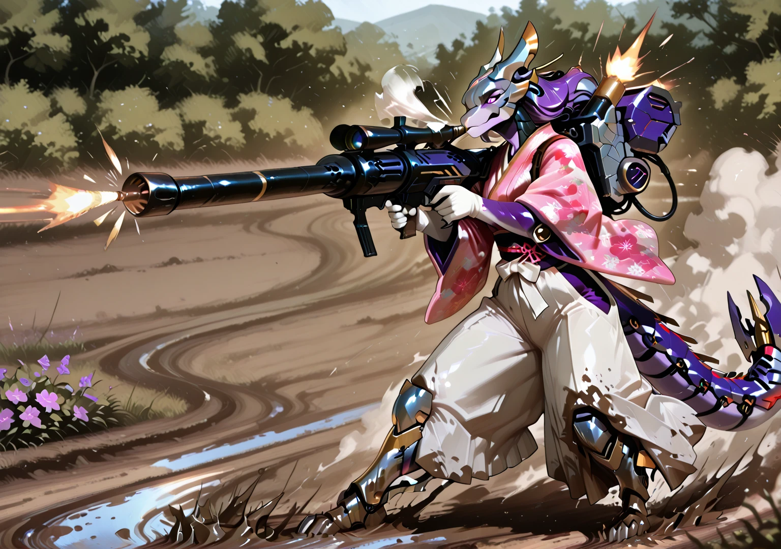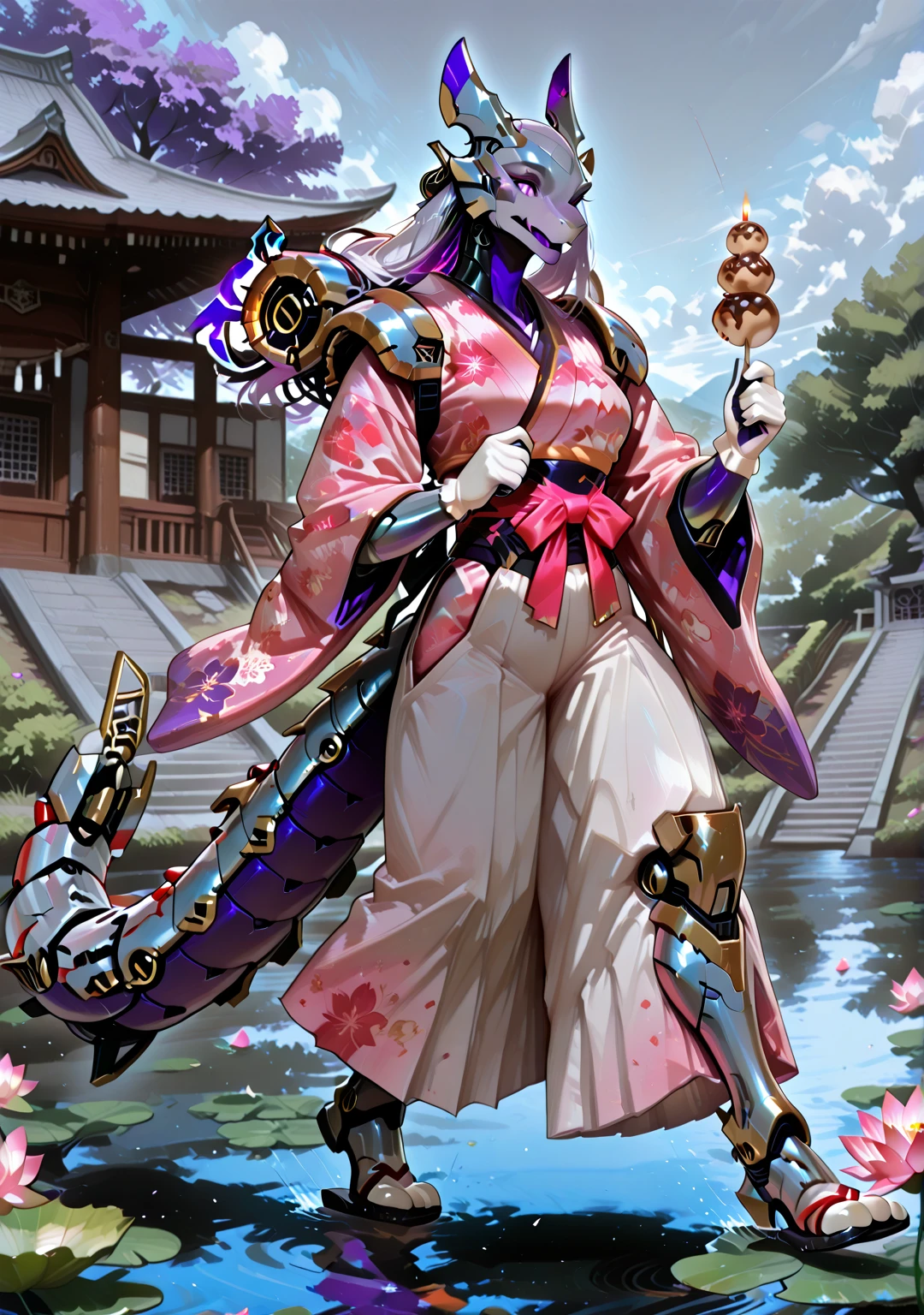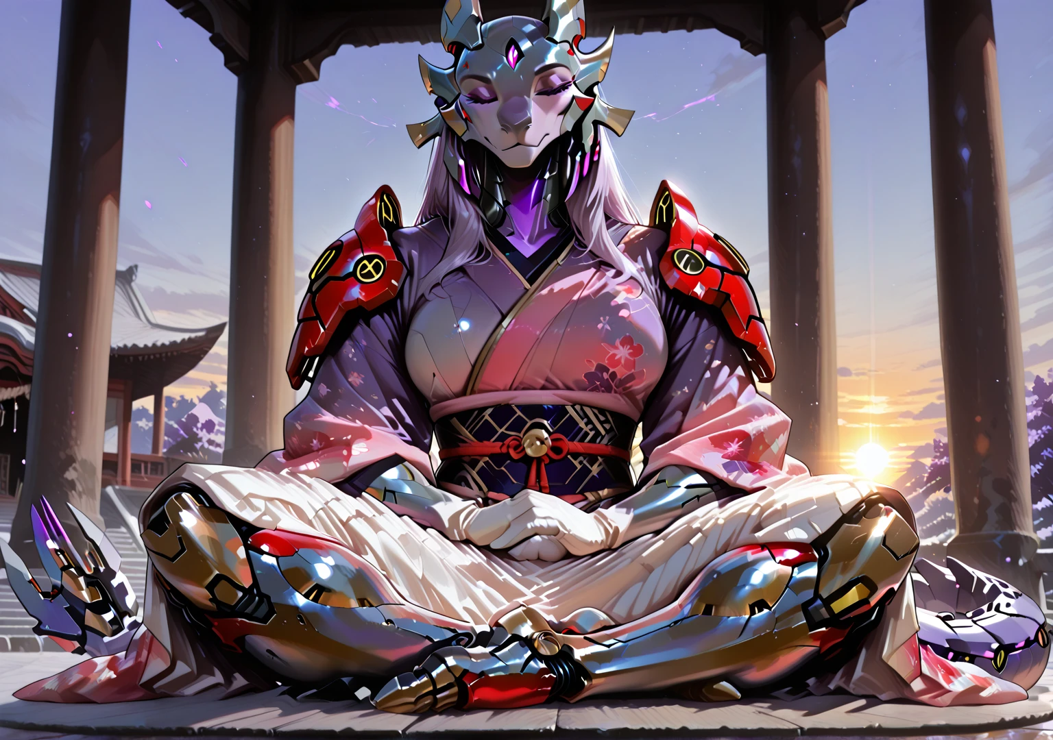 Trigger words: MaloraMalzano, Dustdragon, and the descriptors: 1woman, furry, furry female, anthro groudon, anthro malzeno, anthro cyborg, bioweapon prosthetics, grey skin, gray scales, purple scales, purple skin, two-tone skin, multicolored skin, violet eyes, heavy armor, armored arms, armored legs, armored greaves, anthro mecha, muscular, pink floral kimono, white gloves, white long skirt