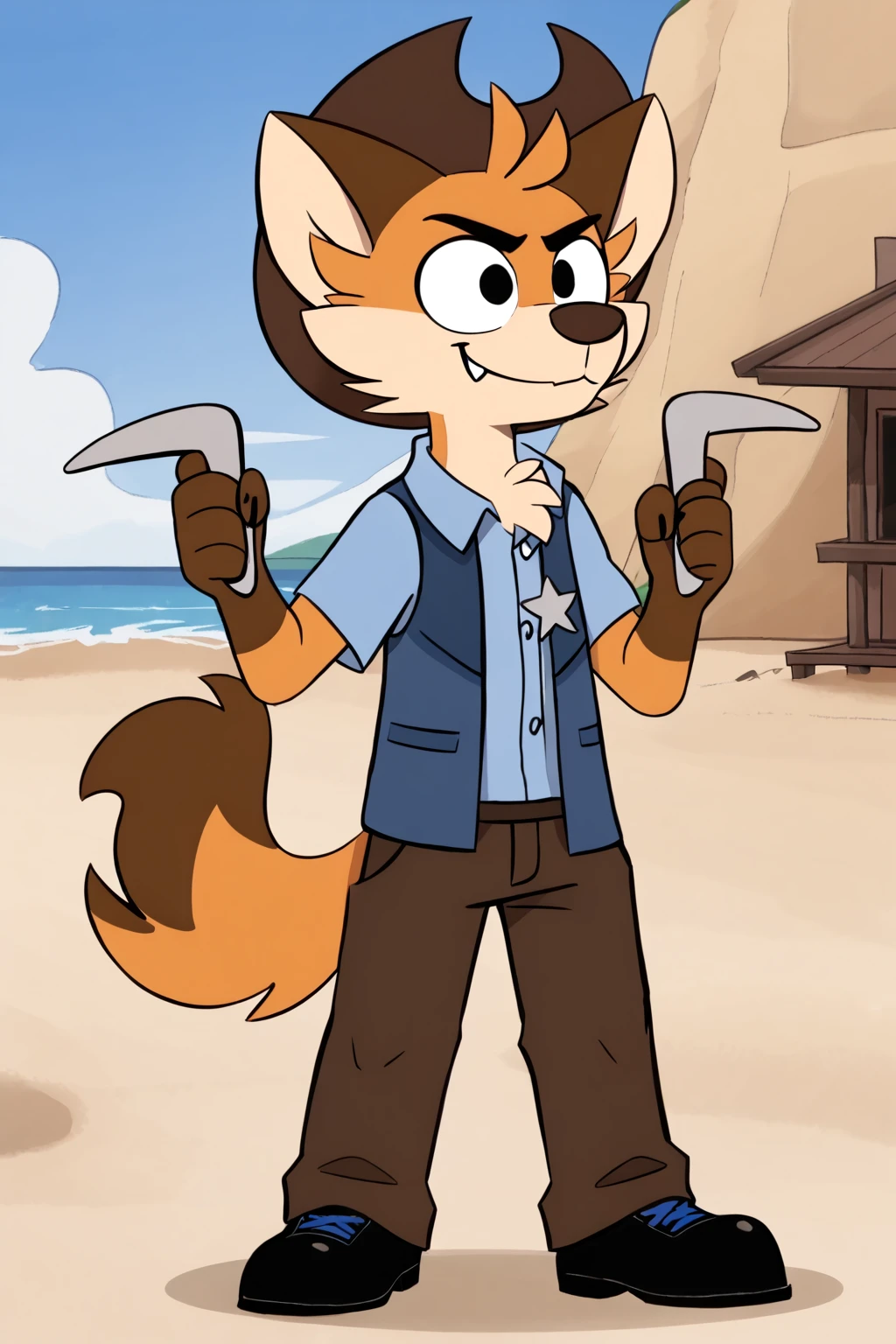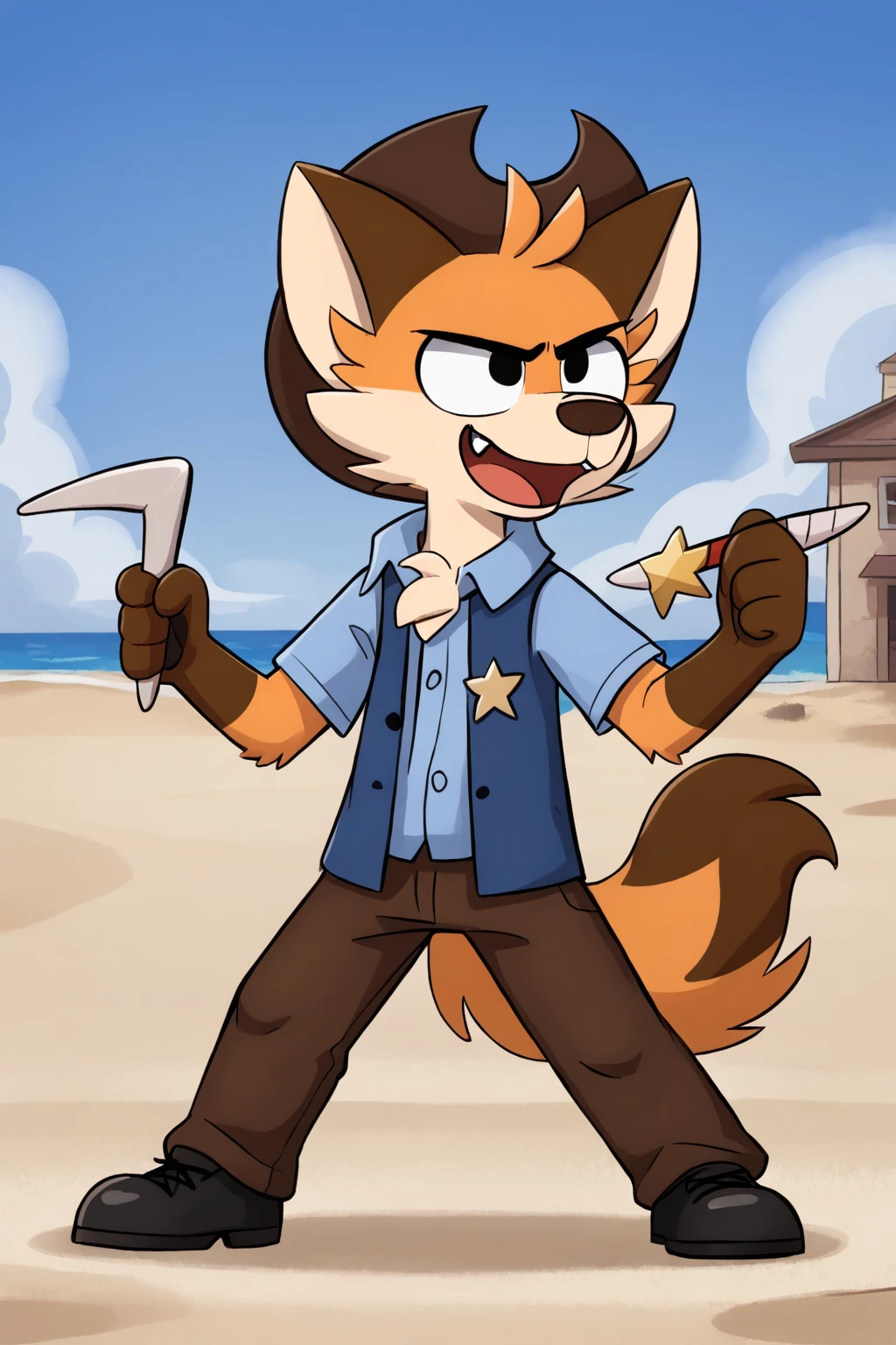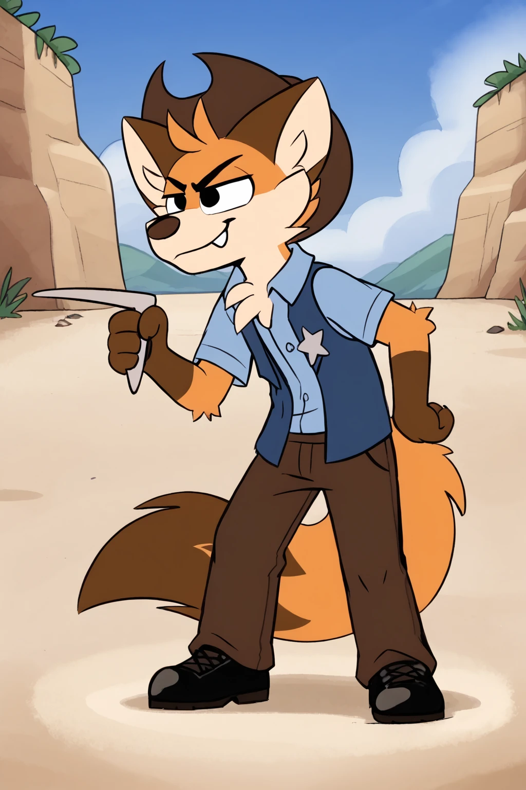 outfit tags: cowboy hat, light blue shirt, collared shirt, short sleeves, blue vest, open vest, sheriff badge, brown pants, black shoes