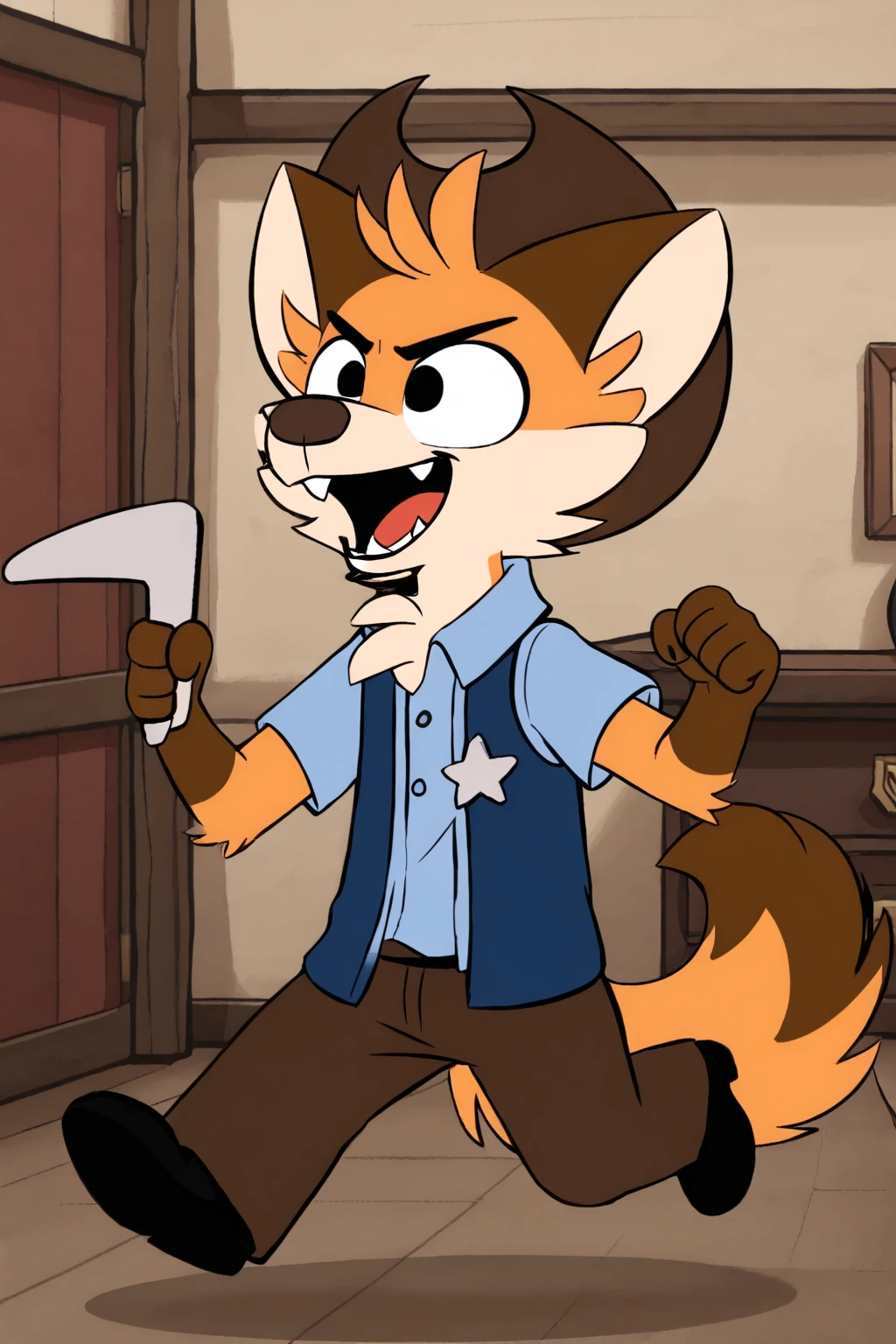 cowboy hat, light blue shirt, collared shirt, short sleeves, blue vest, open vest, sheriff badge, brown pants, black shoes