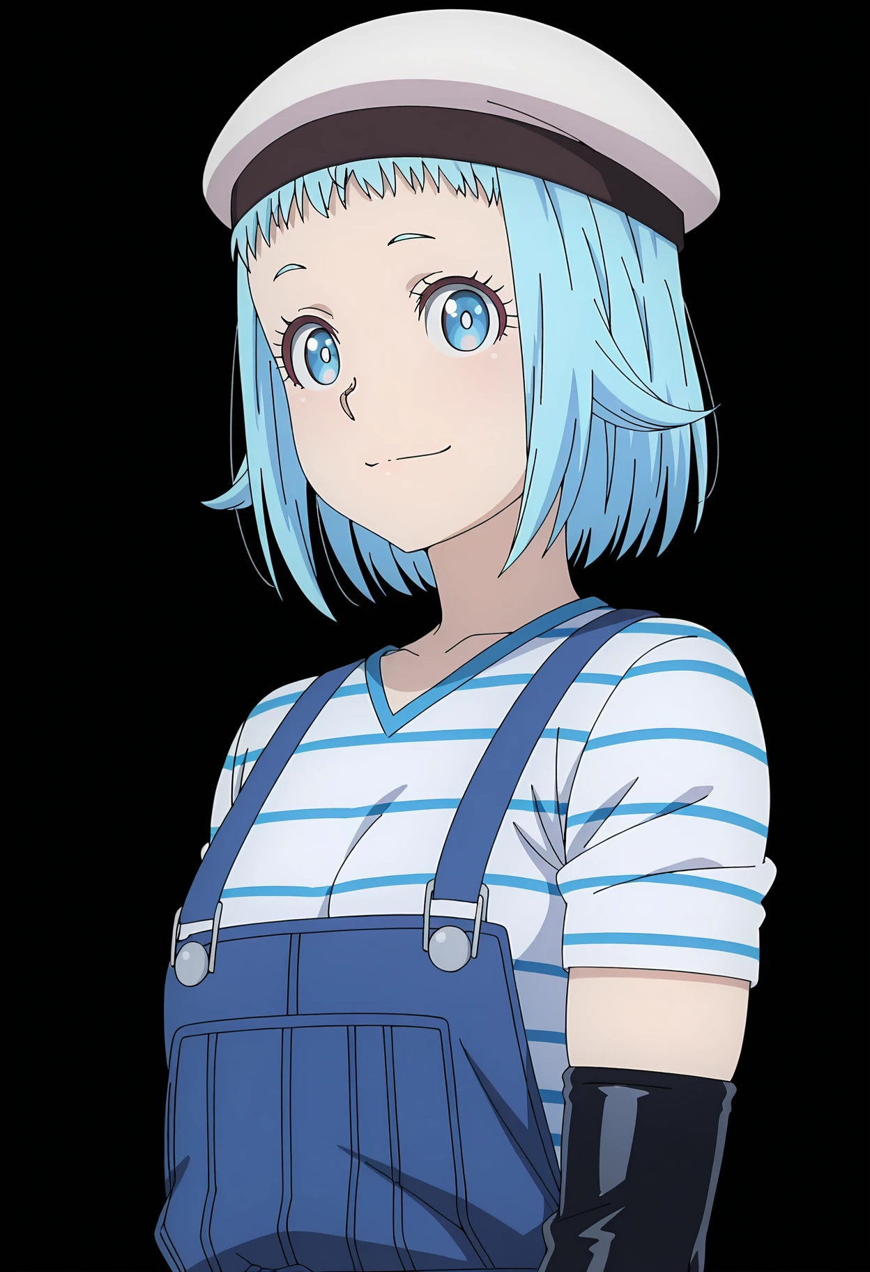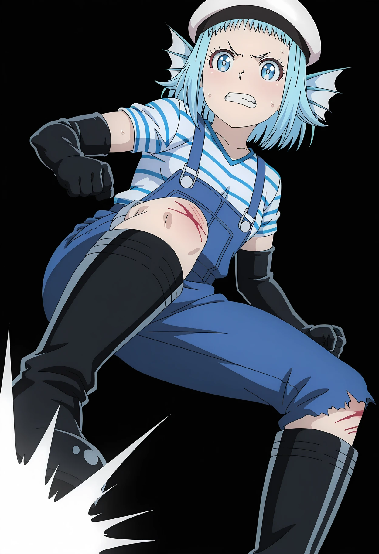 hat, white headwear, shirt, striped shirt, short sleeves, black gloves, elbow gloves, blue overalls, black footwear, knee boots, rubber boots