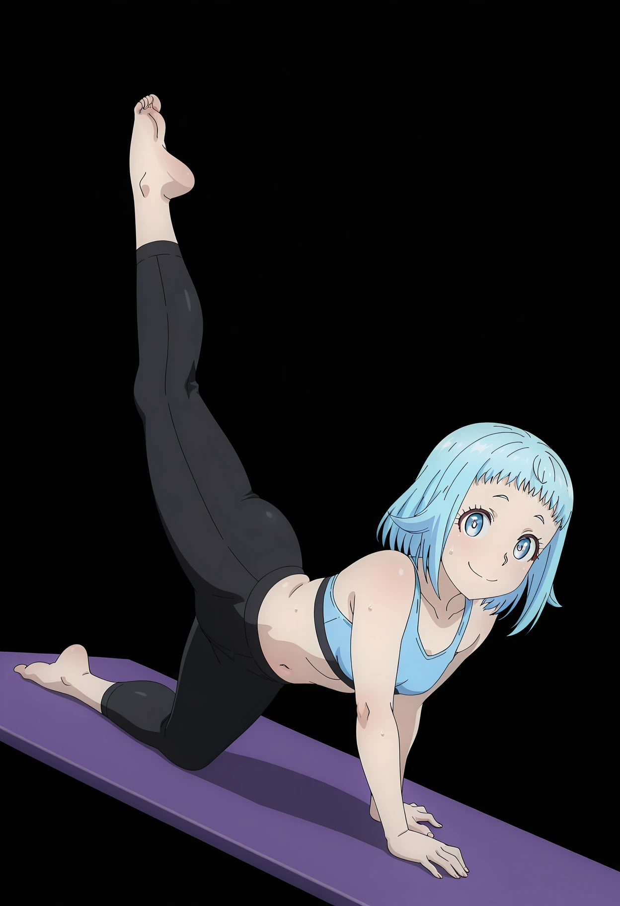 bare shoulders, sleeveless, crop top, blue bra, sports bra, navel, black pants, leggings, yoga pants, barefoot