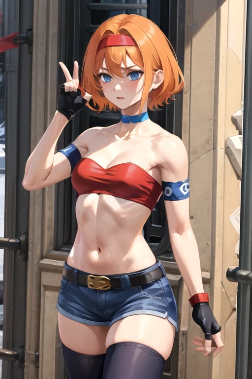 ElizaFinalFight, 1girl, solo, short hair, blue eyes, brown hair, thighhighs, black gloves, navel, cleavage, bare shoulders, medium breasts, collarbone, short shorts, blue choker, midriff, belt, fingerless gloves, strapless, red headband, armband, blue shorts, red bandeau, tube top