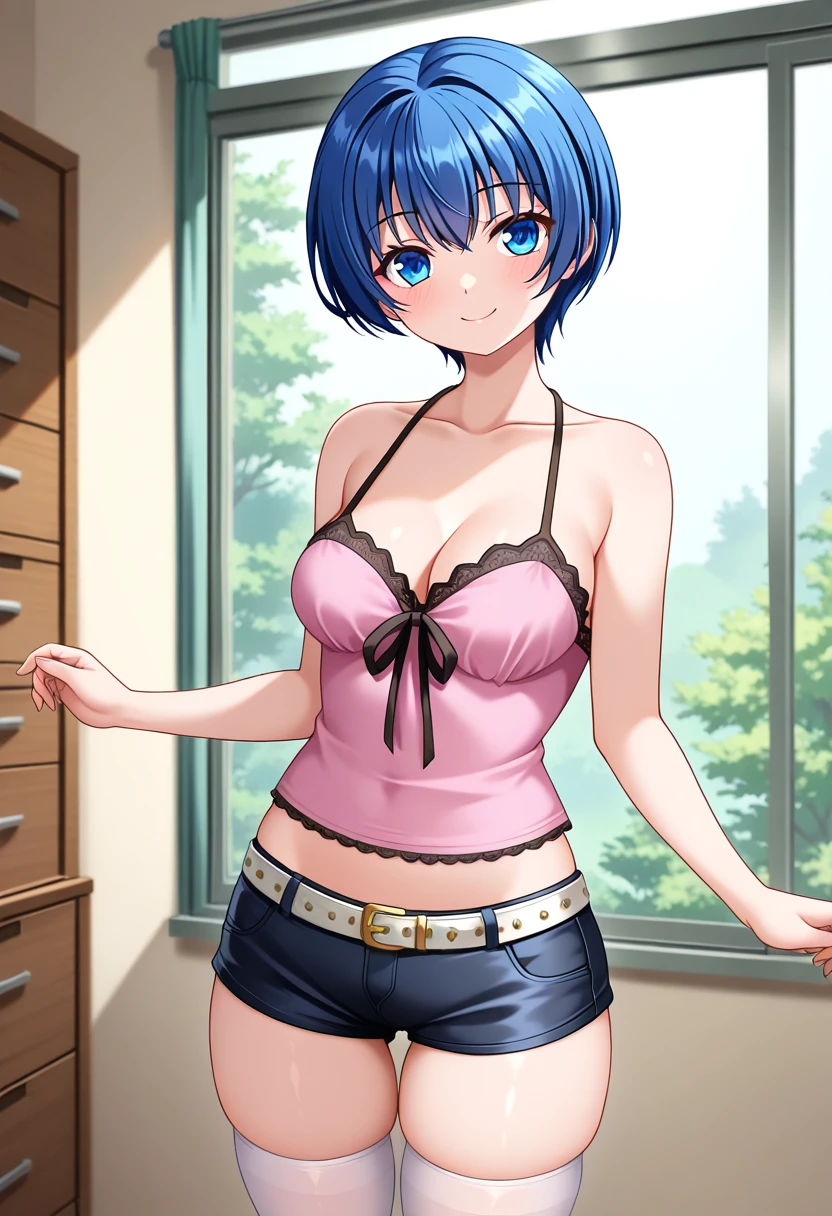 • breasts, cleavage, pink camisole, ???? shoulders, midriff, white belt, black short shorts, white thighhighs,