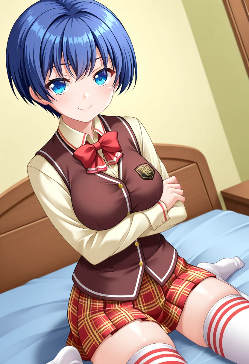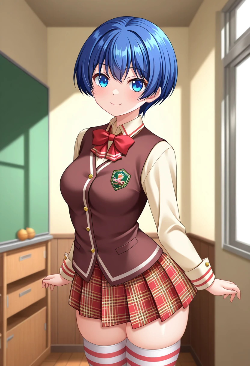 • school uniform, red bowtie, brown vest, yellow collared shirt, long sleeves, red plaid skirt, zettai ryouiki, multicolored thighhighs,