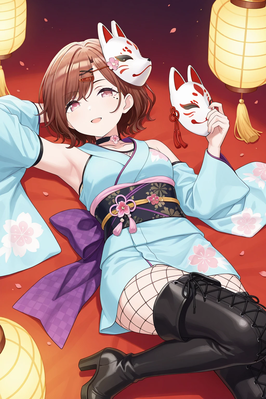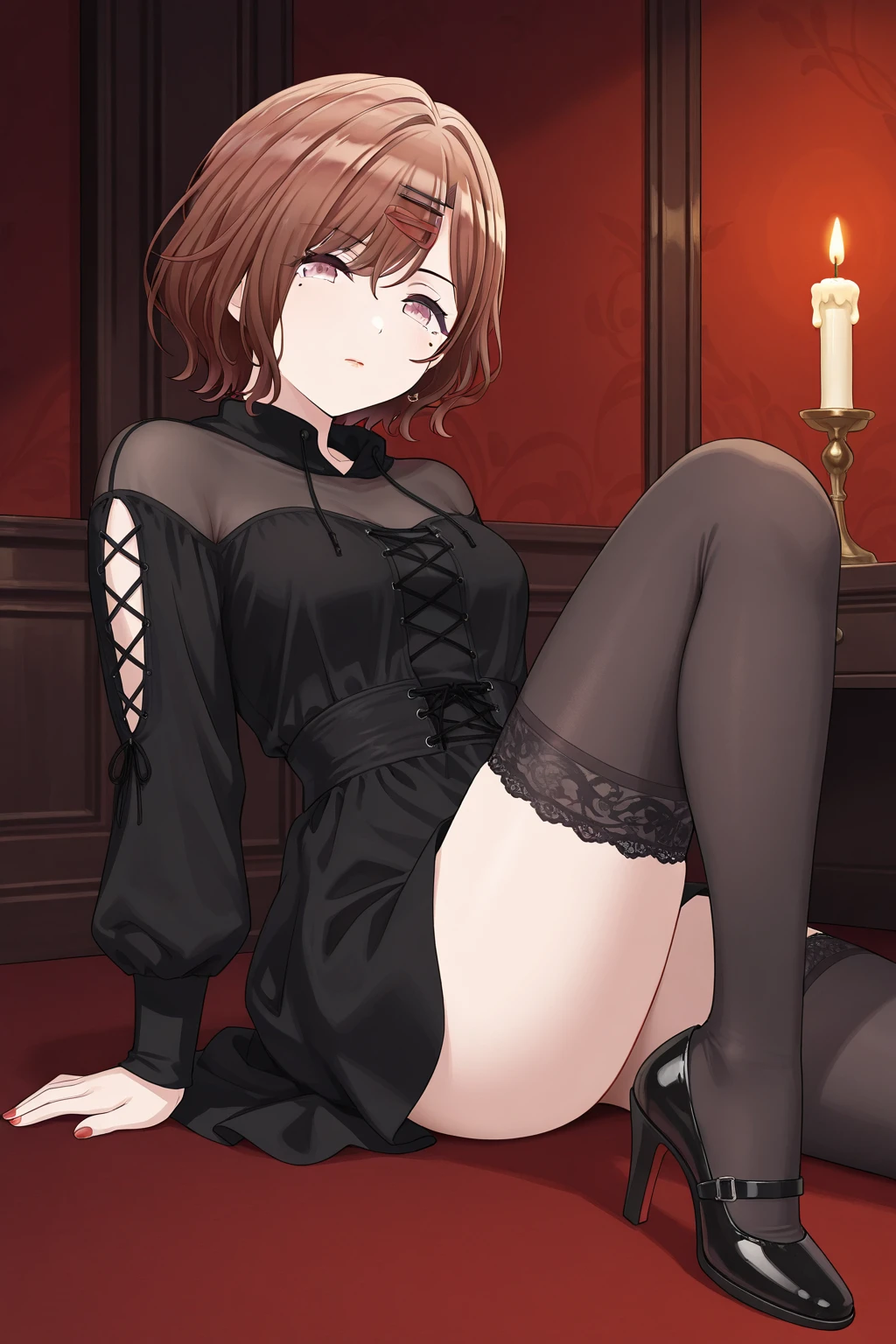 Higuchi Madoka, brown hair, short hair, swept bangs, mole, mole under eye, purple eyes,
