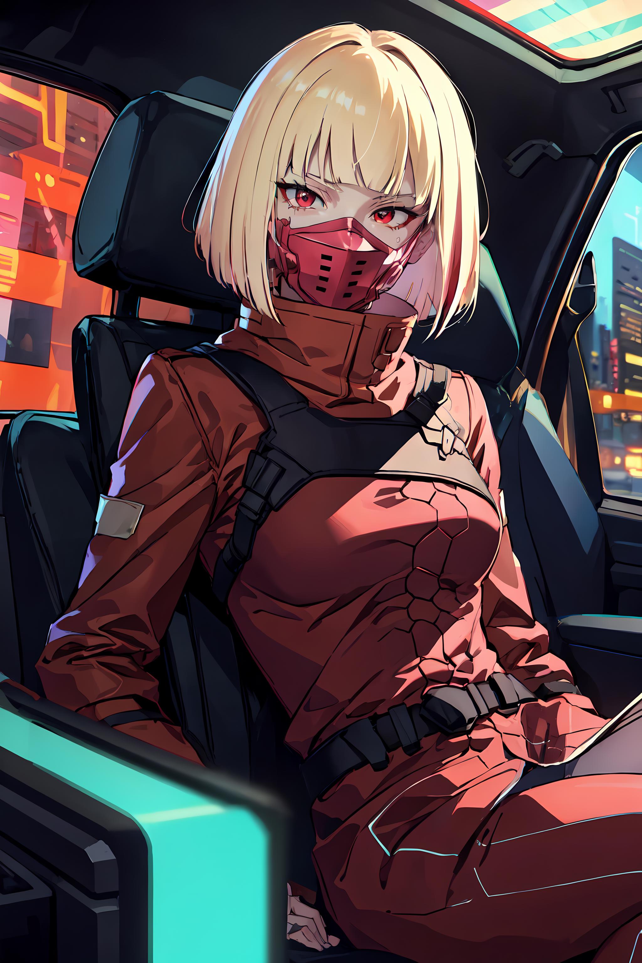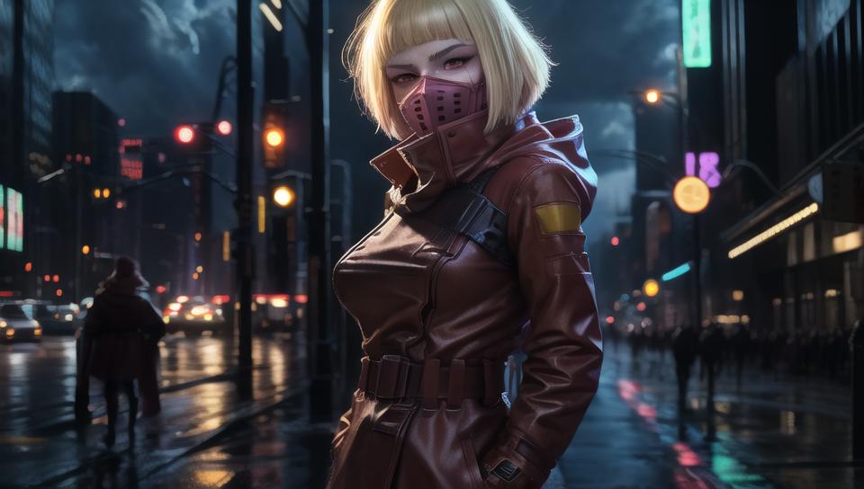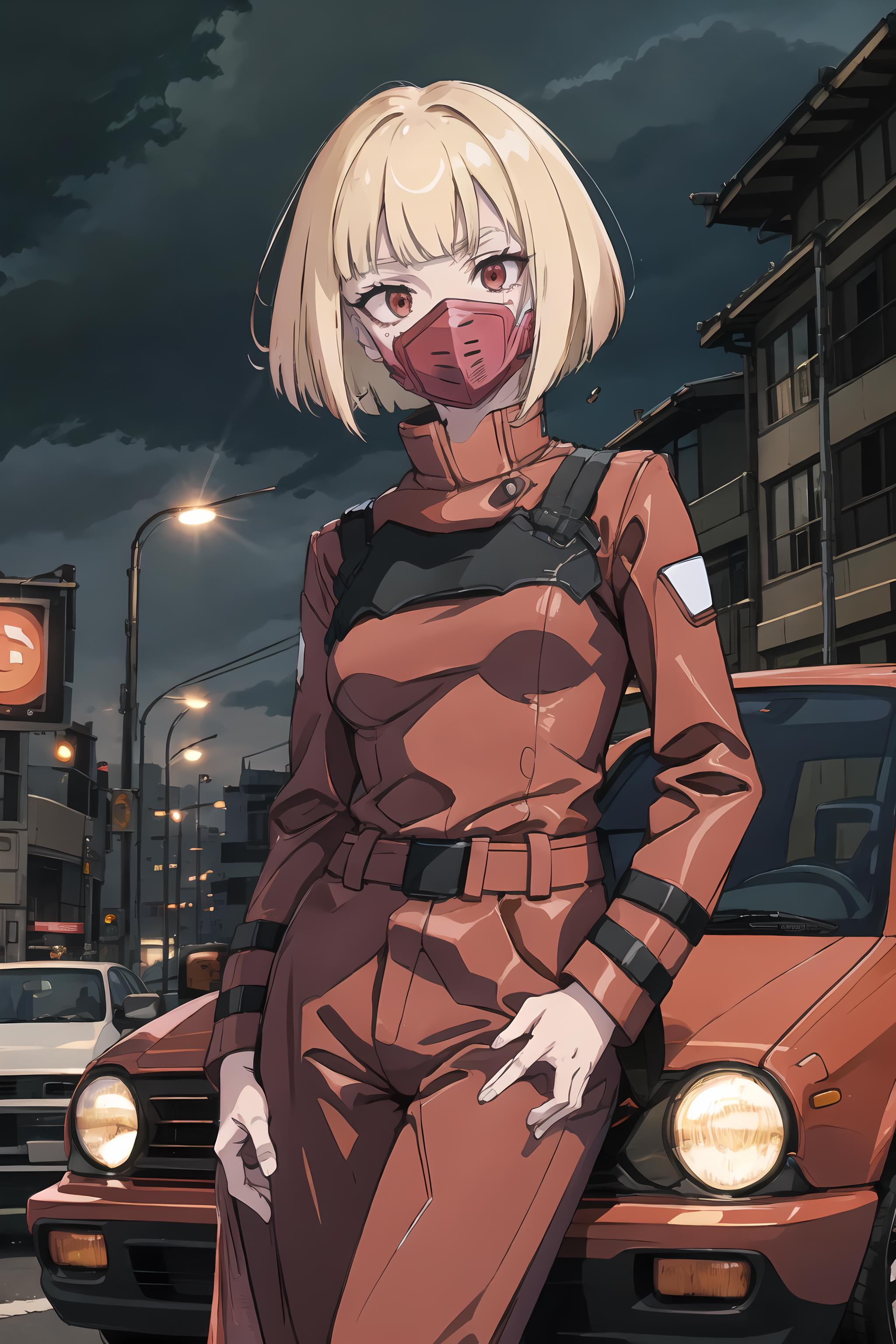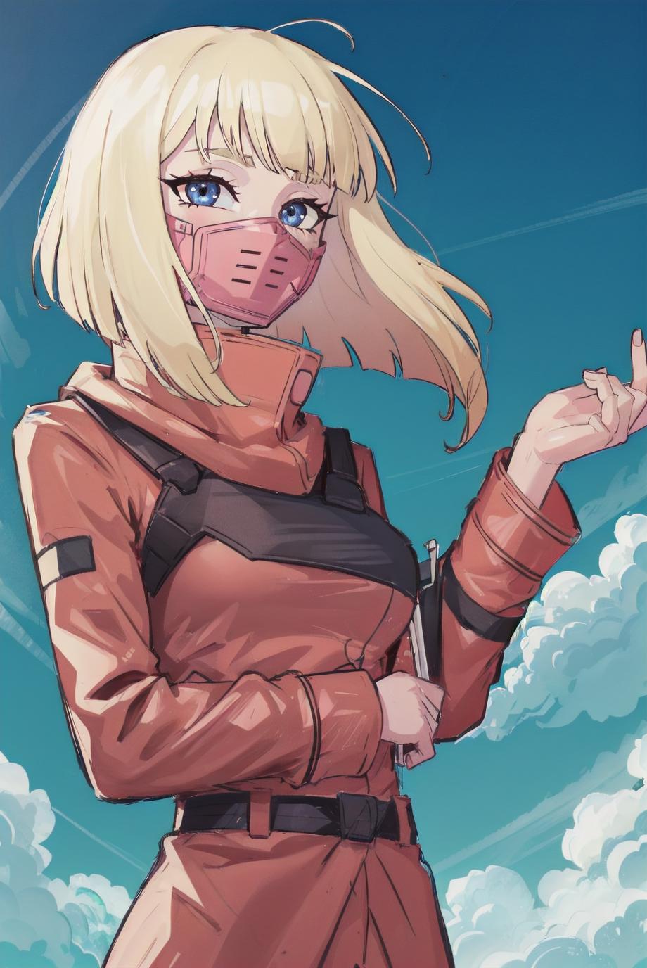 Example Output: cpkiwi, 1girl, solo, short hair, blonde hair, red eyes, red coat, coat, belt, red pants, mask,