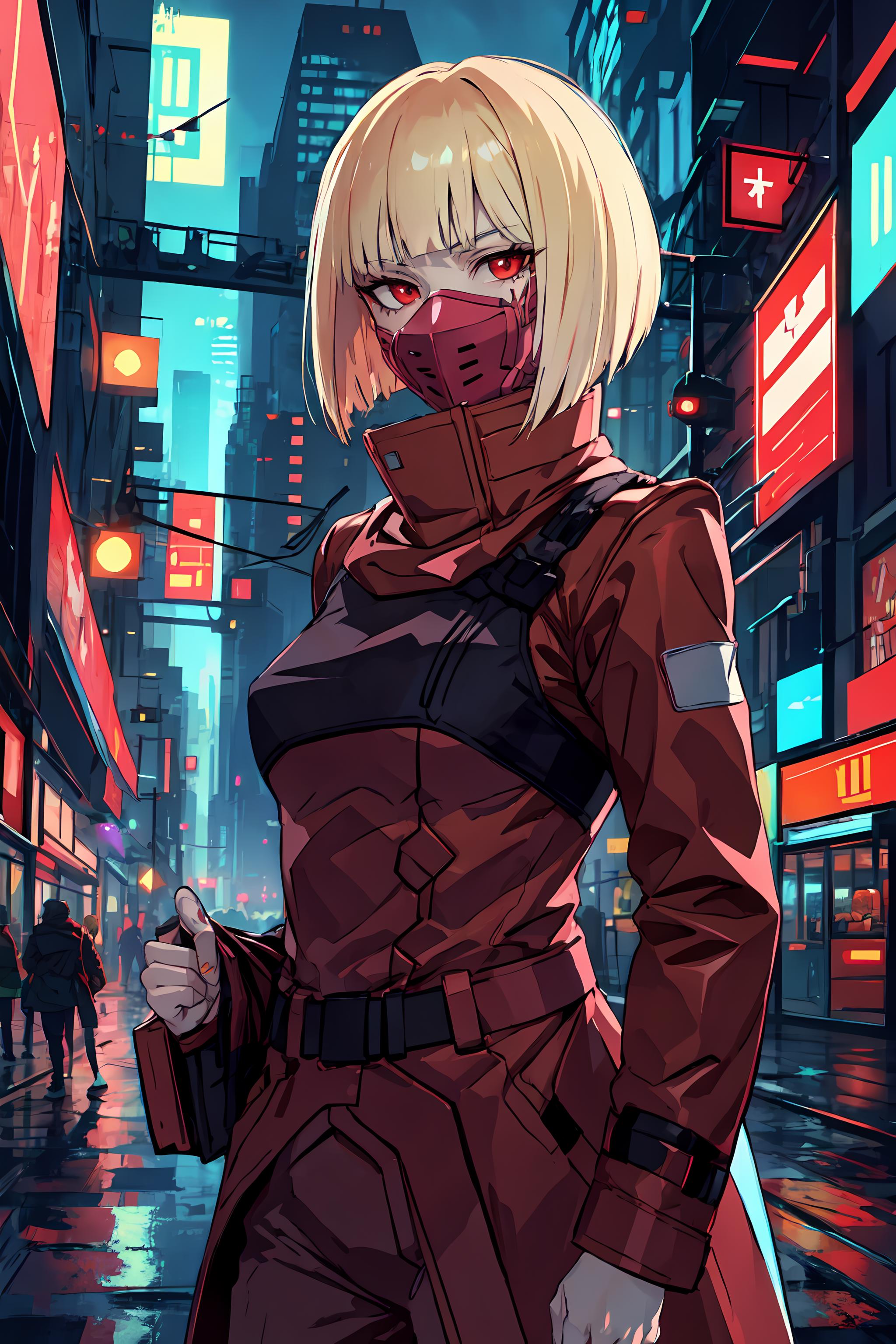 1girl, solo, short hair, blonde hair, red eyes, mask, red coat, coat, belt, red pants, high heel boots