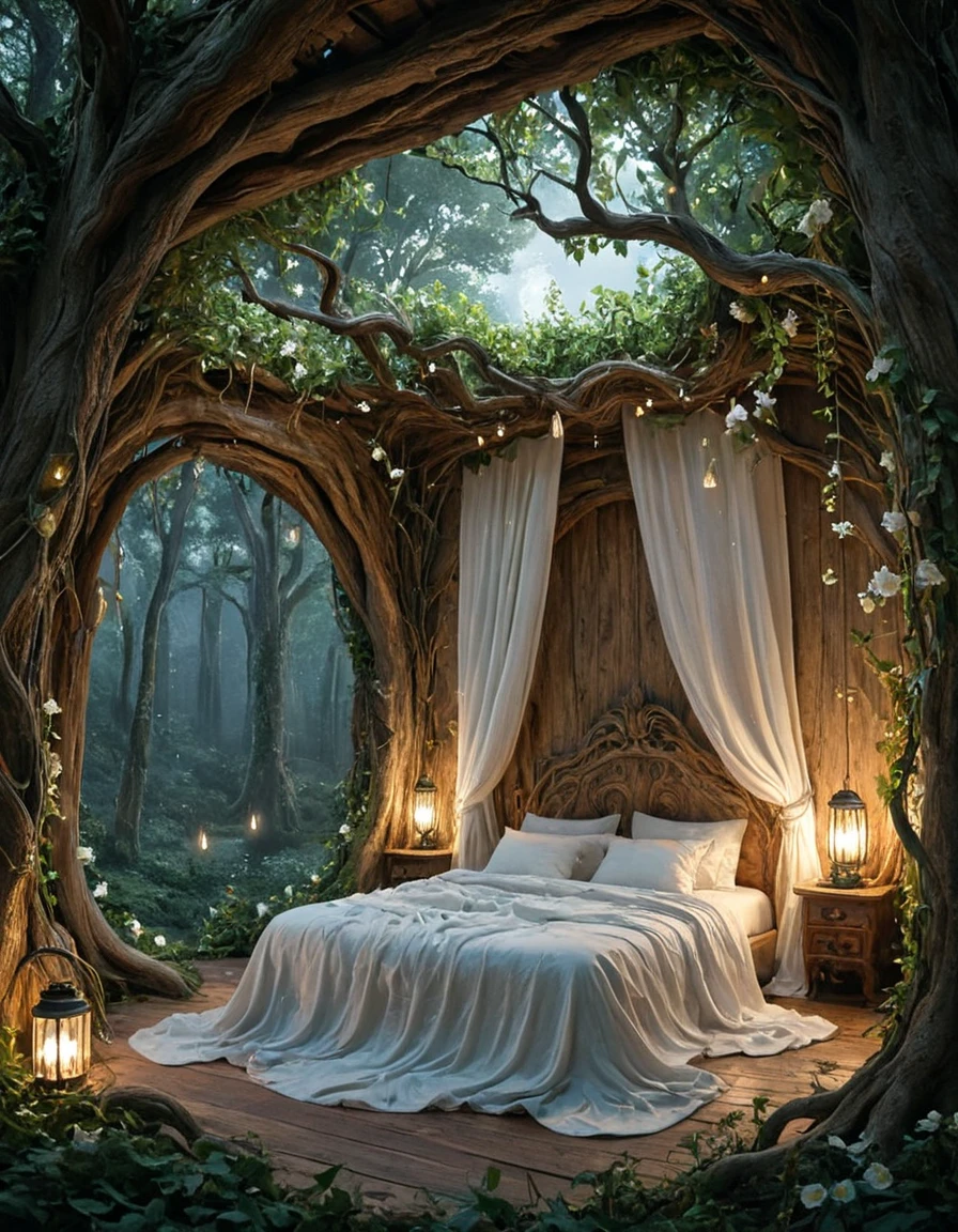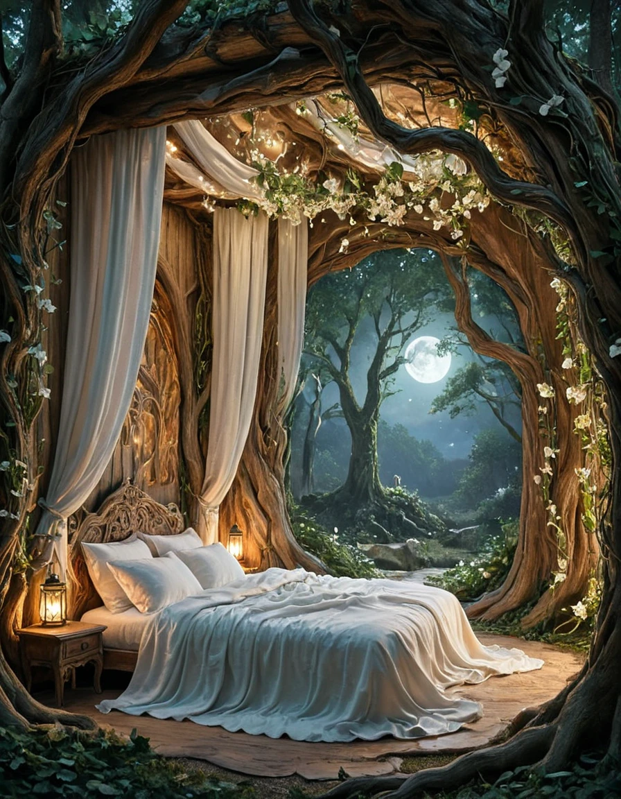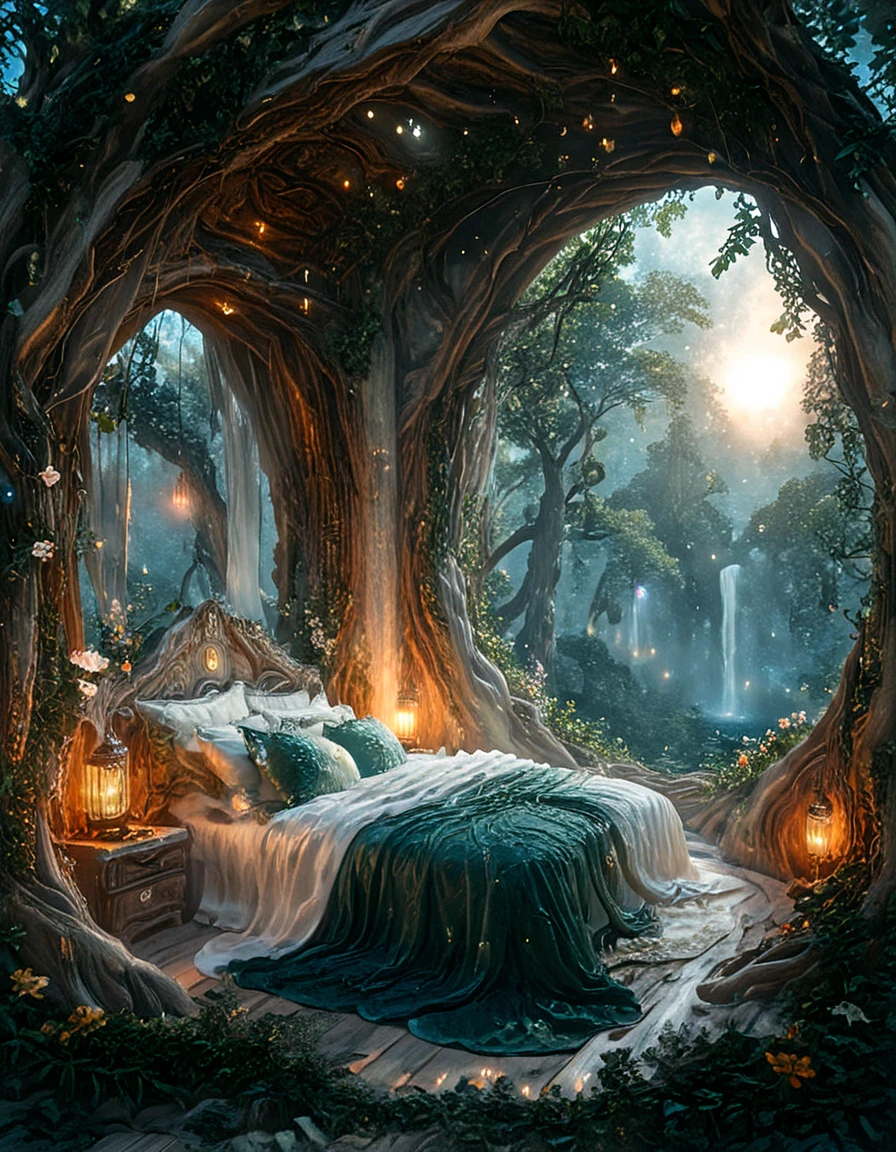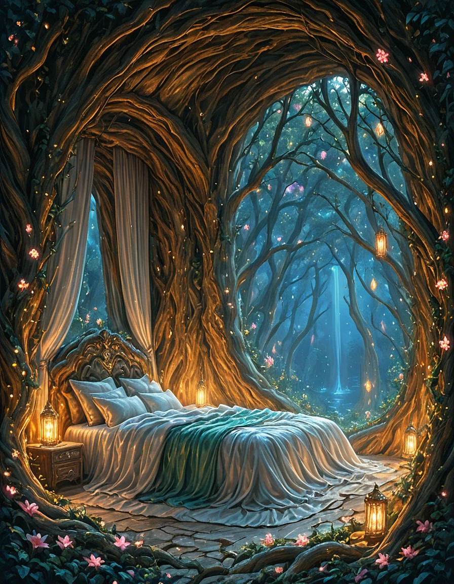 An elegant elfic bedroom inside an ancient tree, glowing wooden walls with veins of bioluminescence, arched crystal windows opening to a moonlit forest, canopy bed with silken sheets, floating lanterns casting magical light, vines and glowing flowers, serene mystical atmosphere, fantasy realism, highly detailed,