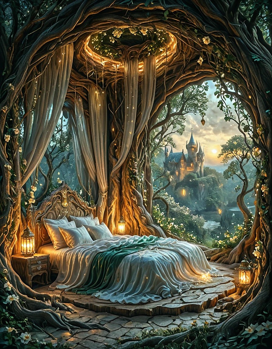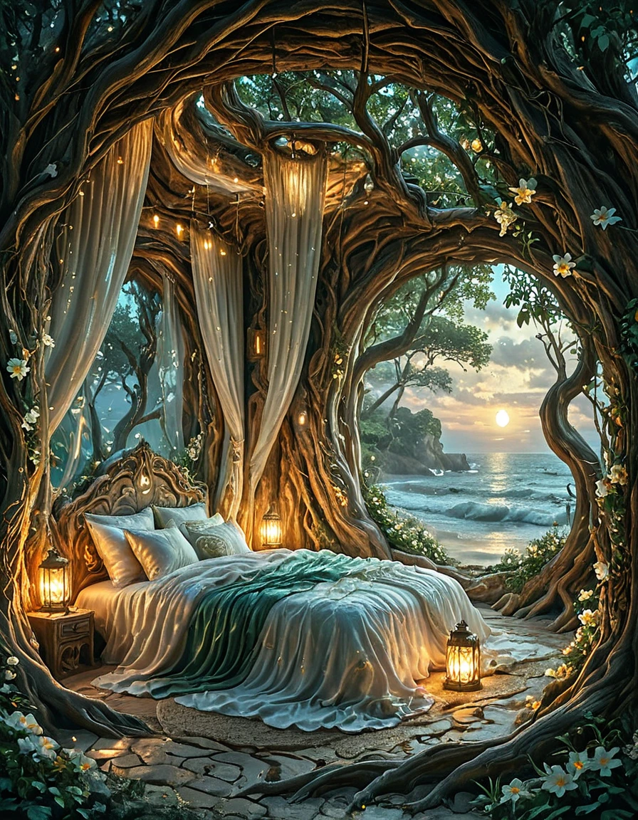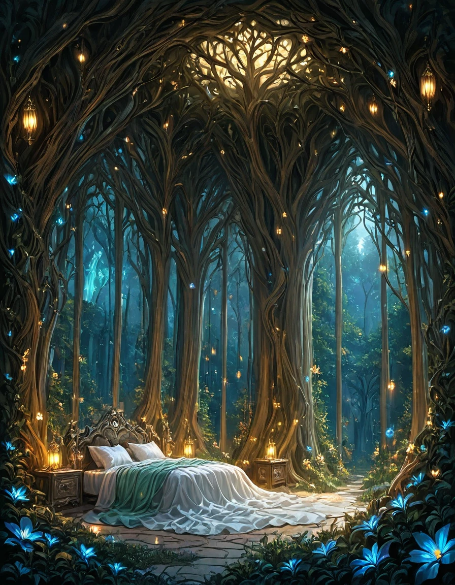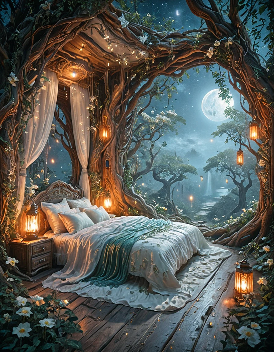 An elegant elfic bedroom inside an ancient tree, glowing wooden walls with veins of bioluminescence, arched crystal windows opening to a moonlit forest, canopy bed with silken sheets, floating lanterns casting magical light, vines and glowing flowers, serene mystical atmosphere, fantasy realism, highly detailed,