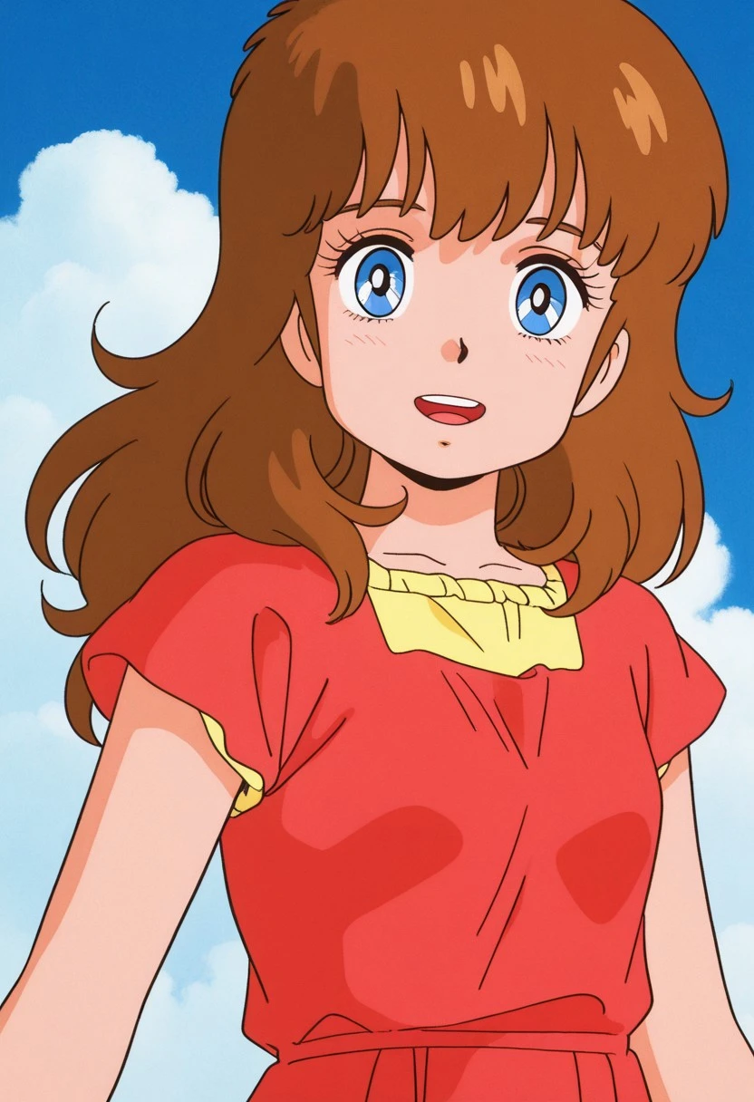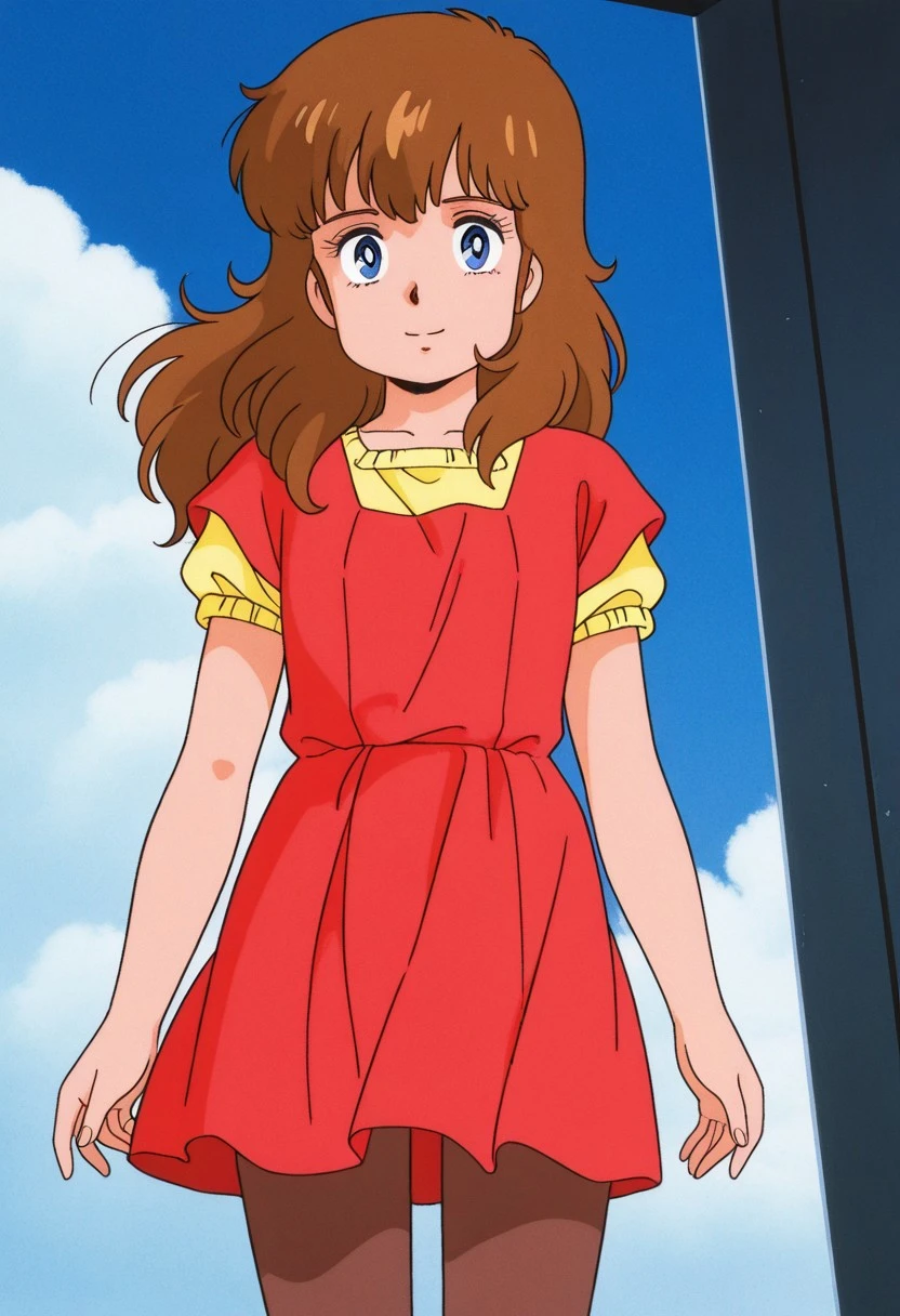 ① clare barbland,1girl,blue eyes,brown hair,long hair,dress,pantyhose