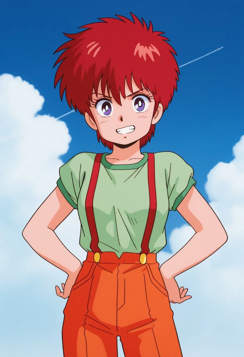 hair,suspenders,green shirt,short sleeves