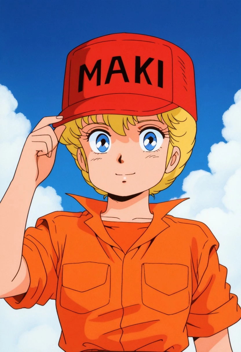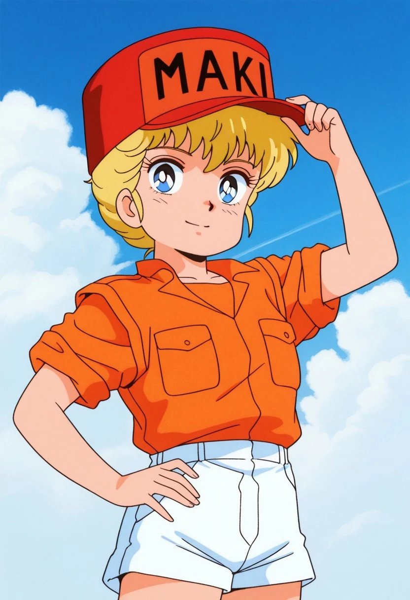 ③ maki rowel,1girl,blue eyes,blonde hair,short hair,hat,red_headwear,orange_shirt,white_shorts