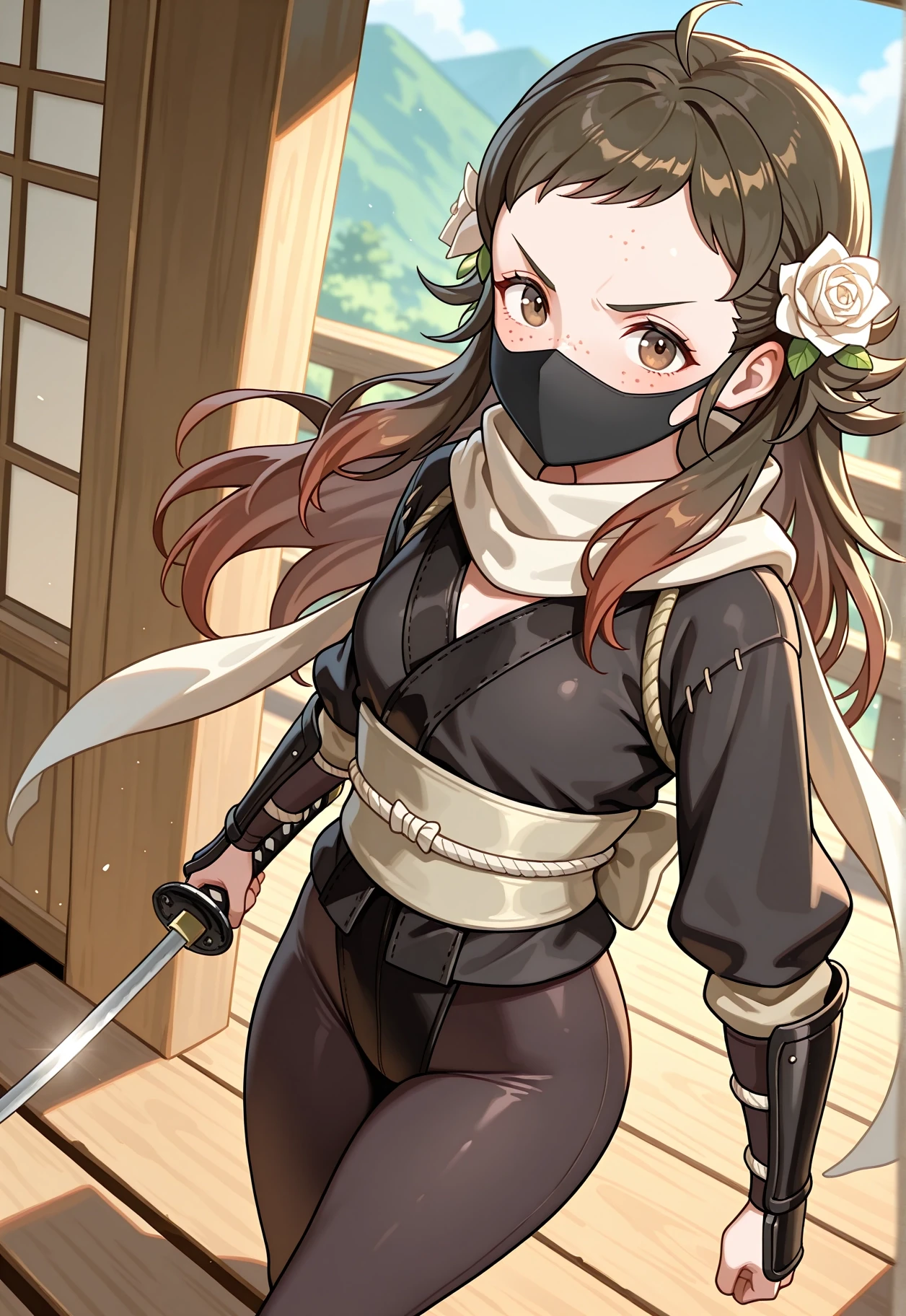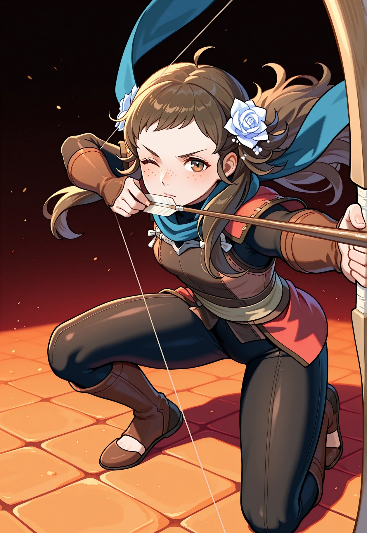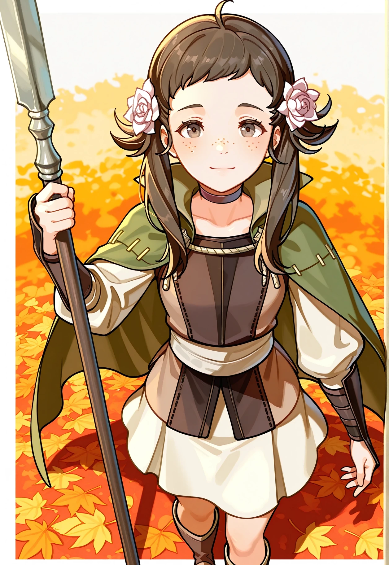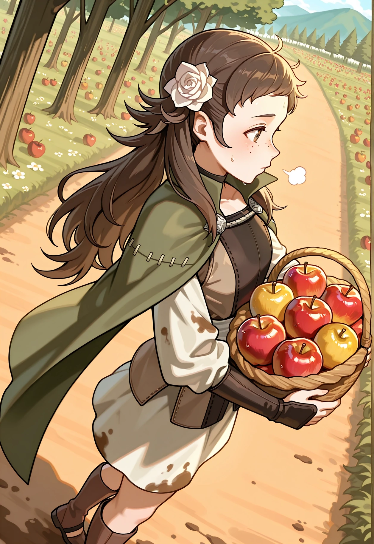 Mozu \(Fire Emblem\), Brown hair, flower in hair, white rose in hair, hair ornament, white flower, brown eyes, brown tunic, brown cape, green cape, white skirt, brown boots, long hair, sidelocks, freckles, white belt, long sleeves, gauntlets,To aid with changing her outfit, lower the Lora weight + activation text weight.