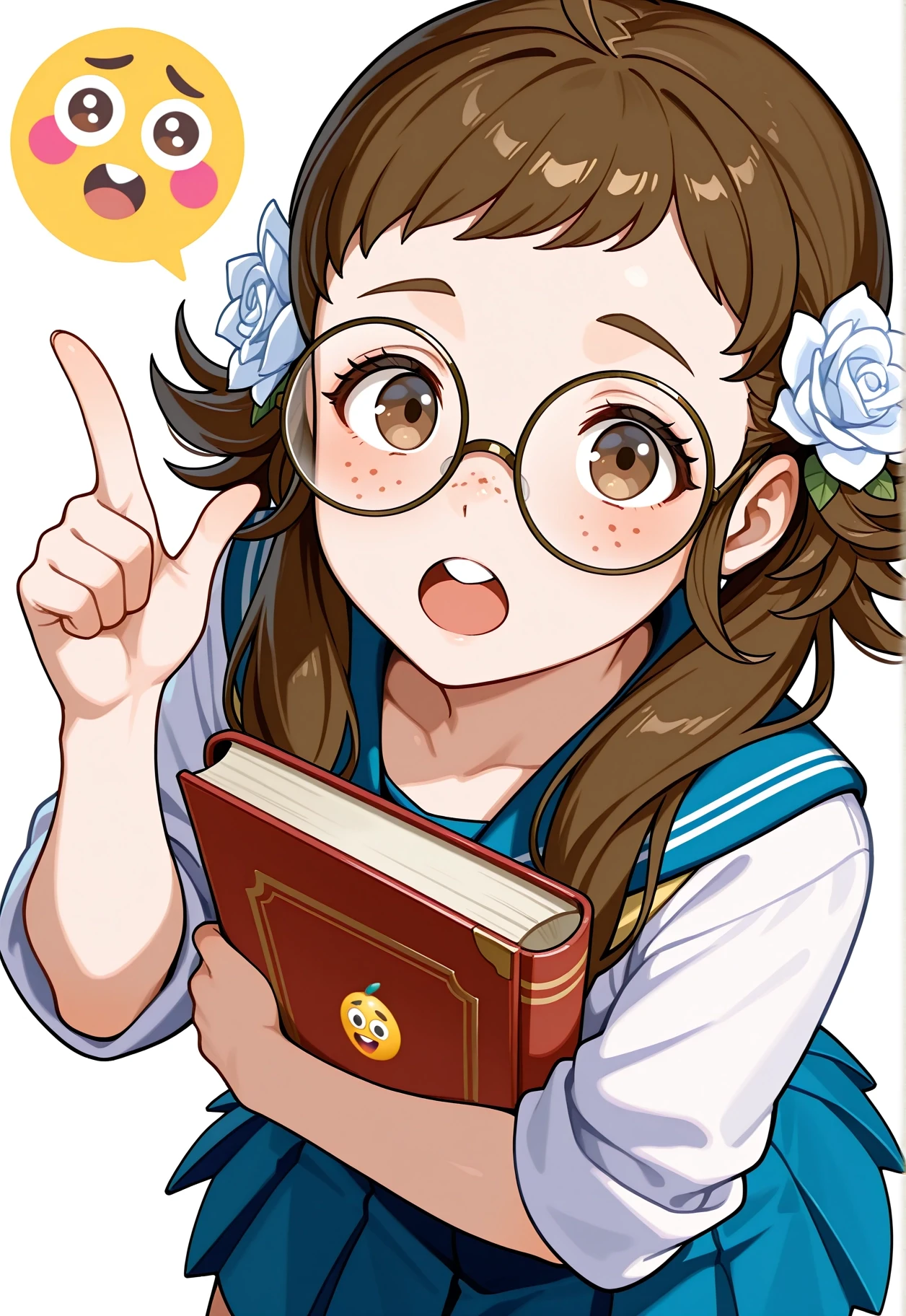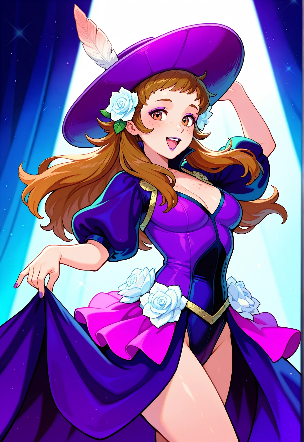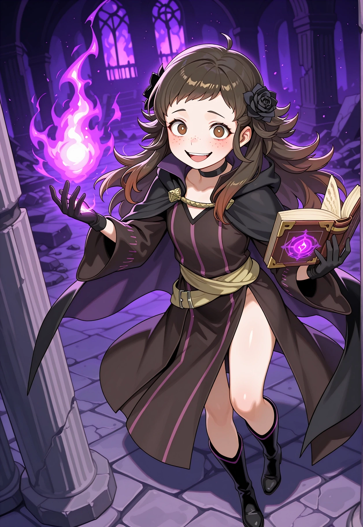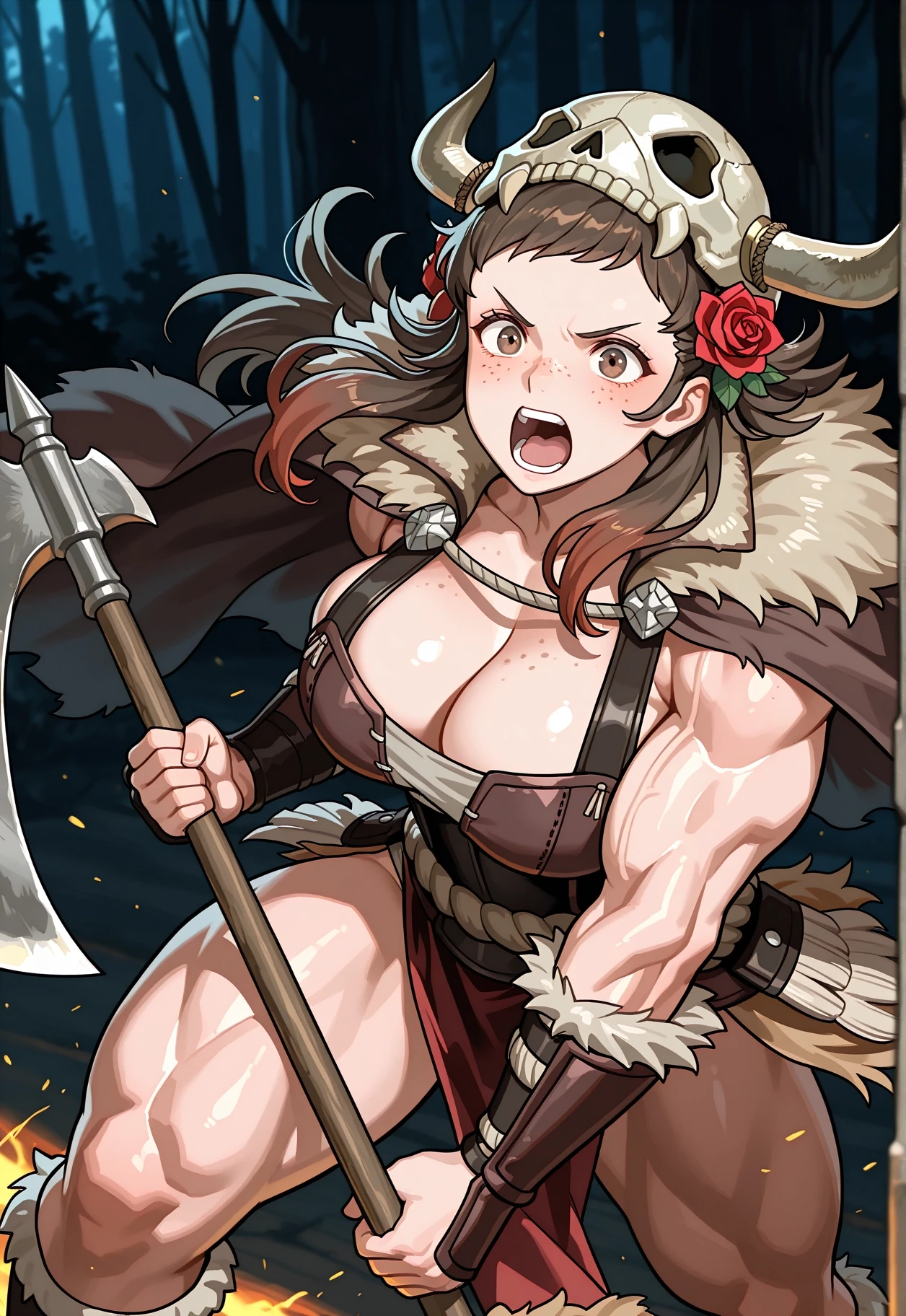 Mozu \(Fire Emblem\), Brown hair, flower in hair, white rose in hair, hair ornament, white flower, brown eyes, brown tunic, brown cape, green cape, white skirt, brown boots, long hair, sidelocks, freckles, white belt, long sleeves, gauntlets,To aid with changing her outfit, lower the Lora weight + activation text weight.