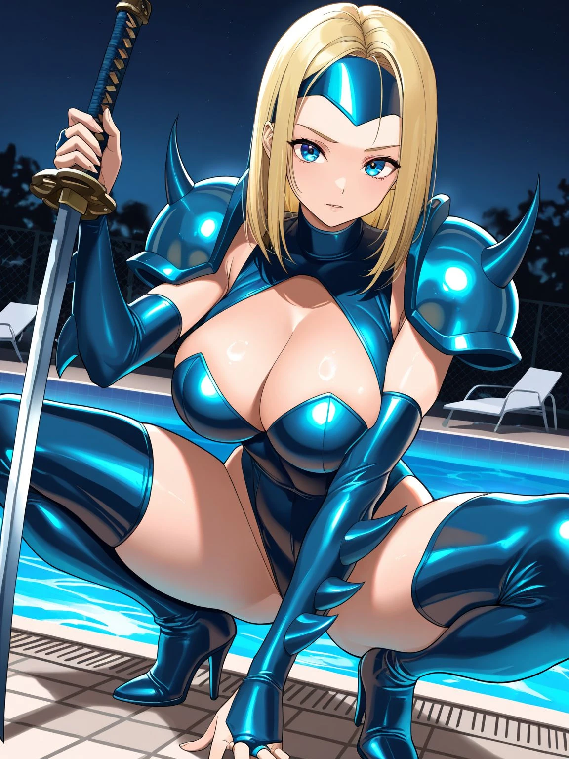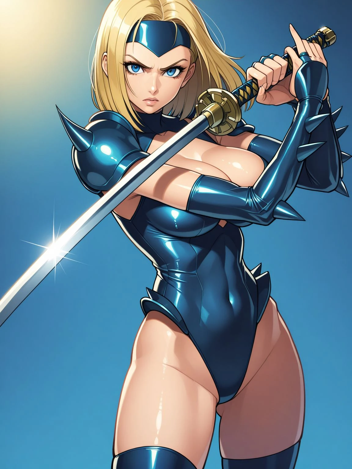 forehead protector,leotard,highleg,highleg leotard,blue leotard,skin tight,shiny clothes,shiny,cleavage cutout,cleavage,spikes,boots,high heels,high heel boots,thigh boots,blue footwear,detached sleeves,shoulder armor,armor,shoulder spikes,shoulder pads,bridal gauntlets