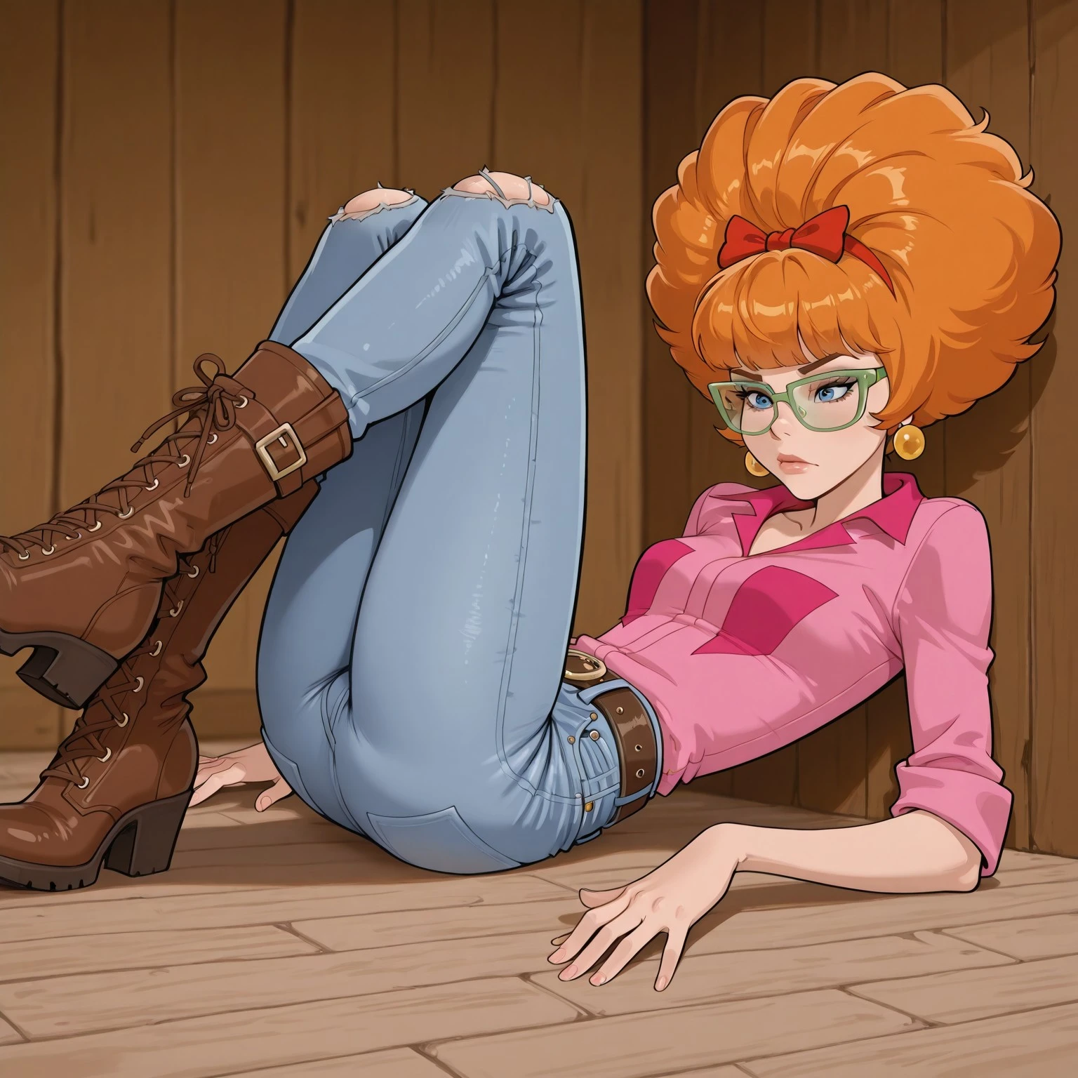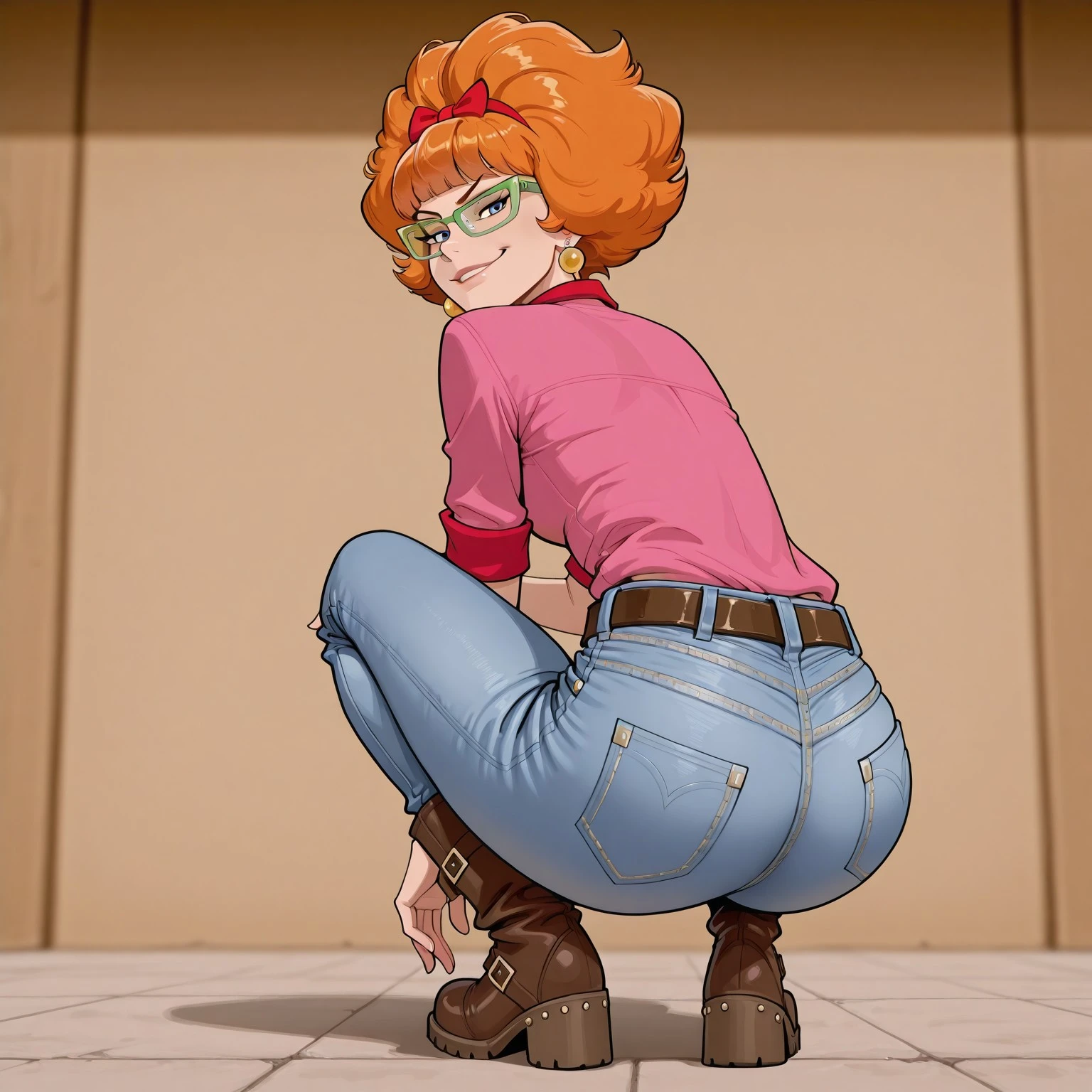 1girl,solo,orange hair,big hair,bangs,short hair,hair bow,earrings,glasses,blue eyes,shirt,belt,jeans,boots