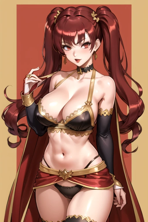 ElderMagusBianca, 1girl, solo, very long hair, large breasts, red eyes, red thighhighs, navel, cleavage, bare shoulders, twintails, jewelry, collarbone, red hair, earrings, choker, midriff, belt, black bra, black panties, red lips, waist cape, bridal gauntlets