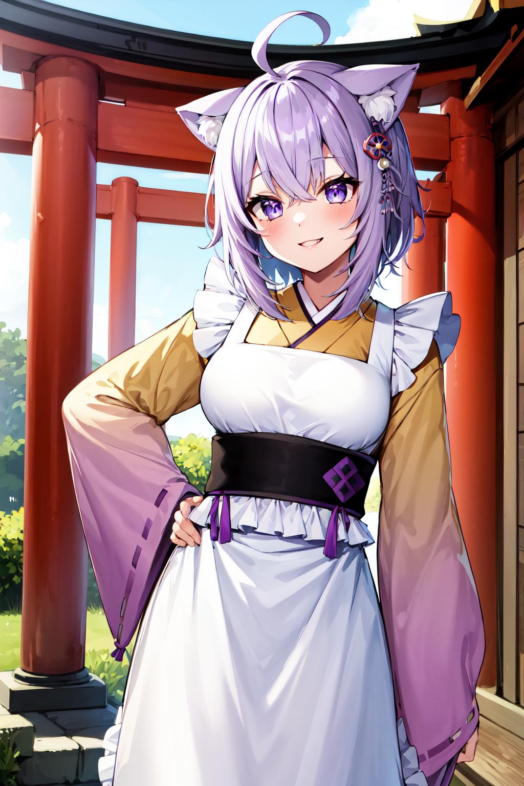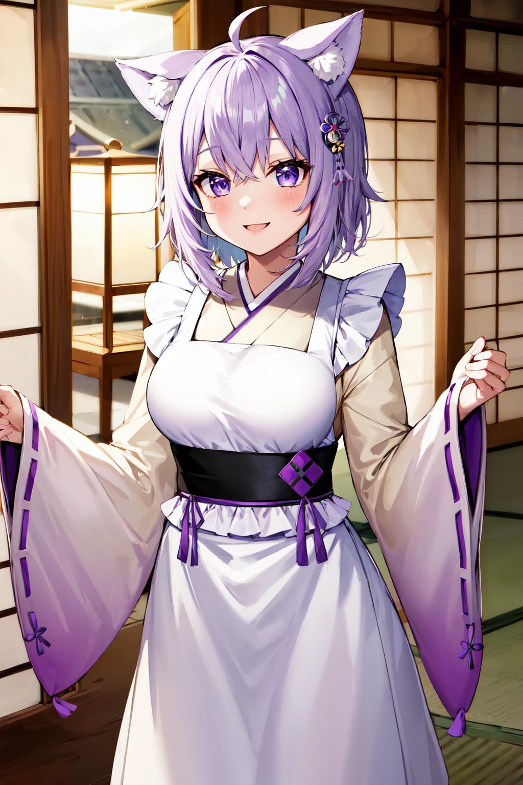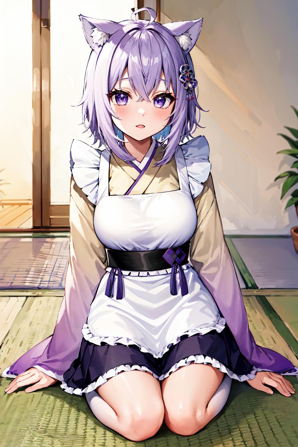 outfit3aaokayu, short hair, ahoge, animal ears, hair ornament, cat tail, ribbon trim, japanese clothes, white kimono, white apron, frilled apron, sash, obi, purple skirt