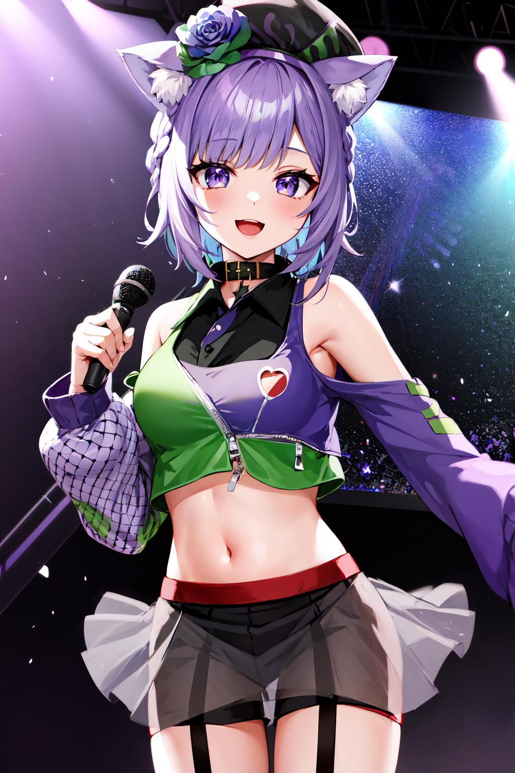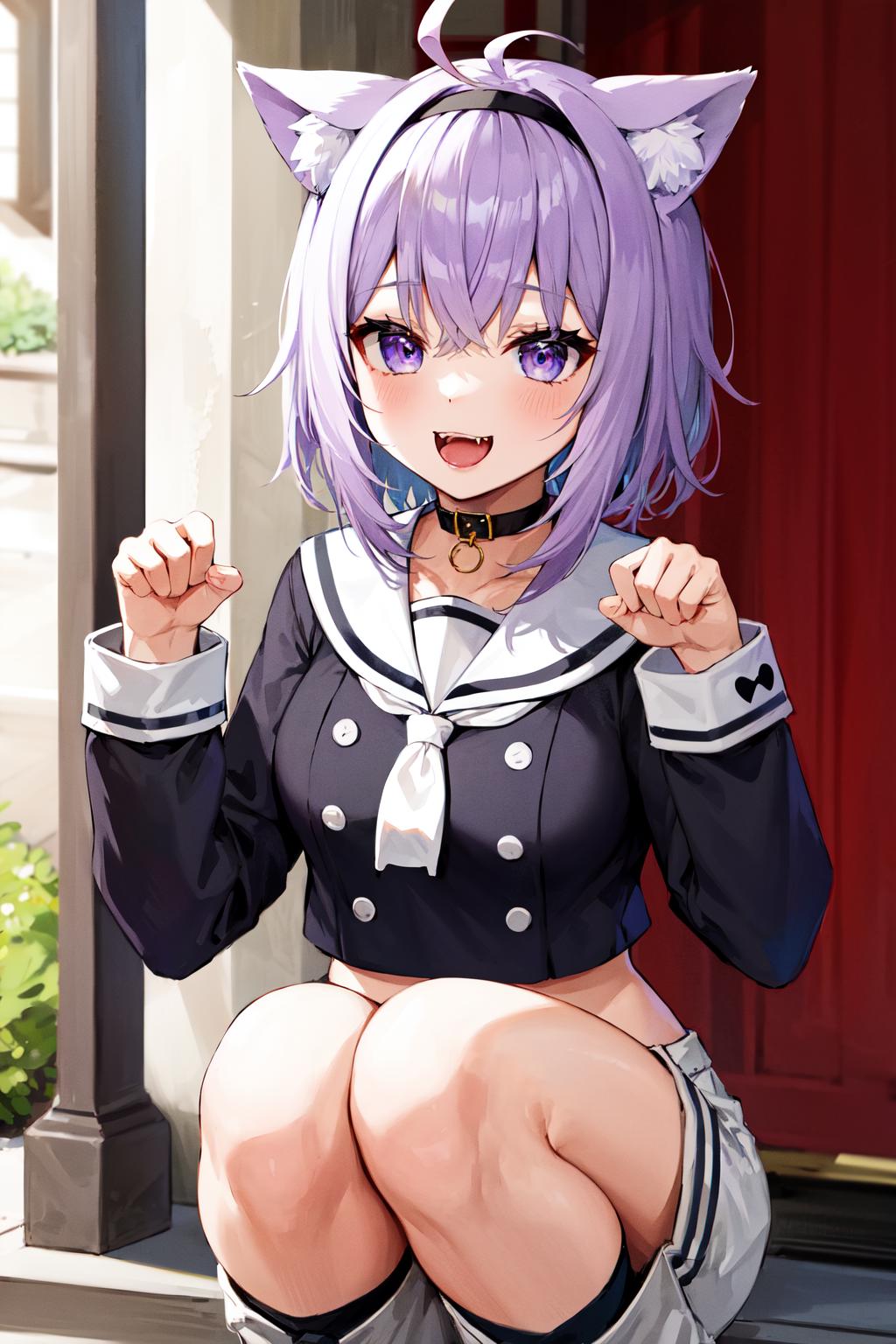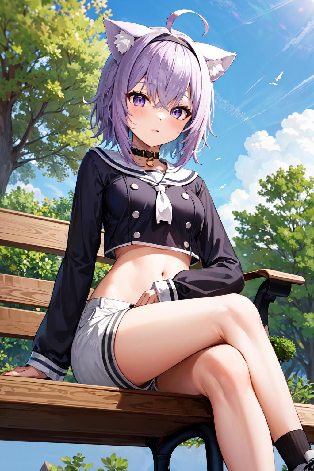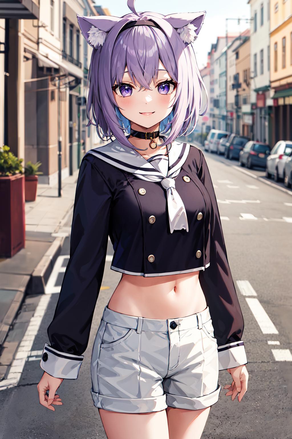 outfit2aaokayu, short hair, purple hair, ahoge, black hairband, animal ears, cat tail, sailor collar, neckerchief, black shirt, midriff, button, white shorts