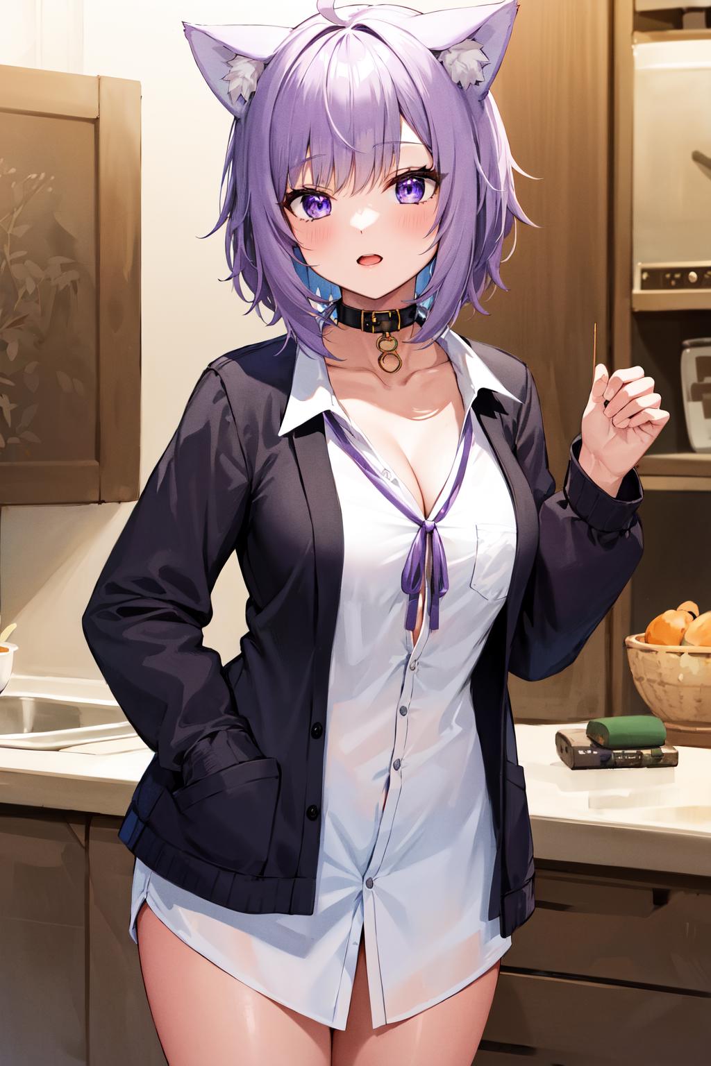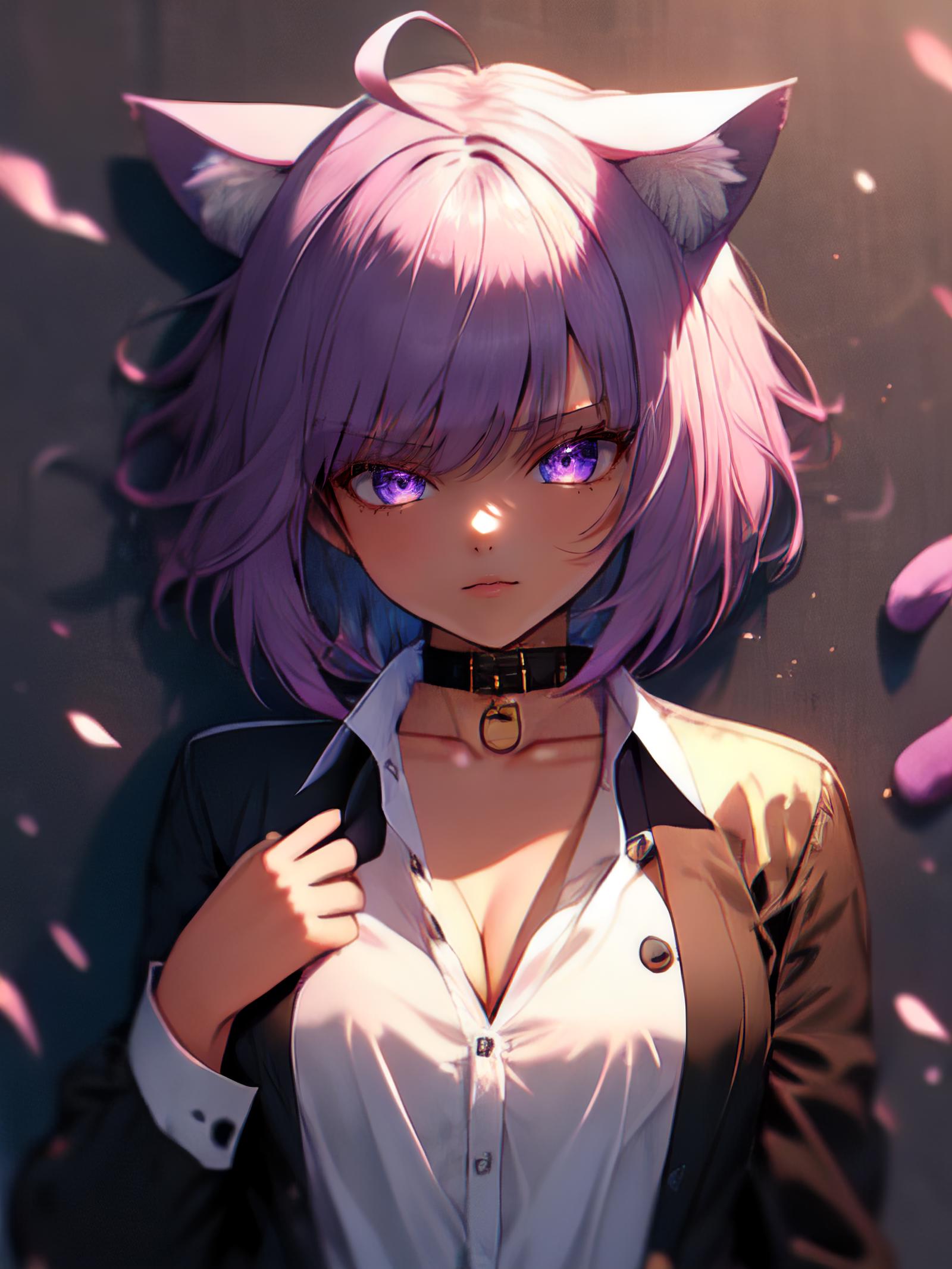 outfit4aaokayu, short hair, ahoge, animal ears, cat tail, black collar, neck ribbon, purple ribbon, collarbone, cleavage, dress shirt, collared shirt, button gap, black jacket, open clothes