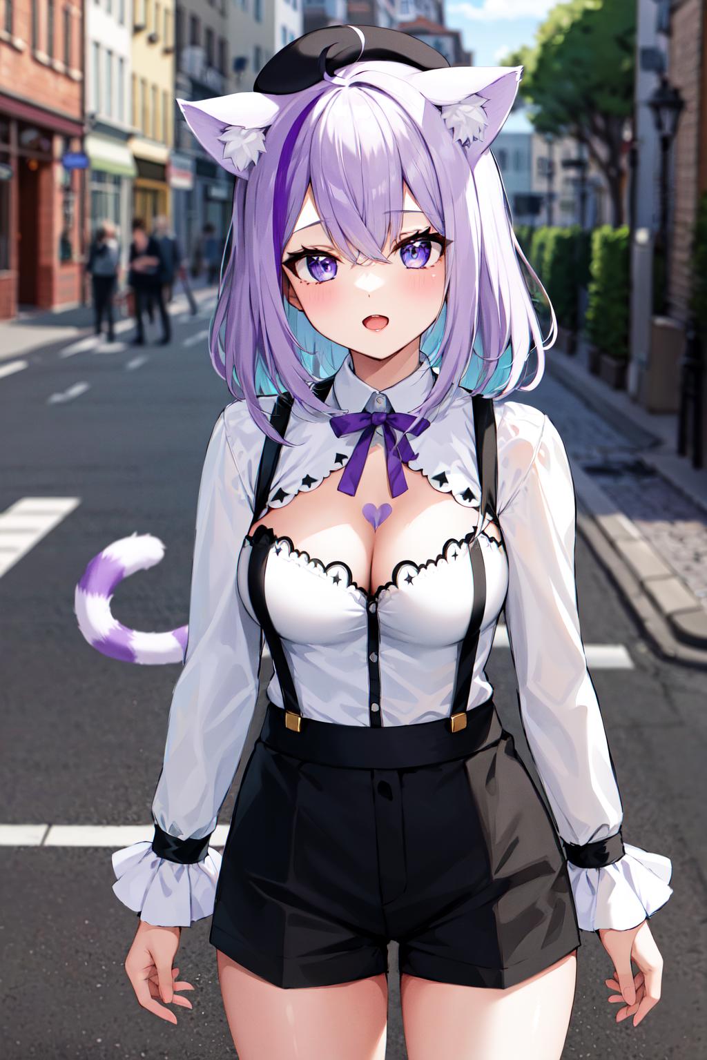 outfit6aaokayu, medium hair, multicolored hair, streaked hair, animal ears, beret, cat tail, neck ribbon, purple ribbon, cleavage cutout, white shirt, suspender shorts, black shorts