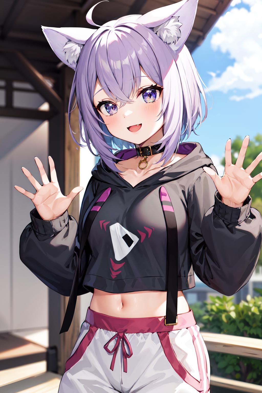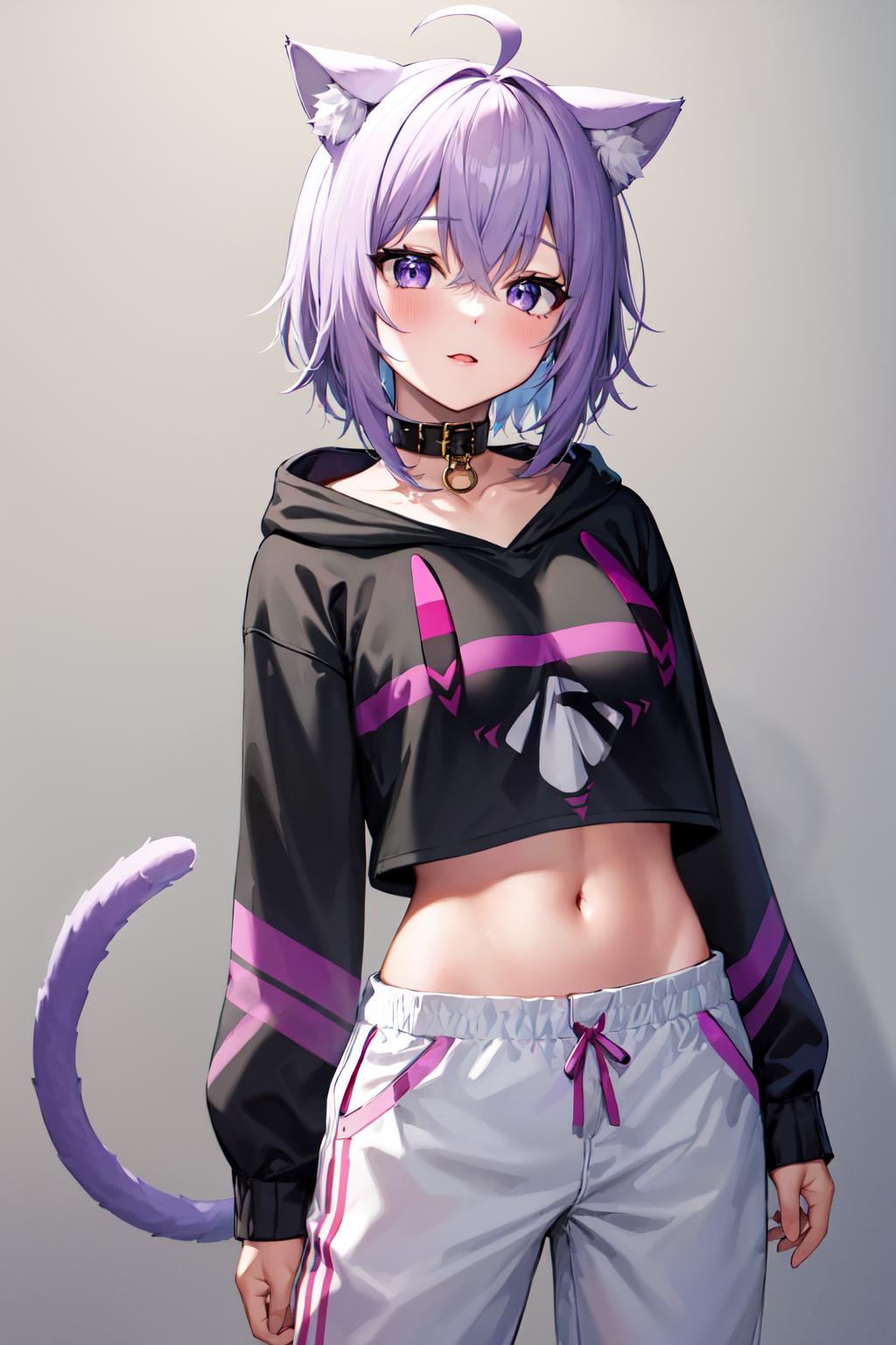 outfit1aaokayu, short hair, ahoge, animal ears, cat tail, animal collar, black collar, collarbone, print hoodie, black hoodie, long sleeves, midriff, white pants