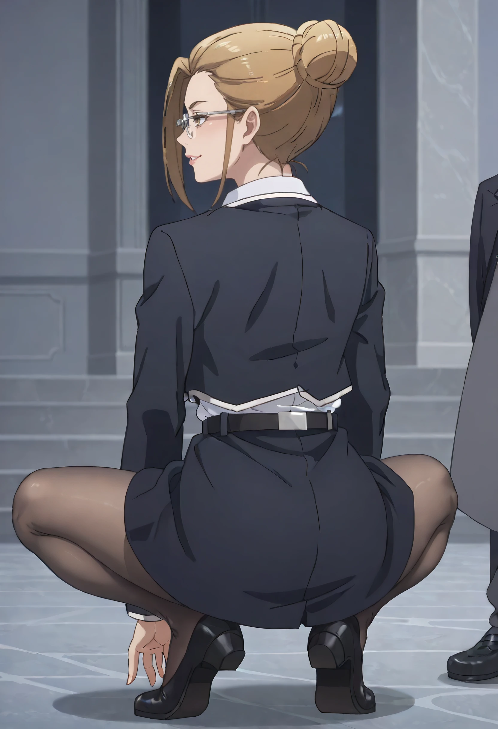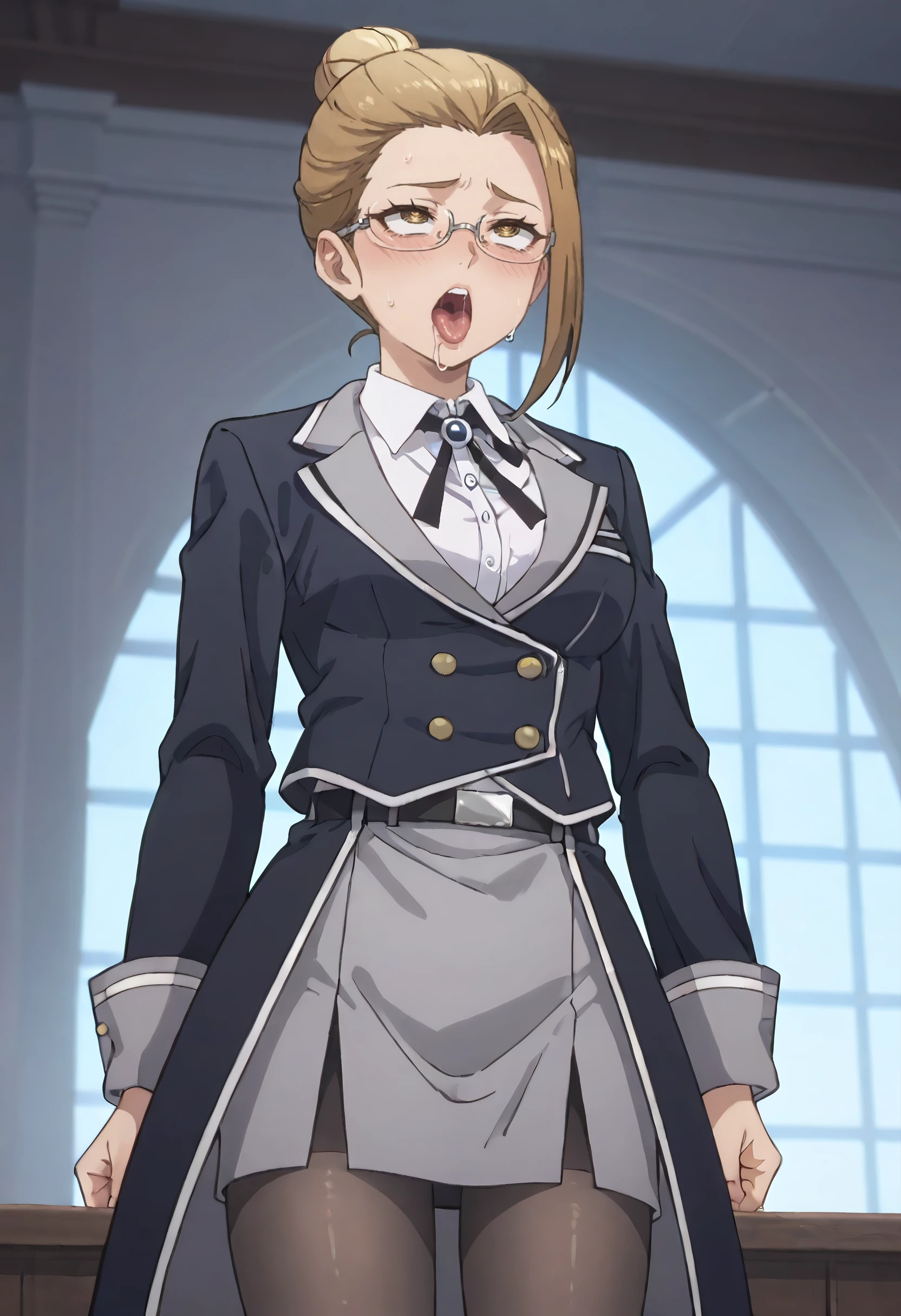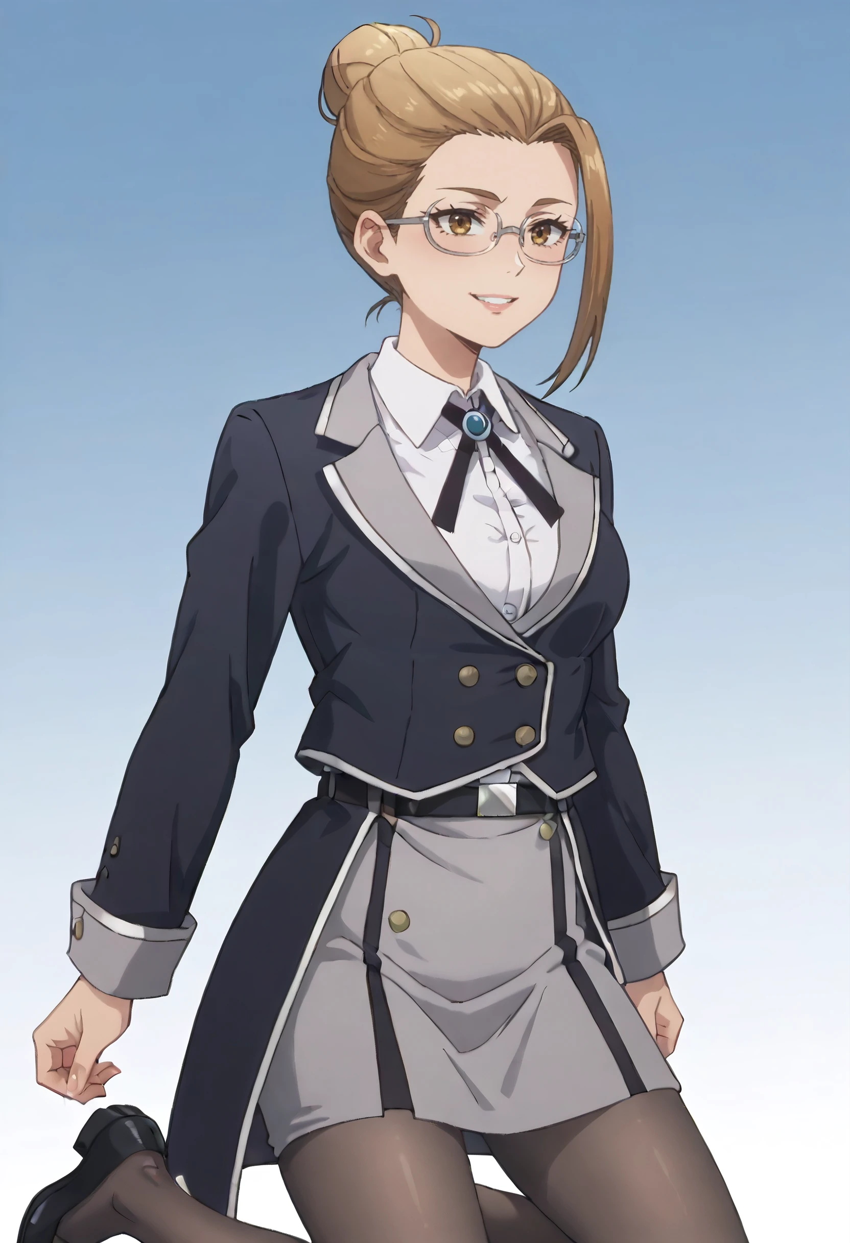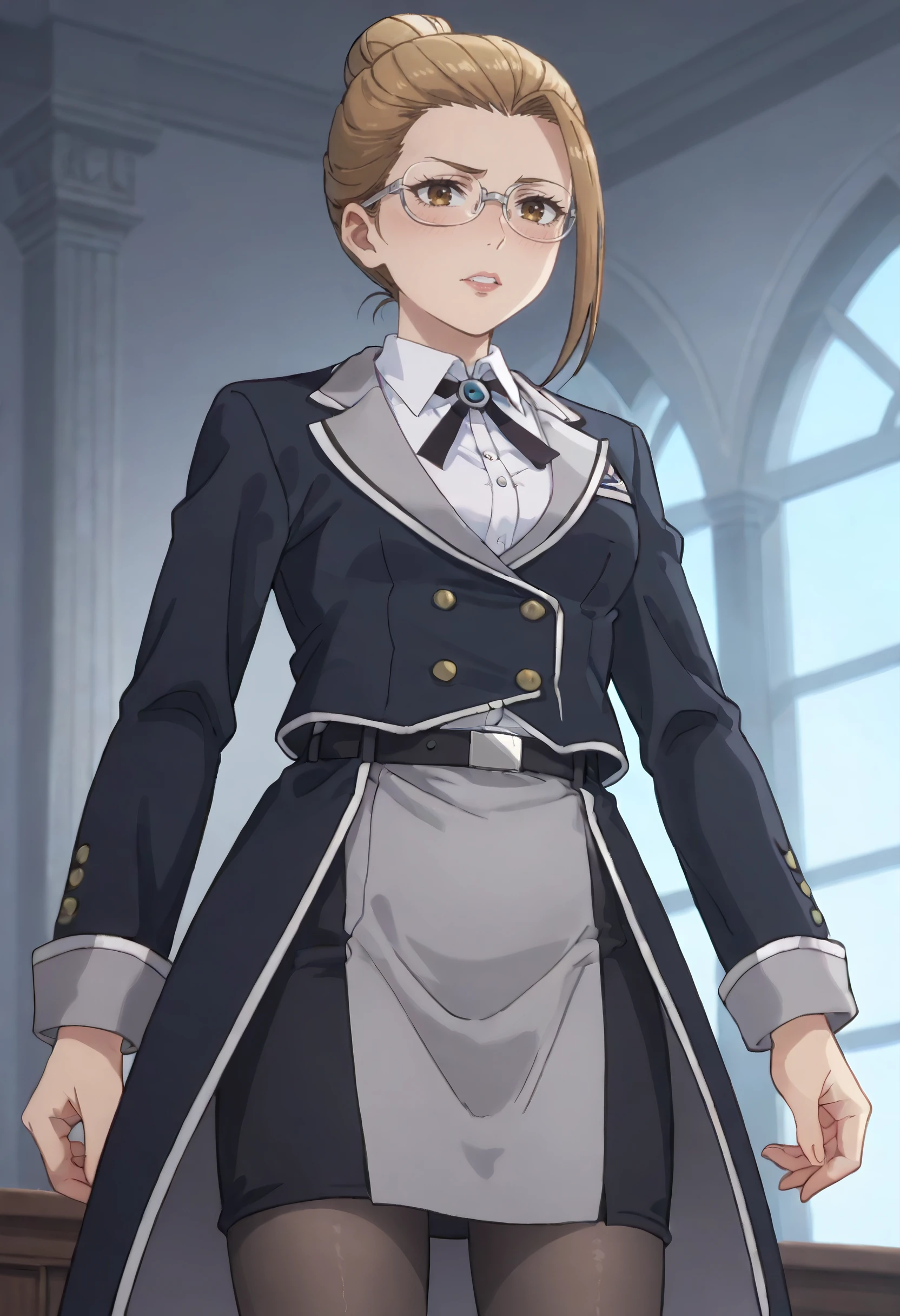 long sleeves, shirt, jacket, collared shirt, white shirt, skirt, neck ribbon, ribbon, formal, black jacket, blazer, wing collar, uniform, buttons, belt, grey skirt, pantyhose, black legwear,