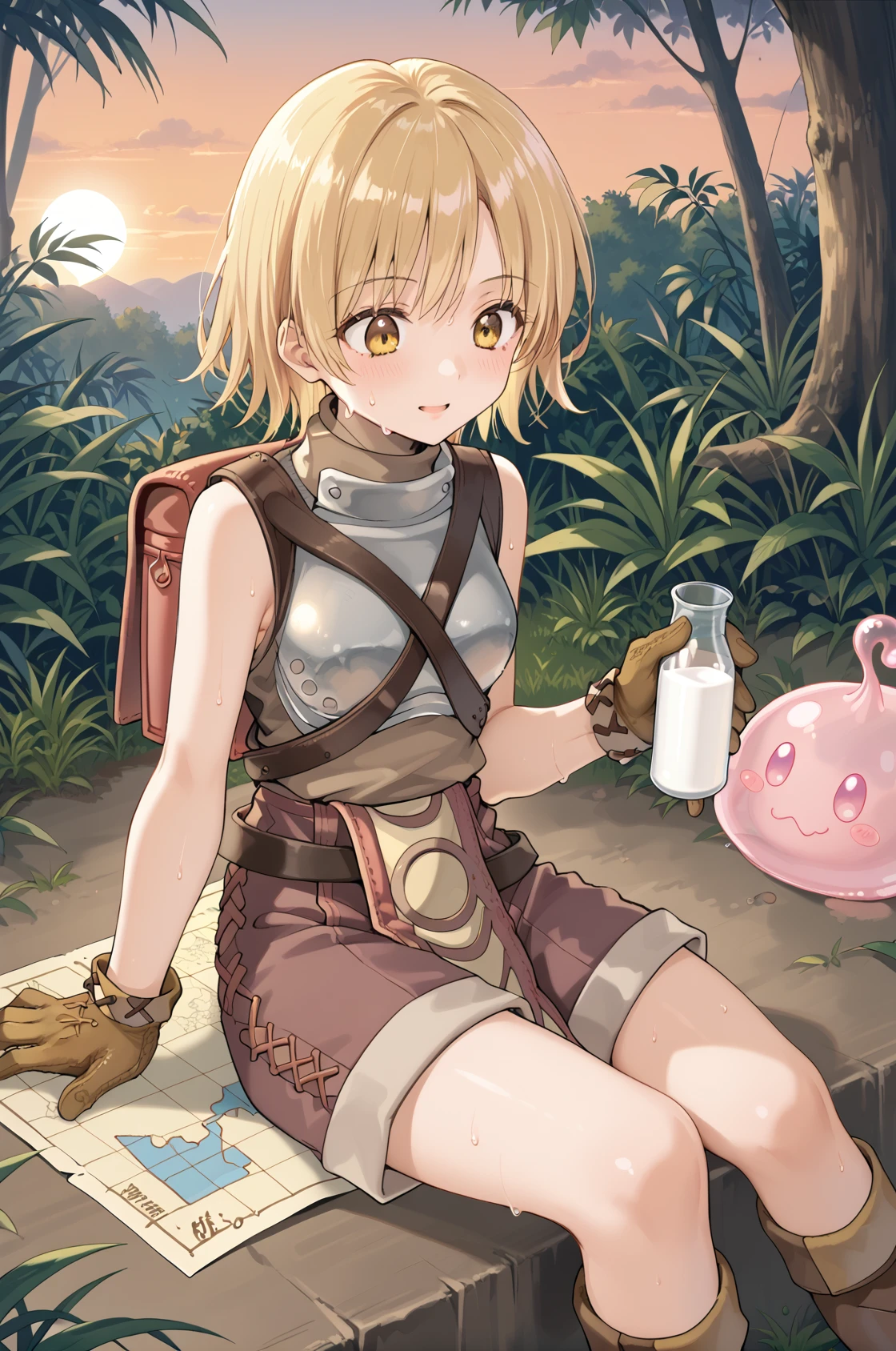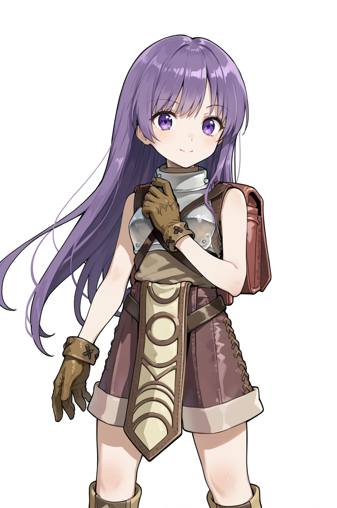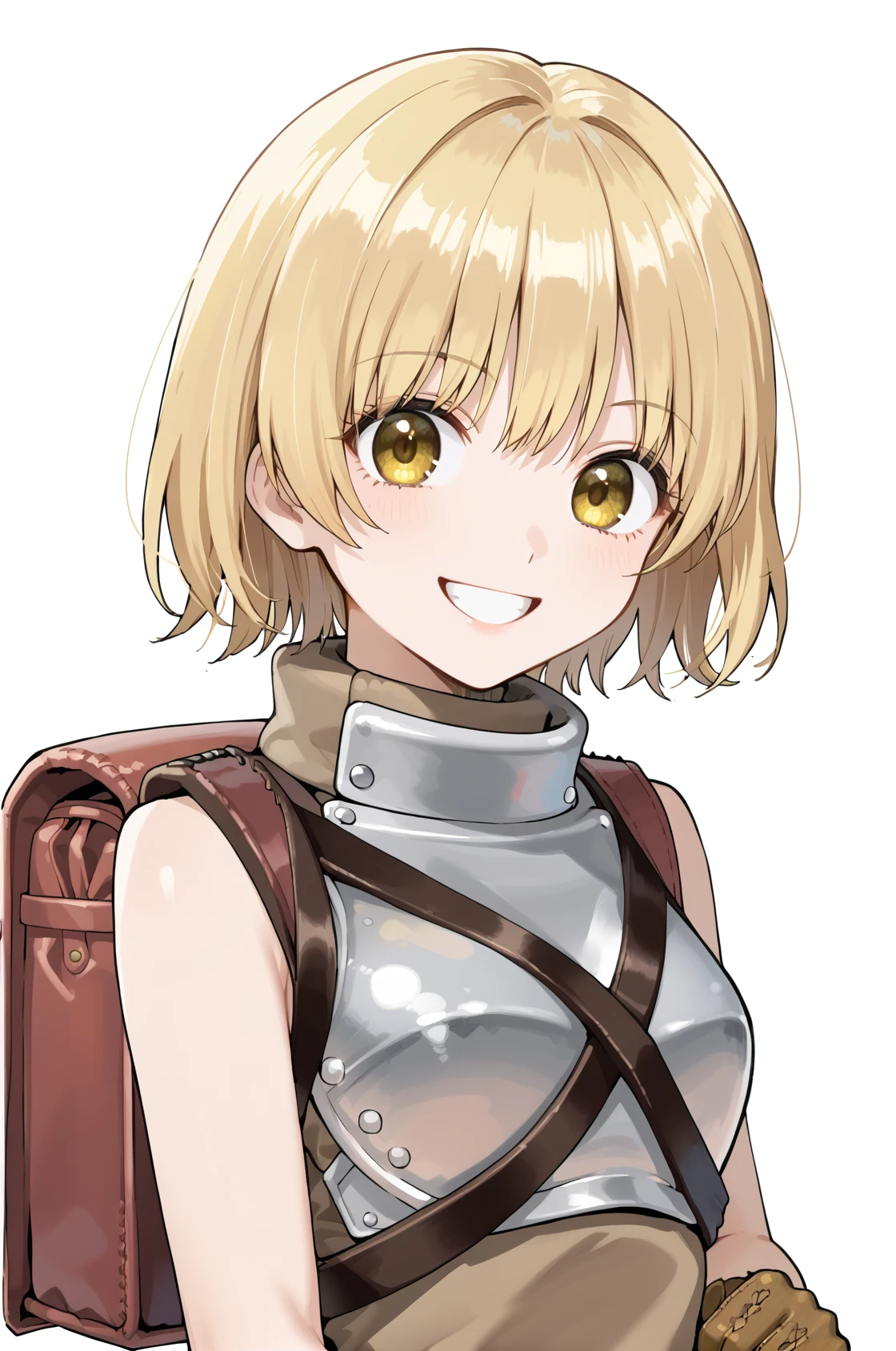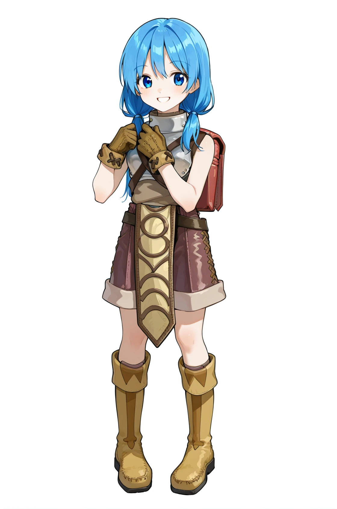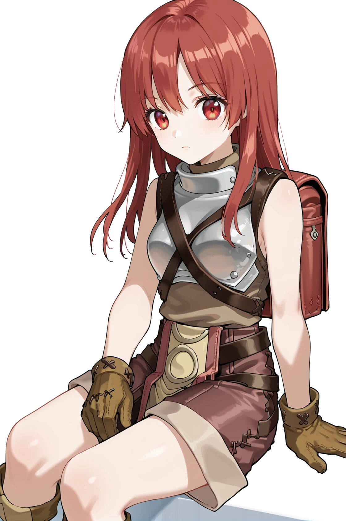 noviceRO, bag, backpack, breastplate, sleeveless, brown shirt, turtleneck, pelvic curtain, short shorts, leather gloves, knee boots
