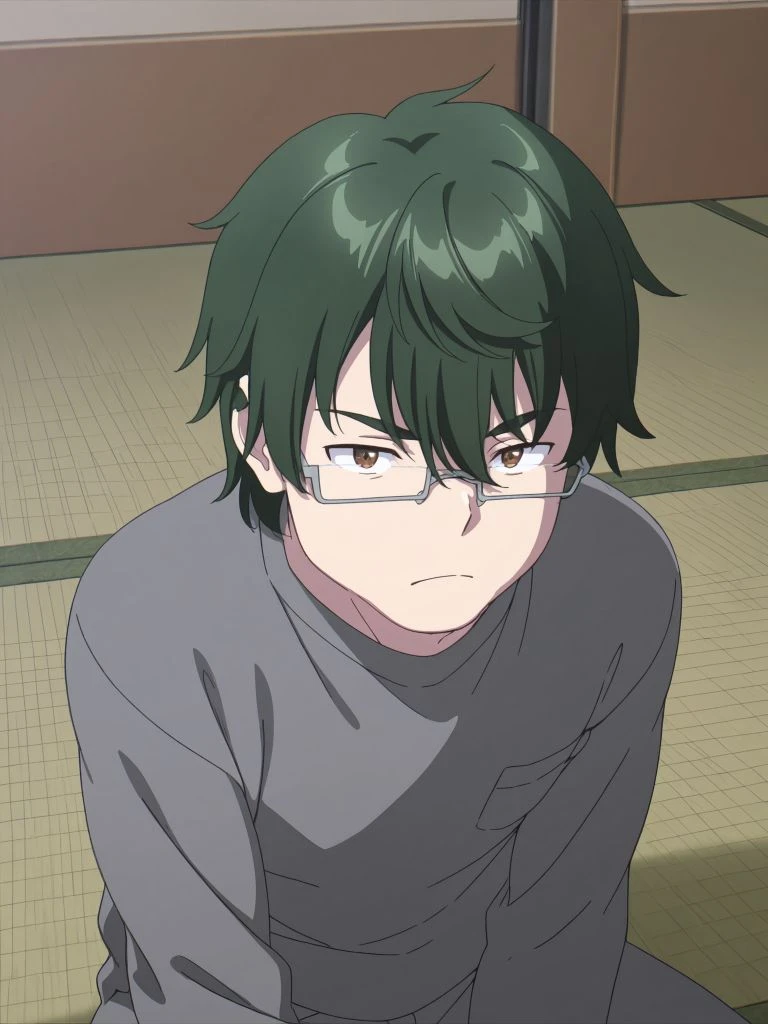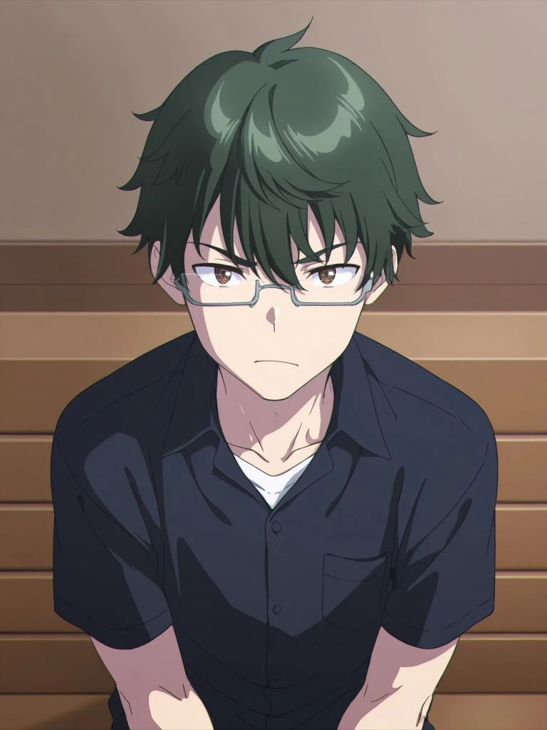 kenta yamazaki,male focus,he has glasses,semi-rimless eyewear, green hair, brown eyes,