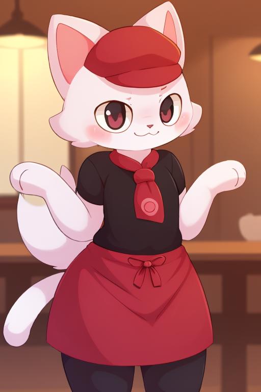 Pokémon Café Mix uniform prompt: red neckerchief, red apron, cabbie hat, red headwear.