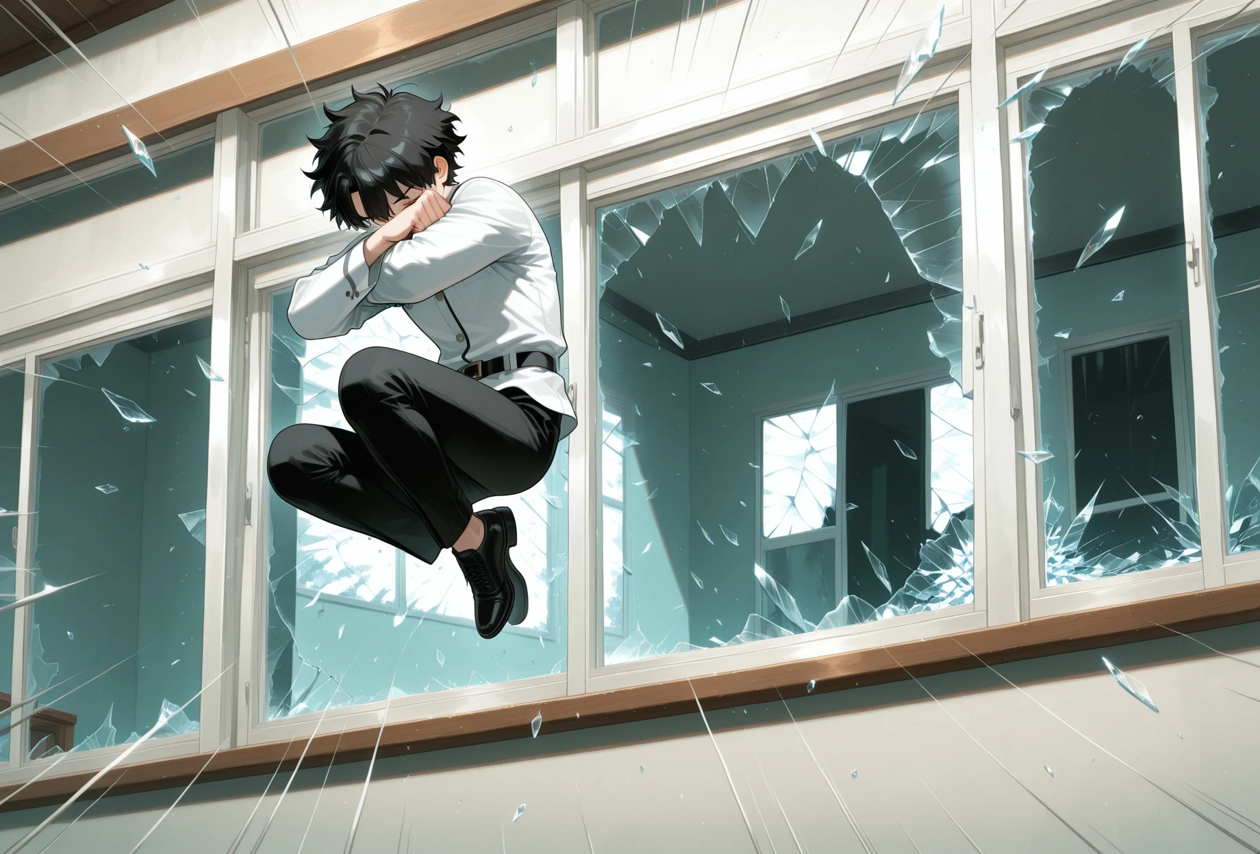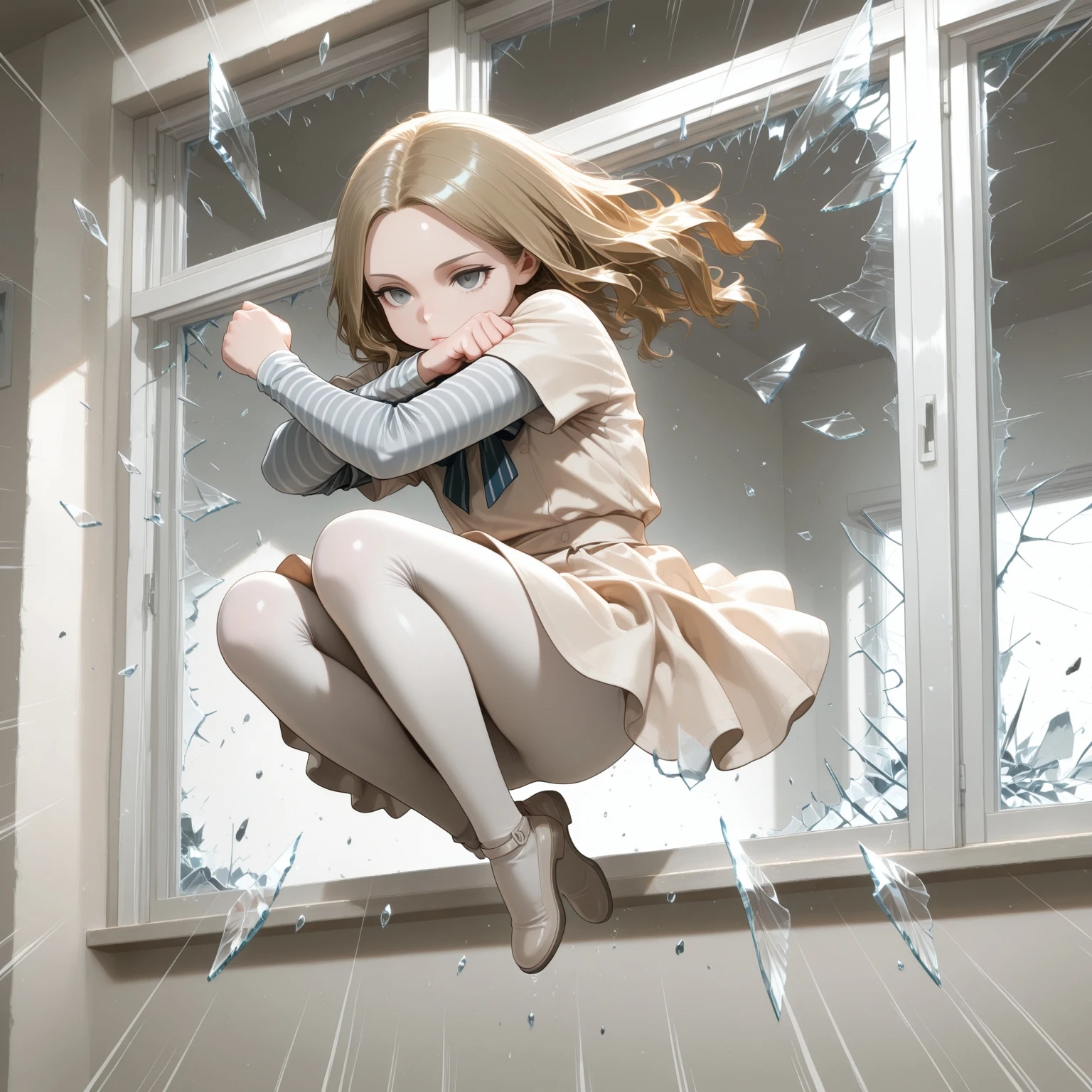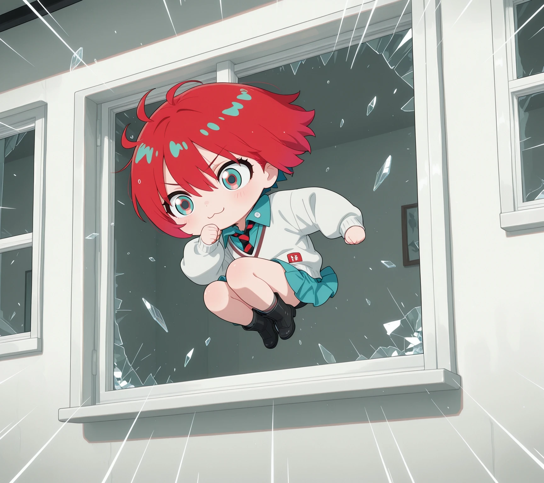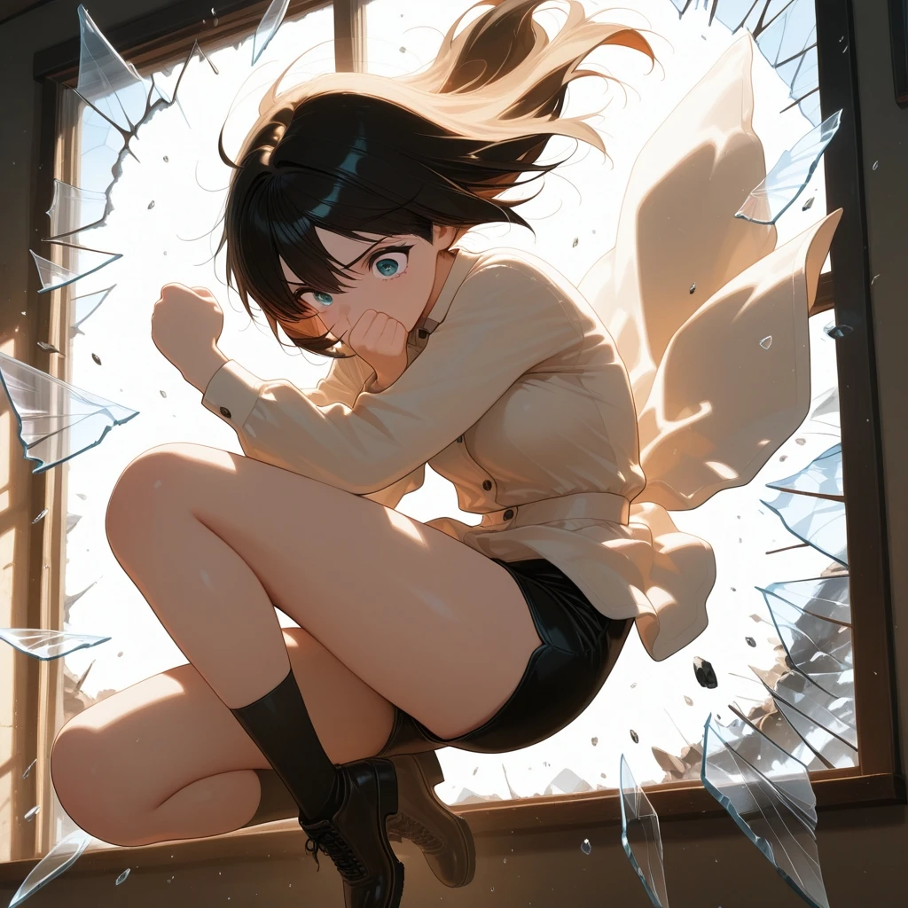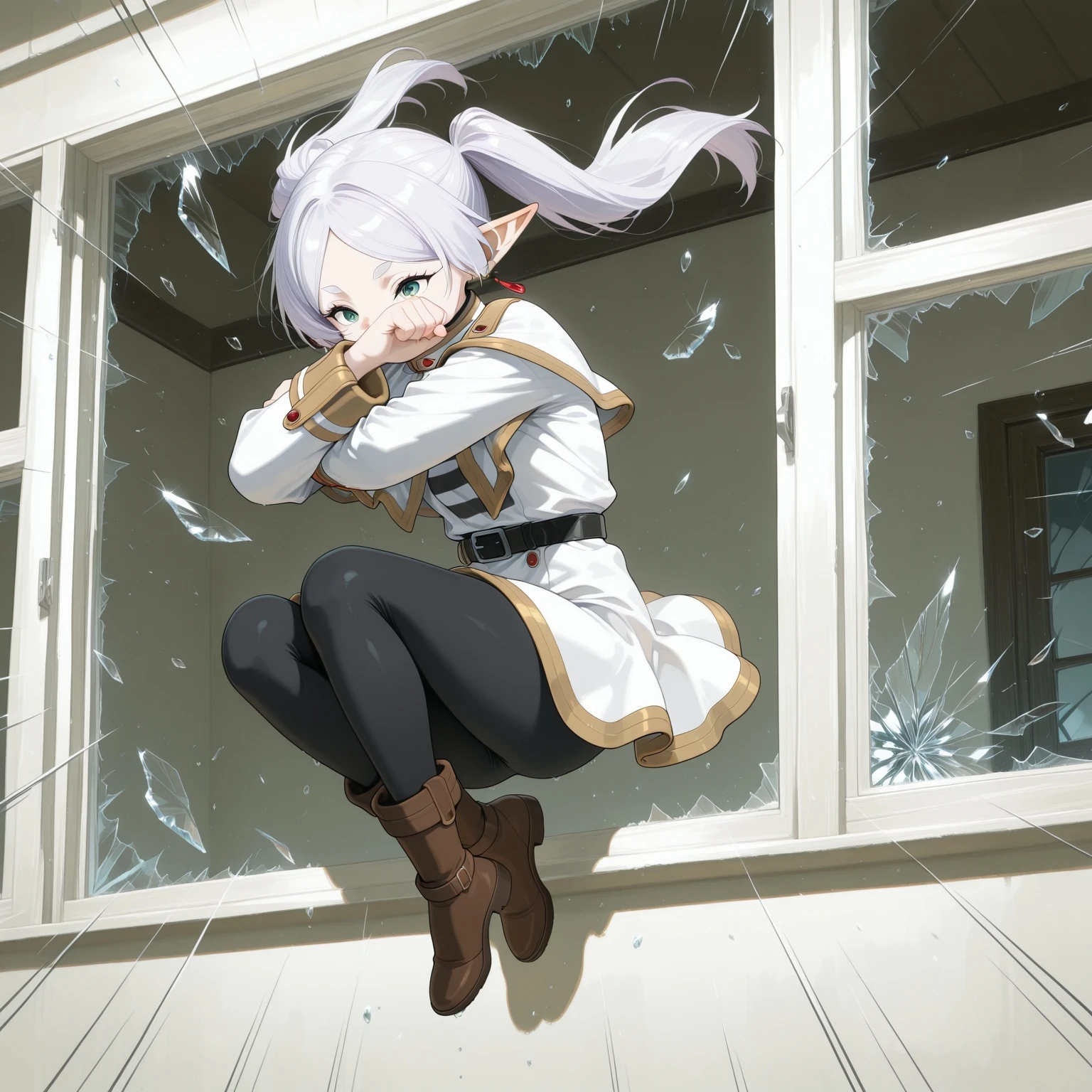 break_the_glass,jumping,midair,room, emphasis lines,crossed arms