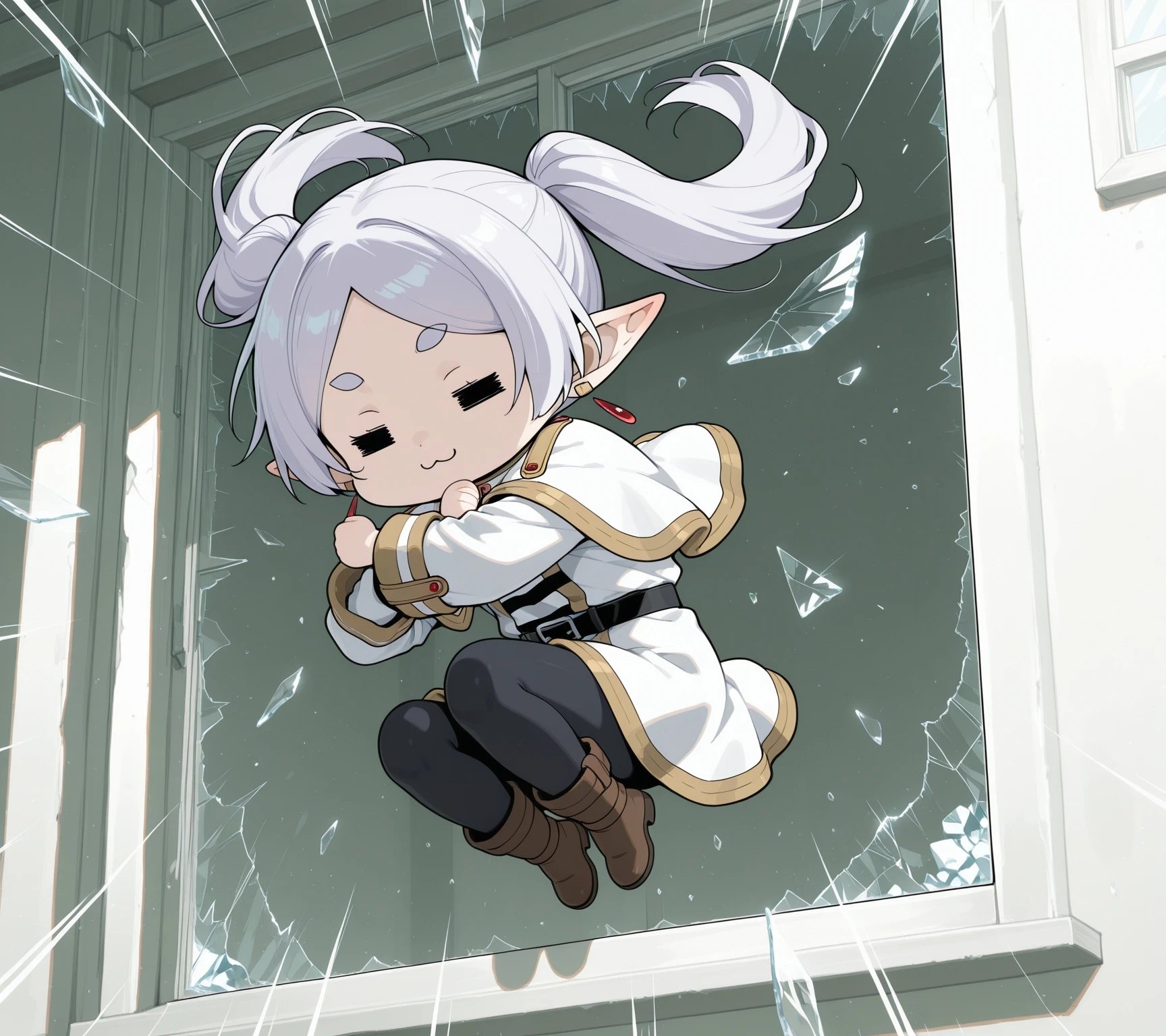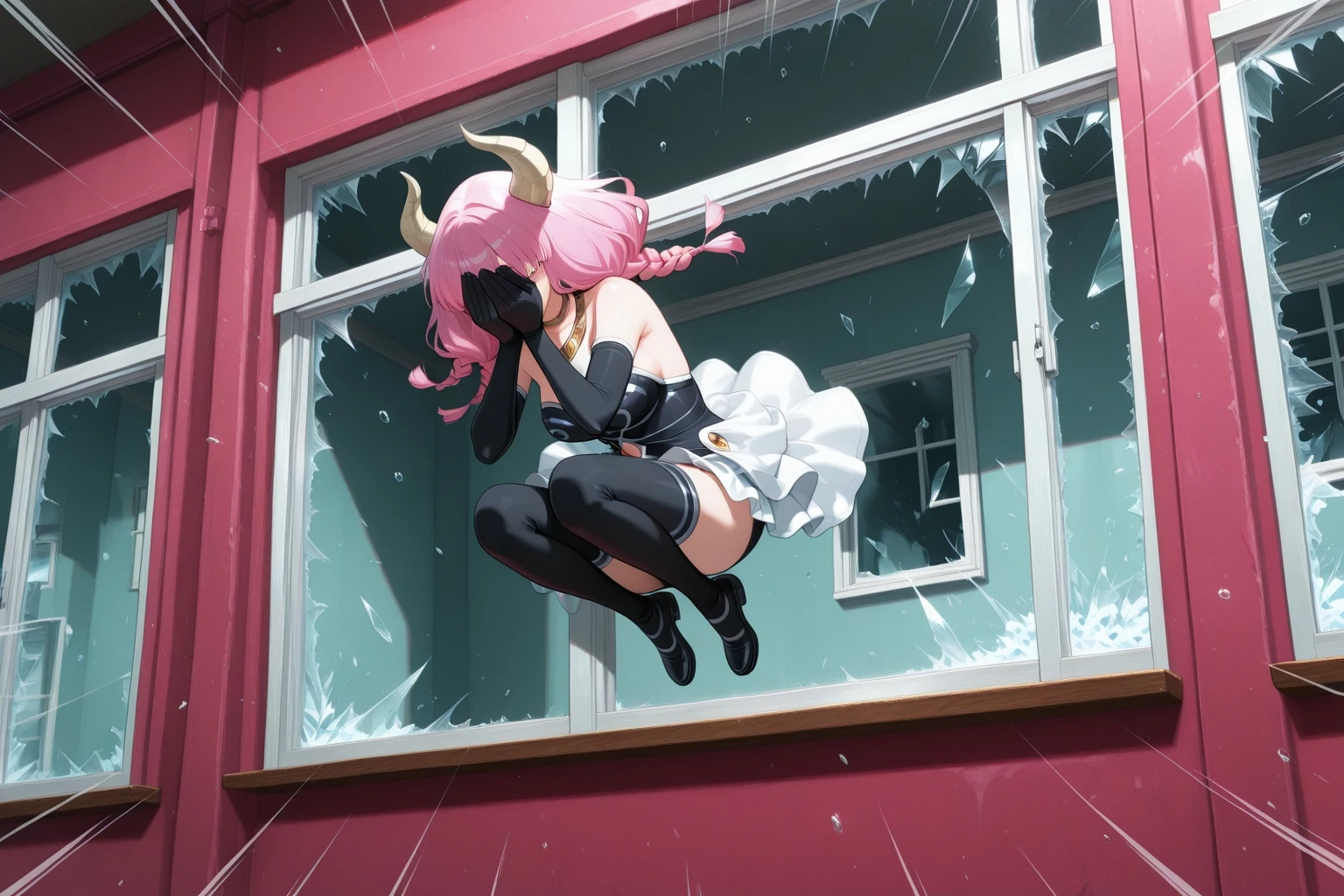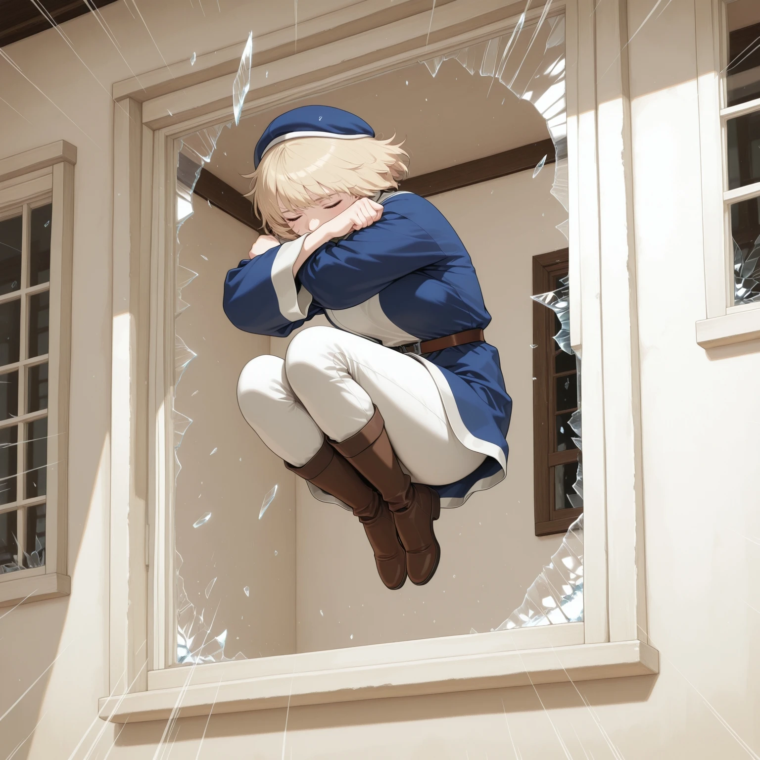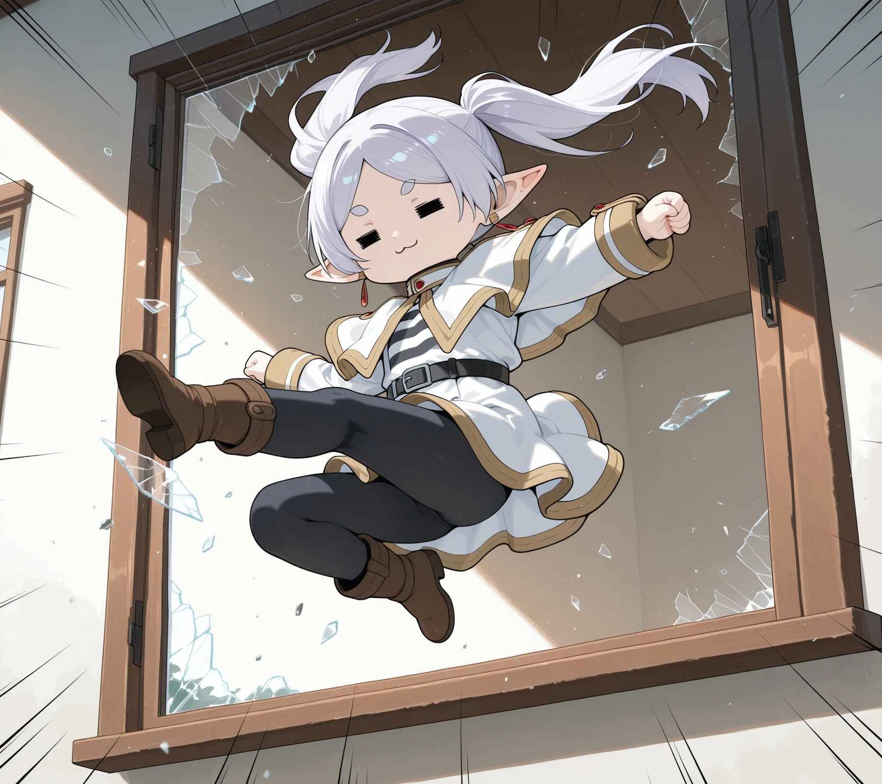 break_the_glass,jumping,midair,room, emphasis lines,crossed arms