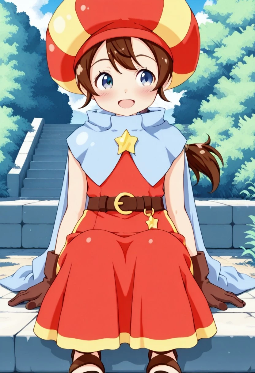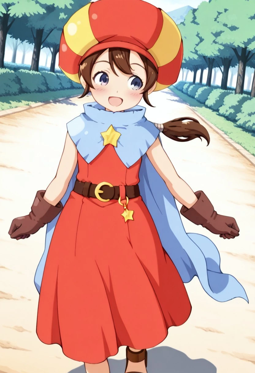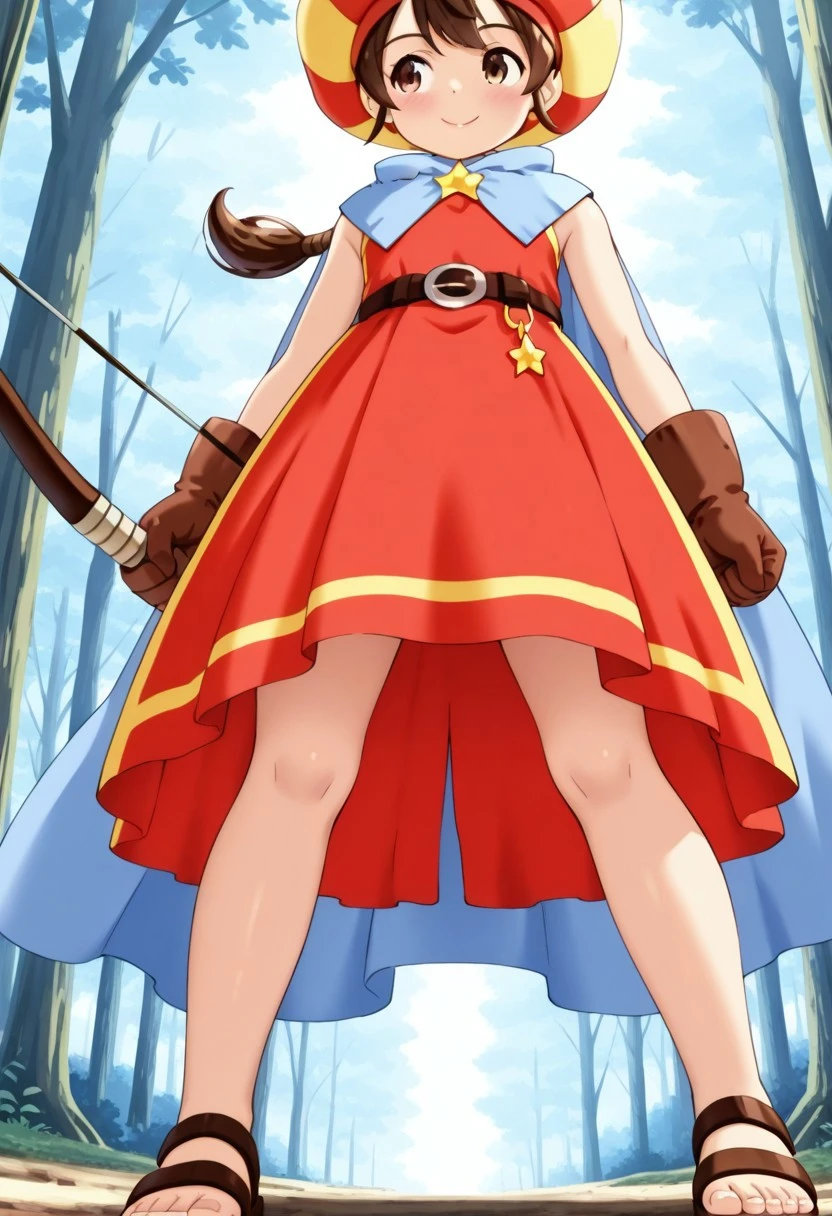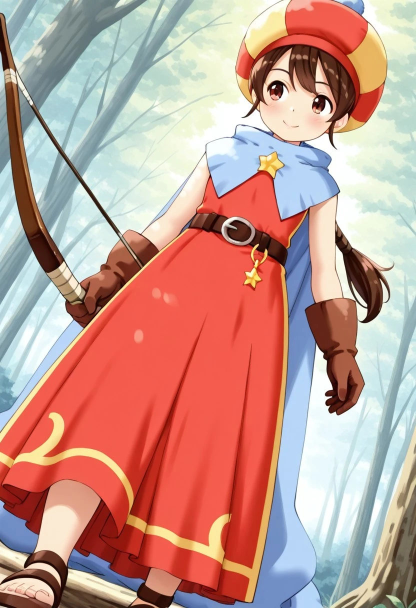 基本プロンプト:Tokia_DMO, 1girl, gloves, brown hair, ponytail,red yellow hat, star \(symbol\), cape, sleeveless,red dress, long dress,belt, Sandals, Bows and arrows,