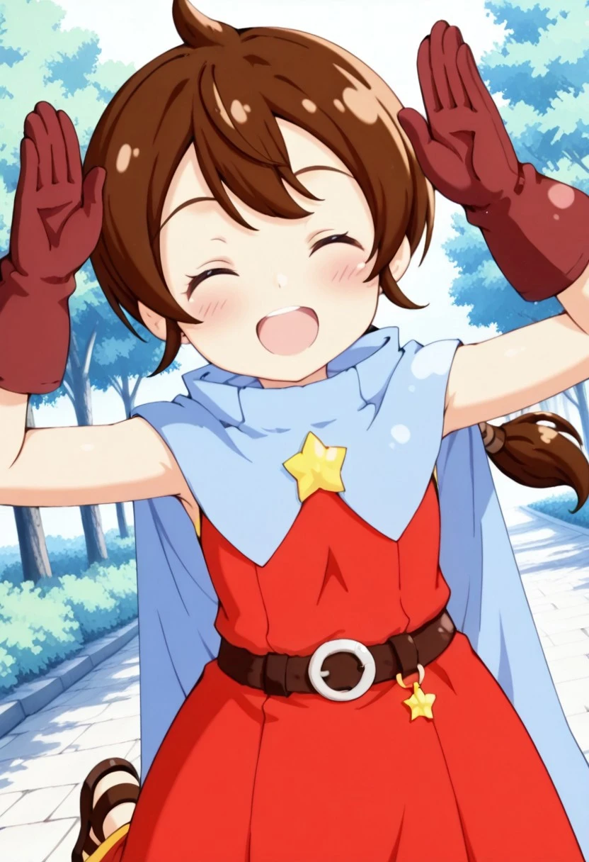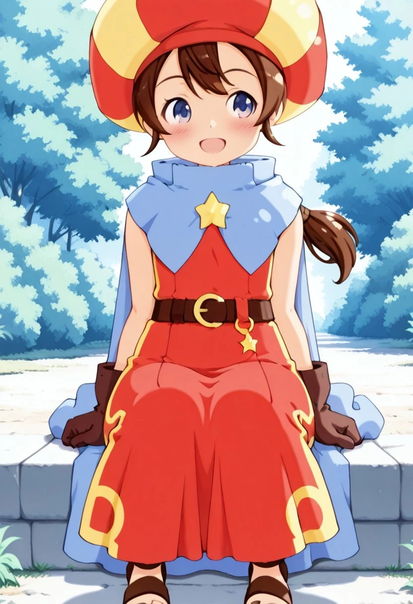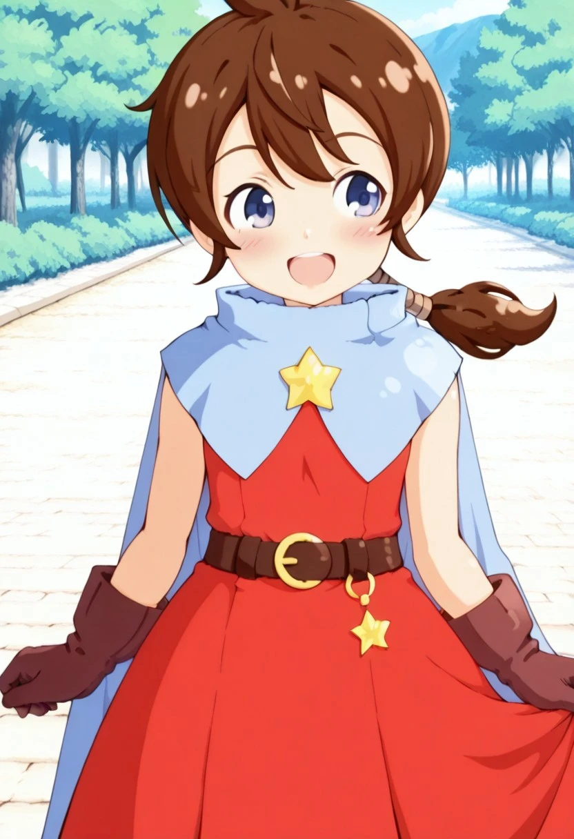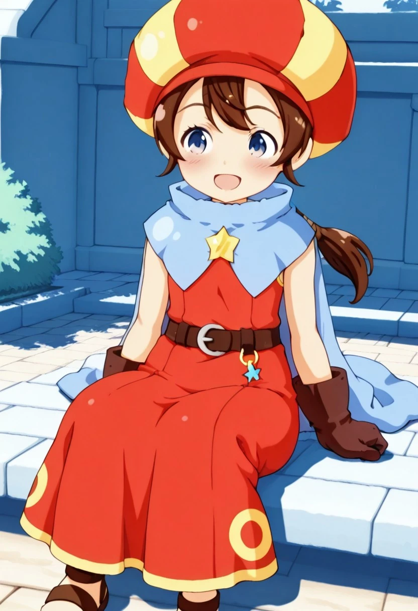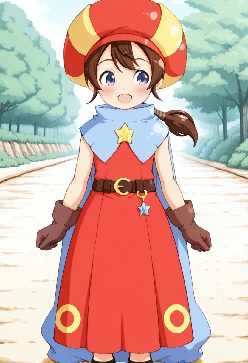 基本プロンプト:Tokia_DMO, 1girl, gloves, brown hair, ponytail,red yellow hat, star \(symbol\), cape, sleeveless,red dress, long dress,belt, Sandals, Bows and arrows,